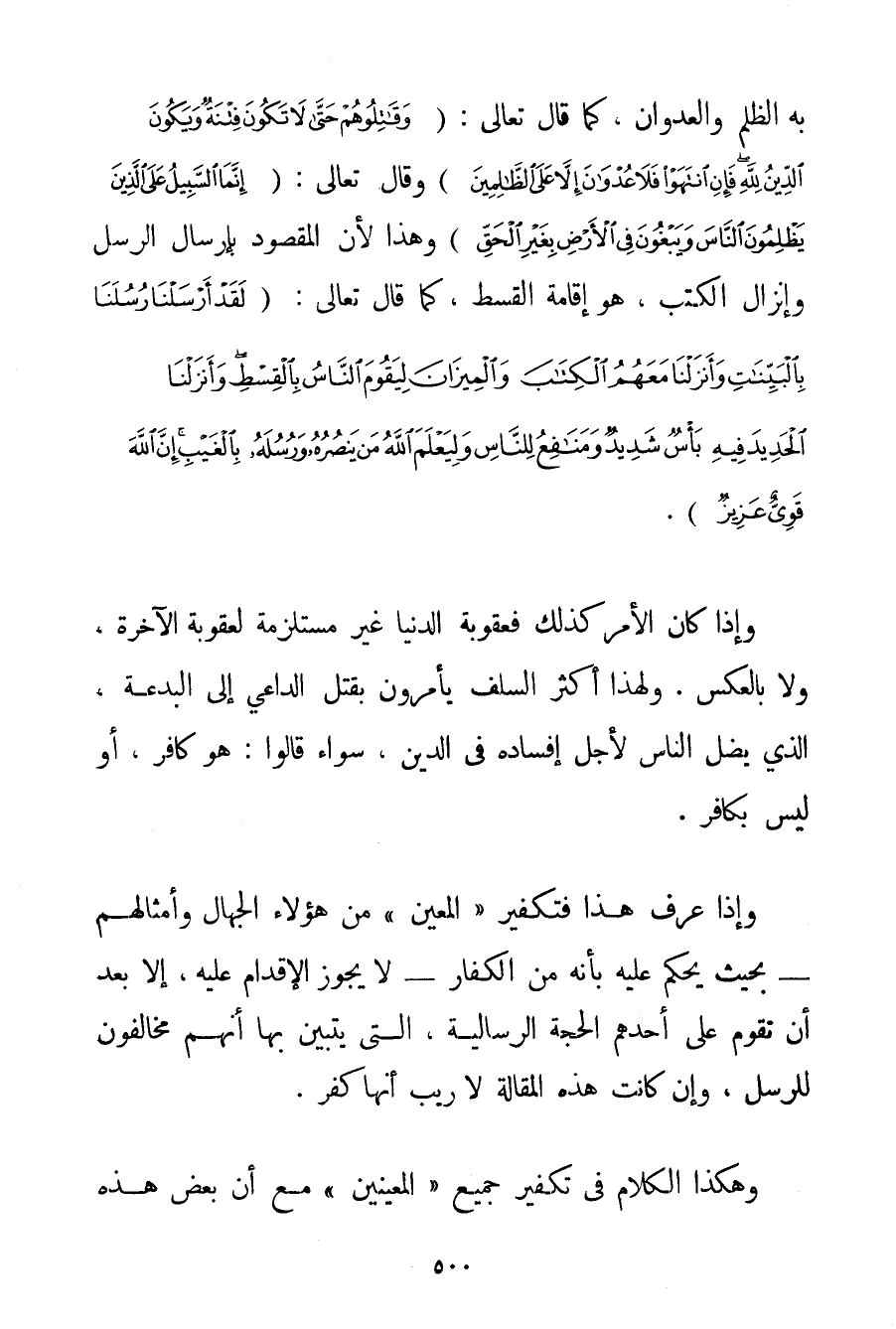 بِهِ الظُّلْمُ وَالْعُدْوَانُ كَمَا قَالَ تَعَالَى: {وَقَاتِلُوهُمْ حَتَّى لَا تَكُونَ فِتْنَةٌ وَيَكُونَ الدِّينُ لِلَّهِ فَإِنِ انْتَهَوْا فَلَا عُدْوَانَ إلَّا عَلَى الظَّالِمِينَ} وَقَالَ تَعَالَى: {إنَّمَا السَّبِيلُ عَلَى الَّذِينَ يَظْلِمُونَ النَّاسَ وَيَبْغُونَ فِي الْأَرْضِ بِغَيْرِ الْحَقِّ} وَهَذَا لِأَنَّ الْمَقْصُودَ بِإِرْسَالِ الرُّسُلِ وَإِنْزَالِ الْكُتُبِ هُوَ إقَامَةُ الْقِسْطِ كَمَا قَالَ تَعَالَى: {لَقَدْ أَرْسَلْنَا رُسُلَنَا بِالْبَيِّنَاتِ وَأَنْزَلْنَا مَعَهُمُ الْكِتَابَ وَالْمِيزَانَ لِيَقُومَ النَّاسُ بِالْقِسْطِ وَأَنْزَلْنَا الْحَدِيدَ فِيهِ بَأْسٌ شَدِيدٌ وَمَنَافِعُ لِلنَّاسِ وَلِيَعْلَمَ اللَّهُ مَنْ يَنْصُرُهُ وَرُسُلَهُ بِالْغَيْبِ إنَّ اللَّهَ قَوِيٌّ عَزِيزٌ} . وَإِذَا كَانَ الْأَمْرُ كَذَلِكَ فَعُقُوبَةُ الدُّنْيَا غَيْرُ مُسْتَلْزَمَةٍ لِعُقُوبَةِ الْآخِرَةِ وَلَا بِالْعَكْسِ. وَلِهَذَا أَكْثَرُ السَّلَفِ يَأْمُرُونَ بِقَتْلِ الدَّاعِي إلَى الْبِدْعَةِ الَّذِي يُضِلُّ النَّاسَ لِأَجْلِ إفْسَادِهِ فِي الدِّينِ سَوَاءً قَالُوا: هُوَ كَافِرٌ أَوْ لَيْسَ بِكَافِرِ. وَإِذَا عُرِفَ هَذَا فَتَكْفِيرُ " الْمُعَيَّنِ " مِنْ هَؤُلَاءِ الْجُهَّالِ وَأَمْثَالِهِمْ - بِحَيْثُ يُحْكَمُ عَلَيْهِ بِأَنَّهُ مِنْ الْكُفَّارِ - لَا يَجُوزُ الْإِقْدَامُ عَلَيْهِ إلَّا بَعْدَ أَنْ تَقُومَ عَلَى أَحَدِهِمْ الْحُجَّةُ الرسالية الَّتِي يَتَبَيَّنُ بِهَا أَنَّهُمْ مُخَالِفُونَ لِلرُّسُلِ وَإِنْ كَانَتْ هَذِهِ الْمَقَالَةُ لَا رَيْبَ أَنَّهَا كُفْرٌ. وَهَكَذَا الْكَلَامُ فِي تَكْفِيرِ جَمِيعِ " الْمُعَيَّنِينَ " مَعَ أَنَّ بَعْضَ هَذِهِ