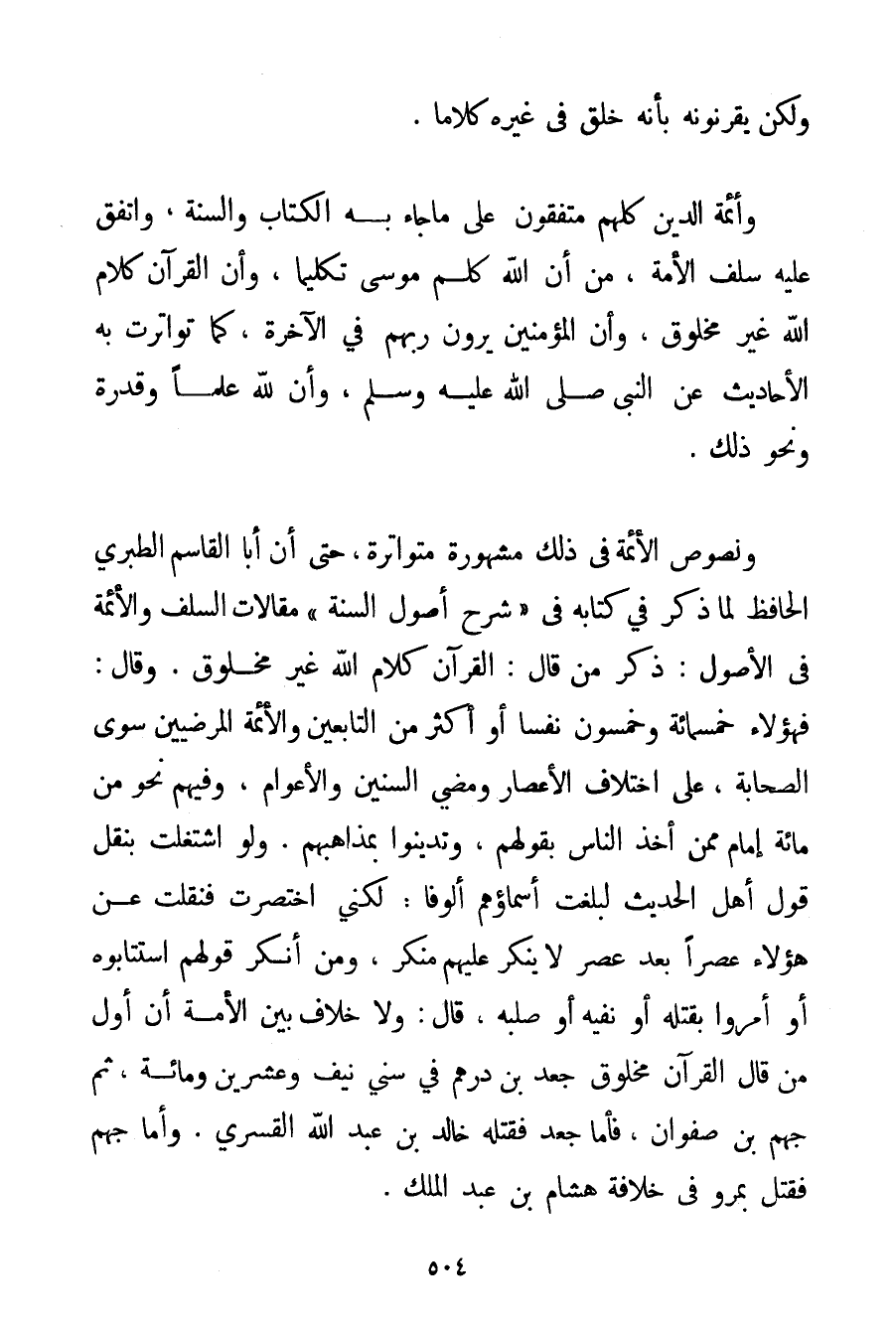 وَلَكِنْ يُقْرِنُونَهُ بِأَنَّهُ خَلَقَ فِي غَيْرِهِ كَلَامًا. وَأَئِمَّةُ الدِّينِ كُلُّهُمْ مُتَّفِقُونَ عَلَى مَا جَاءَ بِهِ الْكِتَابُ وَالسُّنَّةُ وَاتَّفَقَ عَلَيْهِ سَلَفُ الْأُمَّةِ مِنْ أَنَّ اللَّهَ كَلَّمَ مُوسَى تَكْلِيمًا وَأَنَّ الْقُرْآنَ كَلَامُ اللَّهِ غَيْرُ مَخْلُوقٍ وَأَنَّ الْمُؤْمِنِينَ يَرَوْنَ رَبَّهُمْ فِي الْآخِرَةِ كَمَا تَوَاتَرَتْ بِهِ الْأَحَادِيثُ عَنْ النَّبِيِّ صَلَّى اللَّهُ عَلَيْهِ وَسَلَّمَ وَأَنَّ لِلَّهِ عِلْمًا وَقُدْرَةً وَنَحْوَ ذَلِكَ. وَنُصُوصُ الْأَئِمَّةِ فِي ذَلِكَ مَشْهُورَةٌ مُتَوَاتِرَةٌ حَتَّى أَنَّ أَبَا الْقَاسِمِ الطبري الْحَافِظَ لَمَّا ذَكَرَ فِي كِتَابِهِ فِي " شَرْحِ أُصُولِ السُّنَّةِ " مَقَالَاتِ السَّلَفِ وَالْأَئِمَّةِ فِي الْأُصُولِ: ذَكَرَ مَنْ قَالَ: الْقُرْآنُ كَلَامُ اللَّهِ غَيْرُ مَخْلُوقٍ. وَقَالَ: فَهَؤُلَاءِ خَمْسُمِائَةٍ وَخَمْسُونَ نَفْسًا أَوْ أَكْثَرُ مِنْ التَّابِعِينَ وَالْأَئِمَّةِ الْمَرْضِيِّينَ سِوَى الصَّحَابَةِ عَلَى اخْتِلَافِ الْإِعْصَارِ وَمُضِيِّ السِّنِينَ وَالْأَعْوَامِ وَفِيهِمْ نَحْوٌ مَنْ مِائَةِ إمَامٍ مِمَّنْ أَخَذَ النَّاسُ بِقَوْلِهِمْ وَتَدَيَّنُوا بِمَذَاهِبِهِمْ. وَلَوْ اشْتَغَلْت بِنَقْلِ قَوْلِ أَهْلِ الْحَدِيثِ لَبَلَغَتْ أَسْمَاؤُهُمْ أُلُوفًا: لَكِنِّي اخْتَصَرْت فَنَقَلْت عَنْ هَؤُلَاءِ عَصْرًا بَعْدَ عَصْرٍ لَا يُنْكِرُ عَلَيْهِمْ مُنْكِرٌ وَمَنْ أَنْكَرَ قَوْلَهُمْ اسْتَتَابُوهُ أَوْ أَمَرُوا بِقَتْلِهِ أَوْ نَفْيِهِ أَوْ صَلْبِهِ قَالَ: وَلَا خِلَافَ بَيْنِ الْأُمَّةِ أَنَّ أَوَّلَ مَنْ قَالَ الْقُرْآنُ مَخْلُوقٌ جَعْدُ بْنُ دِرْهَمٍ فِي سِنِي نَيِّفٍ وَعِشْرِينَ وَمِائَةٍ ثُمَّ جَهْمُ بْنُ صَفْوَانَ فَأَمَّا جَعْدٌ فَقَتَلَة خَالِدُ بْنُ عَبْدِ اللَّهِ الْقَسْرِيُّ. وَأَمَّا جَهْمٌ فَقُتِلَ بِمُرْوٍ فِي خِلَافَةِ هِشَامِ بْنِ عَبْدِ الْمَلِكِ.