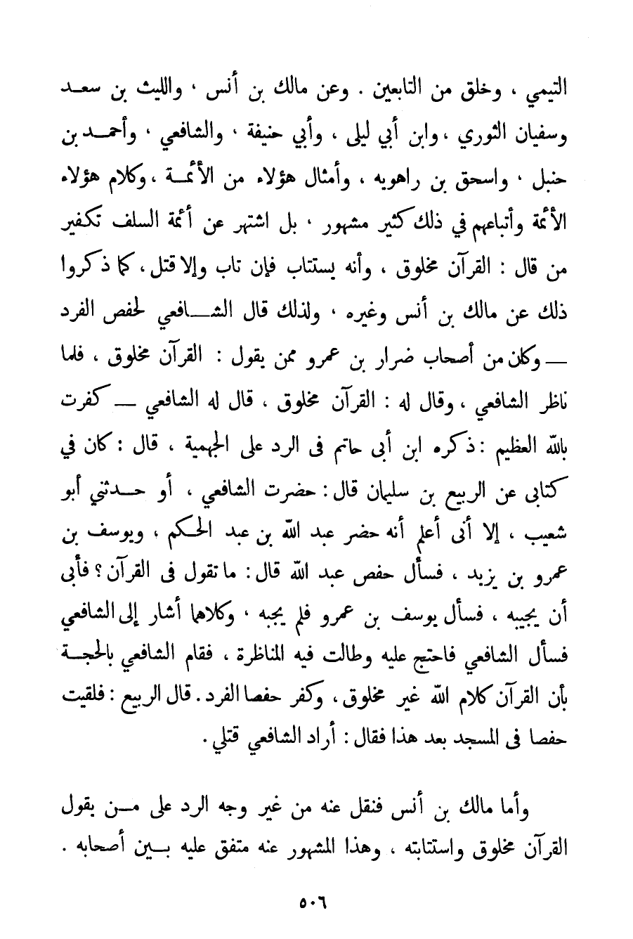 التيمي وَخَلْقٍ مِنْ التَّابِعِينَ. وَعَنْ مَالِكِ بْنِ أَنَسٍ وَاللَّيْثِ بْنِ سَعْدٍ وَسُفْيَانَ الثَّوْرِيِّ وَابْنِ أَبِي لَيْلَى وَأَبِي حَنِيفَةَ وَالشَّافِعِيِّ وَأَحْمَد بْنِ حَنْبَلٍ وَإِسْحَاقَ بْنِ رَاهَوَيْه وَأَمْثَالِ هَؤُلَاءِ مِنْ الْأَئِمَّةِ وَكَلَامُ هَؤُلَاءِ الْأَئِمَّةِ وَأَتْبَاعِهِمْ فِي ذَلِكَ كَثِيرٌ مَشْهُورٌ بَلْ اشْتَهَرَ عَنْ أَئِمَّةِ السَّلَفِ تَكْفِيرُ مَنْ قَالَ: الْقُرْآنُ مَخْلُوقٌ وَأَنَّهُ يُسْتَتَابُ فَإِنْ تَابَ وَإِلَّا قُتِلَ كَمَا ذَكَرُوا ذَلِكَ عَنْ مَالِكِ بْنِ أَنَسٍ وَغَيْرِهِ؟ وَلِذَلِكَ قَالَ الشَّافِعِيُّ لِحَفْصِ الْفَرْدِ - وَكَانَ مِنْ أَصْحَابِ ضِرَارِ بْنِ عَمْرٍو مِمَّنْ يَقُولُ: الْقُرْآنُ مَخْلُوقٌ فَلَمَّا نَاظَرَ الشَّافِعِيَّ وَقَالَ لَهُ: الْقُرْآنُ مَخْلُوقٌ قَالَ لَهُ الشَّافِعِيُّ - كَفَرْت بِاَللَّهِ الْعَظِيمِ: ذَكَرَهُ ابْنُ أَبِي حَاتِمٍ فِي الرَّدِّ عَلَى الْجَهْمِيَّة قَالَ: كَانَ فِي كِتَابِي عَنْ الرَّبِيعِ بْنِ سُلَيْمَانَ قَالَ: حَضَرْت الشَّافِعِيَّ أَوْ حَدَّثَنِي أَبُو شُعَيْبٍ إلَّا أَنِّي أَعْلَمُ أَنَّهُ حَضَرَ عَبْدُ اللَّهِ بْنُ عَبْدِ الْحَكَمِ وَيُوسُفُ بْنُ عَمْرِو بْنِ يَزِيدَ فَسَأَلَ حَفْصٌ عَبْدَ اللَّهِ قَالَ: مَا تَقُولُ فِي الْقُرْآنِ؟ فَأَبَى أَنْ يُجِيبَهُ فَسَأَلَ يُوسُفَ بْنَ عَمْرٍو فَلَمْ يُجِبْهُ وَكِلَاهُمَا أَشَارَ إلَى الشَّافِعِيِّ فَسَأَلَ الشَّافِعِيَّ فَاحْتَجَّ عَلَيْهِ وَطَالَتْ فِيهِ الْمُنَاظَرَةُ فَقَامَ الشَّافِعِيُّ بِالْحُجَّةِ بِأَنَّ الْقُرْآنَ كَلَامُ اللَّهِ غَيْرُ مَخْلُوقٍ وَكَفَّرَ حَفْصًا الْفَرْدَ. قَالَ الرَّبِيعُ: فَلَقِيت حَفْصًا فِي الْمَسْجِدِ بَعْدَ هَذَا فَقَالَ: أَرَادَ الشَّافِعِيُّ قَتْلِي. وَأَمَّا مَالِكُ بْنُ أَنَسٍ فَنُقِلَ عَنْهُ مِنْ غَيْرِ وَجْهٍ الرَّدُّ عَلَى مَنْ يَقُولُ الْقُرْآنَ مَخْلُوقٌ وَاسْتِتَابَتُهُ وَهَذَا الْمَشْهُورُ عَنْهُ مُتَّفَقٌ عَلَيْهِ بَيْنَ أَصْحَابِهِ.