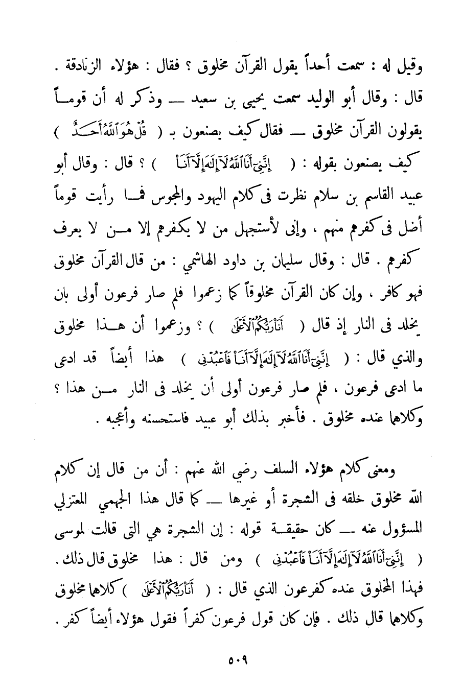 وَقِيلَ لَهُ: سَمِعْت أَحَدًا يَقُولُ الْقُرْآنُ مَخْلُوقٌ؟ فَقَالَ: هَؤُلَاءِ الزَّنَادِقَةُ. قَالَ: وَقَالَ أَبُو الْوَلِيدِ سَمِعْت يَحْيَى بْنَ سَعِيدٍ - وَذَكَرَ لَهُ أَنَّ قَوْمًا يَقُولُونَ الْقُرْآنُ مَخْلُوقٌ - فَقَالَ كَيْفَ يَصْنَعُونَ بِ {قُلْ هُوَ اللَّهُ أَحَدٌ} كَيْفَ يَصْنَعُونَ بِقَوْلِهِ: {إنَّنِي أَنَا اللَّهُ لَا إلَهَ إلَّا أَنَا} ؟ قَالَ: وَقَالَ أَبُو عُبَيْدٍ الْقَاسِمُ بْنُ سلام نَظَرْت فِي كَلَامِ الْيَهُودِ وَالْمَجُوسِ فَمَا رَأَيْت قَوْمًا أَضَلُّ فِي كُفْرِهِمْ مِنْهُمْ وَإِنِّي لأستجهل مَنْ لَا يُكَفِّرُهُمْ إلَّا مَنْ لَا يَعْرِفُ كُفْرَهُمْ. قَالَ: وَقَالَ سُلَيْمَانُ بْنُ دَاوُد الْهَاشِمِيُّ: مَنْ قَالَ الْقُرْآنُ مَخْلُوقٌ فَهُوَ كَافِرٌ وَإِنْ كَانَ الْقُرْآنُ مَخْلُوقًا كَمَا زَعَمُوا فَلِمَ صَارَ فِرْعَوْنُ أَوْلَى بِأَنْ يُخَلَّدَ فِي النَّارِ إذْ قَالَ {أَنَا رَبُّكُمُ الْأَعْلَى} ؟ وَزَعَمُوا أَنَّ هَذَا مَخْلُوقٌ وَاَلَّذِي قَالَ: {إنَّنِي أَنَا اللَّهُ لَا إلَهَ إلَّا أَنَا فَاعْبُدْنِي} هَذَا أَيْضًا قَدْ ادَّعَى مَا ادَّعَى فِرْعَوْنُ فَلِمَ صَارَ فِرْعَوْنُ أَوْلَى أَنْ يُخَلَّدَ فِي النَّارِ مِنْ هَذَا؟ وَكِلَاهُمَا عِنْدَهُ مَخْلُوقٌ. فَأُخْبِرَ بِذَلِكَ أَبُو عُبَيْدٍ فَاسْتَحْسَنَهُ وَأَعْجَبَهُ. وَمَعْنَى كَلَامِ هَؤُلَاءِ السَّلَفِ رَضِيَ اللَّهُ عَنْهُمْ أَنَّ مَنْ قَالَ إنَّ كَلَامَ اللَّهِ مَخْلُوقٌ خَلَقَهُ فِي الشَّجَرَةِ أَوْ غَيْرِهَا - كَمَا قَالَ هَذَا الجهمي الْمُعْتَزِلِيُّ الْمَسْئُولُ عَنْهُ - كَانَ حَقِيقَةُ قَوْلِهِ: إنَّ الشَّجَرَةَ هِيَ الَّتِي قَالَتْ لِمُوسَى {إنَّنِي أَنَا اللَّهُ لَا إلَهَ إلَّا أَنَا فَاعْبُدْنِي} وَمَنْ قَالَ: هَذَا مَخْلُوقٌ قَالَ ذَلِكَ فَهَذَا الْمَخْلُوقُ عِنْدَهُ كَفِرْعَوْنَ الَّذِي قَالَ: {أَنَا رَبُّكُمُ الْأَعْلَى} كِلَاهُمَا مَخْلُوقٌ وَكِلَاهُمَا قَالَ ذَلِكَ. فَإِنْ كَانَ قَوْلُ فِرْعَوْنَ كُفْرًا فَقَوْلُ هَؤُلَاءِ أَيْضًا كُفْرٌ.