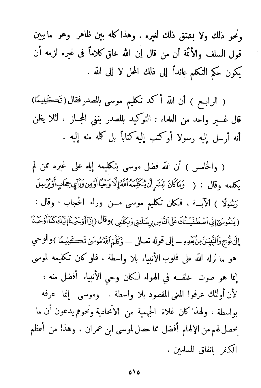 وَنَحْوُ ذَلِكَ وَلَا يُشْتَقُّ ذَلِكَ لِغَيْرِهِ. وَهَذَا كُلُّهُ بَيِّنٌ ظَاهِرٌ وَهُوَ مَا يُبَيِّنُ قَوْلَ السَّلَفِ وَالْأَئِمَّةِ أَنَّ مَنْ قَالَ إنَّ اللَّهَ خَلَقَ كَلَامًا فِي غَيْرِهِ لَزِمَهُ أَنْ يَكُونَ حُكْمُ التَّكَلُّمِ عَائِدًا إلَى ذَلِكَ الْمَحَلِّ لَا إلَى اللَّهِ. (الرَّابِعُ أَنَّ اللَّهَ أَكَّدَ تَكْلِيمَ مُوسَى بِالْمَصْدَرِ فَقَالَ (تَكْلِيمًا قَالَ غَيْرُ وَاحِدٍ مِنْ الْعُلَمَاءِ: التَّوْكِيدُ بِالْمَصْدَرِ يَنْفِي الْمَجَازَ لِئَلَّا يُظَنَّ أَنَّهُ أَرْسَلَ إلَيْهِ رَسُولًا أَوْ كَتَبَ إلَيْهِ كِتَابًا بَلْ كَلَّمَهُ مِنْهُ إلَيْهِ. (وَالْخَامِسُ أَنَّ اللَّهَ فَضَّلَ مُوسَى بِتَكْلِيمِهِ إيَّاهُ عَلَى غَيْرِهِ مِمَّنْ لَمْ يُكَلِّمْهُ وَقَالَ: {وَمَا كَانَ لِبَشَرٍ أَنْ يُكَلِّمَهُ اللَّهُ إلَّا وَحْيًا أَوْ مِنْ وَرَاءِ حِجَابٍ أَوْ يُرْسِلَ رَسُولًا} الْآيَةَ فَكَانَ تَكْلِيمُ مُوسَى مِنْ وَرَاءِ الْحِجَابِ وَقَالَ: {يَا مُوسَى إنِّي اصْطَفَيْتُكَ عَلَى النَّاسِ بِرِسَالَاتِي وَبِكَلَامِي} وَقَالَ {إنَّا أَوْحَيْنَا إلَيْكَ كَمَا أَوْحَيْنَا إلَى نُوحٍ وَالنَّبِيِّينَ مِنْ بَعْدِهِ} - إلَى قَوْلِهِ - {وَكَلَّمَ اللَّهُ مُوسَى تَكْلِيمًا} وَالْوَحْيُ هُوَ مَا نَزَّلَهُ اللَّهُ عَلَى قُلُوبِ الْأَنْبِيَاءِ بِلَا وَاسِطَةٍ فَلَوْ كَانَ تَكْلِيمُهُ لِمُوسَى إنَّمَا هُوَ صَوْتٌ خَلَقَهُ فِي الْهَوَاءِ لَكَانَ وَحْيُ الْأَنْبِيَاءِ أَفْضَلَ مِنْهُ؛ لِأَنَّ أُولَئِكَ عَرَفُوا الْمَعْنَى الْمَقْصُودَ بِلَا وَاسِطَةٍ وَمُوسَى إنَّمَا عَرَفَهُ بِوَاسِطَةِ وَلِهَذَا كَانَ غُلَاةُ الْجَهْمِيَّة مِنْ الِاتِّحَادِيَّةِ وَنَحْوِهِمْ يَدَّعُونَ أَنَّ مَا يَحْصُلُ لَهُمْ مِنْ الْإِلْهَامِ أَفْضَلُ مِمَّا حَصَلَ لِمُوسَى بْنِ عِمْرَانَ وَهَذَا مِنْ أَعْظَمِ الْكُفْرِ بِاتِّفَاقِ الْمُسْلِمِينَ.