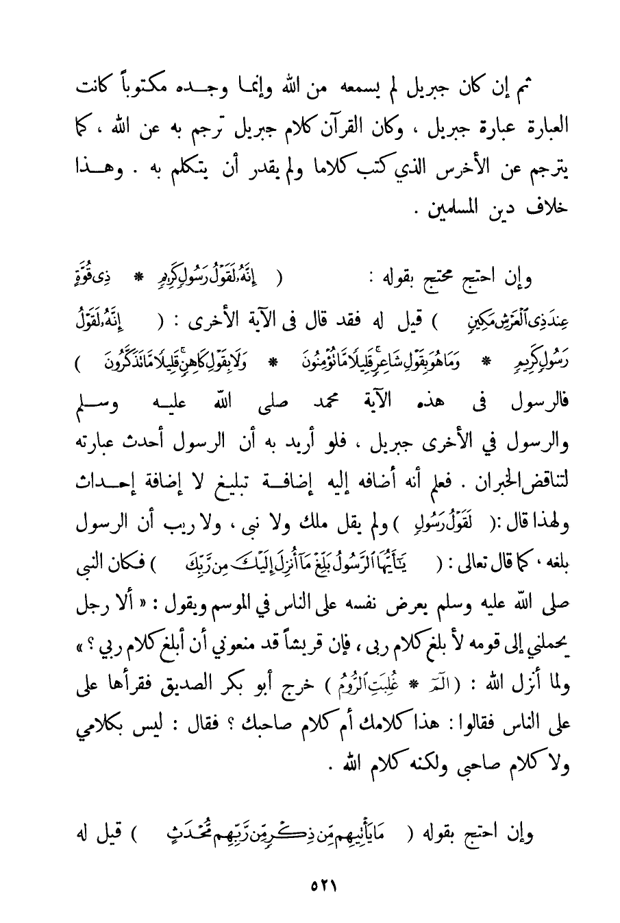 ثم إنْ كَانَ جِبْرِيلُ لَمْ يَسْمَعْهُ مِنْ اللَّهِ وَإِنَّمَا وَجَدَهُ مَكْتُوبًا كَانَتْ الْعِبَارَةُ عِبَارَةَ جِبْرِيلَ وَكَانَ الْقُرْآنُ كَلَامَ جِبْرِيلَ تَرْجَمَ بِهِ عَنْ اللَّهِ. كَمَا يُتَرْجَمُ عَنْ الْأَخْرَسِ الَّذِي كَتَبَ كَلَامًا وَلَمْ يَقْدِرْ أَنْ يَتَكَلَّمَ بِهِ. وَهَذَا خِلَافُ دِينِ الْمُسْلِمِينَ. وَإِنْ احْتَجَّ مُحْتَجٌّ بِقَوْلِهِ: {إنَّهُ لَقَوْلُ رَسُولٍ كَرِيمٍ} {ذِي قُوَّةٍ عِنْدَ ذِي الْعَرْشِ مَكِينٍ} قِيلَ لَهُ فَقَدْ قَالَ فِي الْآيَةِ الْأُخْرَى: {إنَّهُ لَقَوْلُ رَسُولٍ كَرِيمٍ} {وَمَا هُوَ بِقَوْلِ شَاعِرٍ قَلِيلًا مَا تُؤْمِنُونَ} {وَلَا بِقَوْلِ كَاهِنٍ قَلِيلًا مَا تَذَكَّرُونَ} فَالرَّسُولُ فِي هَذِهِ الْآيَةِ مُحَمَّدٌ صَلَّى اللَّهُ عَلَيْهِ وَسَلَّمَ وَالرَّسُولُ فِي الْأُخْرَى جِبْرِيلُ فَلَوْ أُرِيدَ بِهِ أَنَّ الرَّسُولَ أَحْدَثَ عِبَارَتَهُ لَتَنَاقَضَ الْخِبْرَانِ. فَعُلِمَ أَنَّهُ أَضَافَهُ إلَيْهِ إضَافَةَ تَبْلِيغٍ لَا إضَافَةَ إحْدَاثٍ وَلِهَذَا قَالَ: {لَقَوْلُ رَسُولٍ} وَلَمْ يَقُلْ مَلَكٌ وَلَا نَبِيٌّ وَلَا رَيْبَ أَنَّ الرَّسُولَ بَلَّغَهُ كَمَا قَالَ تَعَالَى: {يَا أَيُّهَا الرَّسُولُ بَلِّغْ مَا أُنْزِلَ إلَيْكَ مِنْ رَبِّكَ} فَكَانَ {النَّبِيُّ صَلَّى اللَّهُ عَلَيْهِ وَسَلَّمَ يَعْرِضُ نَفْسَهُ عَلَى النَّاسِ فِي الْمَوْسِمِ وَيَقُولُ: أَلَا رَجُلٌ يَحْمِلُنِي إلَى قَوْمِهِ لَأُبَلِّغَ كَلَامَ رَبِّي فَإِنَّ قُرَيْشًا قَدْ مَنَعُونِي أَنْ أُبَلِّغَ كَلَامَ رَبِّي؟} وَلَمَّا أَنْزَلَ اللَّهُ: {الم} {غُلِبَتِ الرُّومُ} خَرَجَ أَبُو بَكْرٍ الصِّدِّيقُ فَقَرَأَهَا عَلَى عَلَى النَّاسِ فَقَالُوا: هَذَا كَلَامُك أَمْ كَلَامُ صَاحِبِك؟ فَقَالَ: لَيْسَ بِكَلَامِي وَلَا كَلَامَ صَاحِبِي وَلَكِنَّهُ كَلَامُ اللَّهِ. وَإِنْ احْتَجَّ بِقَوْلِهِ {مَا يَأْتِيهِمْ مِنْ ذِكْرٍ مِنْ رَبِّهِمْ مُحْدَثٍ} قِيلَ لَهُ