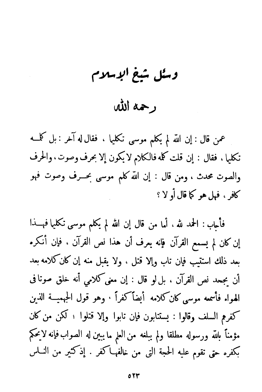 الْحَمْدُ لِلَّهِ، أَمَّا مَنْ قَالَ إنَّ اللَّهَ لَمْ يُكَلِّمْ مُوسَى تَكْلِيمًا فَهَذَا إنْ كَانَ لَمْ يَسْمَعْ الْقُرْآنَ فَإِنَّهُ يُعَرَّفُ أَنَّ هَذَا نَصُّ الْقُرْآنِ فَإِنْ أَنْكَرَهُ بَعْدَ ذَلِكَ اُسْتُتِيبَ فَإِنْ تَابَ وَإِلَّا قُتِلَ وَلَا يُقْبَلُ مِنْهُ إنْ كَانَ كَلَامُهُ بَعْدَ أَنْ يَجْحَدَ نَصَّ الْقُرْآنِ بَلْ لَوْ قَالَ: إنَّ مَعْنَى كَلَامِي أَنَّهُ خَلَقَ صَوْتًا فِي الْهَوَاءِ فَأَسْمَعُهُ مُوسَى كَانَ كَلَامُهُ أَيْضًا كُفْرًا وَهُوَ قَوْلُ الْجَهْمِيَّة الَّذِينَ كَفَّرَهُمْ السَّلَفُ وَقَالُوا: يُسْتَتَابُونَ فَإِنْ تَابُوا وَإِلَّا قُتِلُوا؛ لَكِنْ مَنْ كَانَ مُؤْمِنًا بِاَللَّهِ وَرَسُولِهِ مُطْلَقًا وَلَمْ يَبْلُغْهُ مِنْ الْعِلْمِ مَا يُبَيِّنُ لَهُ الصَّوَابَ فَإِنَّهُ لَا يُحْكَمُ بِكُفْرِهِ حَتَّى تَقُومَ عَلَيْهِ الْحُجَّةُ الَّتِي مَنْ خَالَفَهَا كَفَرَ. إذْ كَثِيرٌ مِنْ النَّاسِ