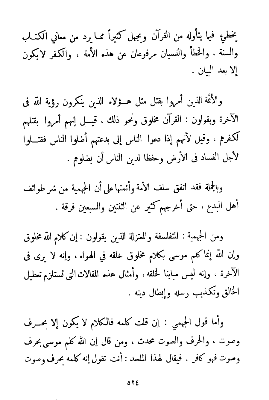 يُخْطِئُ فِيمَا يَتَأَوَّلُهُ مِنْ الْقُرْآنِ وَيَجْهَلُ كَثِيرًا مِمَّا يَرِدُ مِنْ مَعَانِي الْكِتَابِ وَالسُّنَّةِ. وَالْخَطَأُ وَالنِّسْيَانُ مَرْفُوعَانِ عَنْ هَذِهِ الْأُمَّةِ وَالْكُفْرُ لَا يَكُونُ إلَّا بَعْدَ الْبَيَانِ. وَالْأَئِمَّةُ الَّذِينَ أُمِرُوا بِقَتْلِ مِثْلِ هَؤُلَاءِ الَّذِينَ يُنْكِرُونَ رُؤْيَةَ اللَّهِ فِي الْآخِرَةِ وَيَقُولُونَ: الْقُرْآنُ مَخْلُوقٌ وَنَحْوُ ذَلِكَ قِيلَ إنَّهُمْ أُمِرُوا بِقَتْلِهِمْ لِكُفْرِهِمْ وَقِيلَ لِأَنَّهُمْ إذَا دَعَوْا النَّاسَ إلَى بِدْعَتِهِمْ أَضَلُّوا النَّاسَ فَقُتِلُوا لِأَجْلِ الْفَسَادِ فِي الْأَرْضِ وَحِفْظًا لِدِينِ النَّاسِ أَنْ يُضِلُّوهُمْ. وَبِالْجُمْلَةِ فَقَدْ اتَّفَقَ سَلَفُ الْأُمَّةِ وَأَئِمَّتُهَا عَلَى أَنَّ الْجَهْمِيَّة مِنْ شَرِّ طَوَائِفِ أَهْلِ الْبِدَعِ حَتَّى أَخْرَجَهُمْ كَثِيرٌ عَنْ الثِّنْتَيْنِ وَالسَّبْعِينَ فِرْقَةً. وَمِنْ الْجَهْمِيَّة: الْمُتَفَلْسِفَةُ وَالْمُعْتَزِلَةُ الَّذِينَ يَقُولُونَ: إنَّ كَلَامَ اللَّهِ مَخْلُوقٌ وَإِنَّ اللَّهَ إنَّمَا كَلَّمَ مُوسَى بِكَلَامِ مَخْلُوقٍ خَلَقَهُ فِي الْهَوَاءِ وَإِنَّهُ لَا يُرَى فِي الْآخِرَةِ - وَإِنَّهُ لَيْسَ مُبَايِنًا لِخَلْقِهِ وَأَمْثَالَ هَذِهِ الْمَقَالَاتِ الَّتِي تَسْتَلْزِمُ تَعْطِيلَ الْخَالِقِ وَتَكْذِيبَ رُسُلِهِ وَإِبْطَالَ دِينِهِ. وَأَمَّا قَوْلُ الجهمي: إنْ قُلْت كَلَّمَهُ فَالْكَلَامُ لَا يَكُونُ إلَّا بِحَرْفِ وَصَوْتٍ وَالْحَرْفُ وَالصَّوْتُ مُحْدَثٌ وَمَنْ قَالَ إنَّ اللَّهَ كَلَّمَ مُوسَى بِحَرْفِ وَصَوْتٍ فَهُوَ كَافِرٌ. فَيُقَالُ لِهَذَا الْمُلْحِدِ: أَنْتَ تَقُولُ إنَّهُ كَلَّمَهُ بِحَرْفِ وَصَوْتٍ