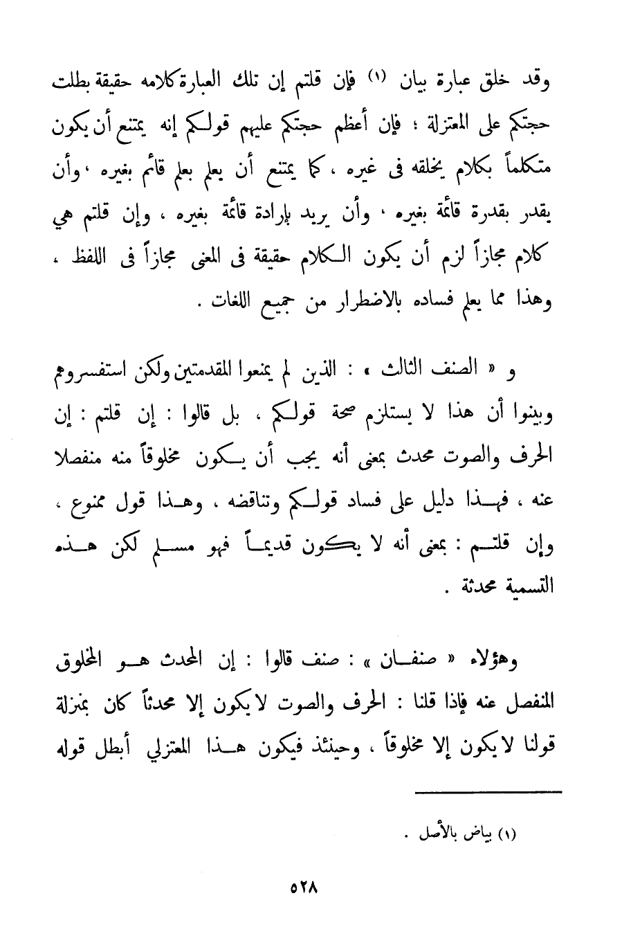 وَقَدْ خَلَقَ عِبَارَةَ بَيَانٍ. . . (1) فَإِنْ قُلْتُمْ إنَّ تِلْكَ الْعِبَارَةَ كَلَامُهُ حَقِيقَةً بَطَلَتْ حُجَّتُكُمْ عَلَى الْمُعْتَزِلَةِ؛ فَإِنَّ أَعْظَمَ حُجَّتِكُمْ عَلَيْهِمْ قَوْلُكُمْ إنَّهُ يَمْتَنِعُ أَنْ يَكُونَ مُتَكَلِّمًا بِكَلَامِ يَخْلُقُهُ فِي غَيْرِهِ كَمَا يَمْتَنِعُ أَنْ يَعْلَمَ بِعِلْمِ قَائِمٍ بِغَيْرِهِ وَأَنْ يَقْدِرَ بِقُدْرَةِ قَائِمَةٍ بِغَيْرِهِ وَأَنْ يُرِيدَ بِإِرَادَةِ قَائِمَةٍ بِغَيْرِهِ وَإِنْ قُلْتُمْ هِيَ كَلَامٌ مَجَازًا لَزِمَ أَنْ يَكُونَ الْكَلَامُ حَقِيقَةً فِي الْمَعْنَى مَجَازًا فِي اللَّفْظِ وَهَذَا مِمَّا يَعْلَمُ فَسَادُهُ بِالِاضْطِرَارِ مِنْ جَمِيعِ اللُّغَاتِ. وَ " الصِّنْفُ الثَّالِثُ ": الَّذِينَ لَمْ يَمْنَعُوا الْمُقَدِّمَتَيْنِ وَلَكِنْ اسْتَفْسَرُوهُمْ وَبَيَّنُوا أَنَّ هَذَا لَا يَسْتَلْزِمُ صِحَّةَ قَوْلِكُمْ بَلْ قَالُوا: إنْ قُلْتُمْ: إنَّ الْحَرْفَ وَالصَّوْتَ مُحْدَثٌ بِمَعْنَى أَنَّهُ يَجِبُ أَنْ يَكُونَ مَخْلُوقًا مِنْهُ مُنْفَصِلًا عَنْهُ فَهَذَا دَلِيلٌ عَلَى فَسَادِ قَوْلِكُمْ وَتَنَاقُضِهِ وَهَذَا قَوْلٌ مَمْنُوعٌ وَإِنْ قُلْتُمْ: بِمَعْنَى أَنَّهُ لَا يَكُونُ قَدِيمًا فَهُوَ مُسَلَّمٌ لَكِنْ هَذِهِ التَّسْمِيَةُ مُحْدَثَةٌ. وَهَؤُلَاءِ " صِنْفَانِ ": صِنْفٌ قَالُوا: إنَّ الْمُحْدَثَ هُوَ الْمَخْلُوقُ الْمُنْفَصِلُ عَنْهُ فَإِذَا قُلْنَا: الْحَرْفُ وَالصَّوْتُ لَا يَكُونُ إلَّا مُحْدَثًا كَانَ بِمَنْزِلَةِ قَوْلِنَا لَا يَكُونُ إلَّا مَخْلُوقًا وَحِينَئِذٍ فَيَكُونُ هَذَا الْمُعْتَزِلِيُّ أَبْطَلَ قَوْلَهُ