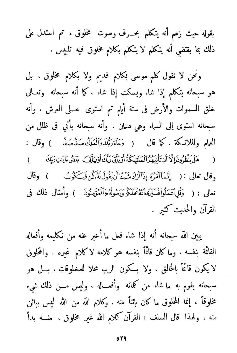 بِقَوْلِهِ حَيْثُ زَعَمَ أَنَّهُ يَتَكَلَّمُ بِحَرْفِ وَصَوْتٍ مَخْلُوقٍ ثُمَّ اسْتَدَلَّ عَلَى ذَلِكَ بِمَا يَقْتَضِي أَنَّهُ يَتَكَلَّمُ لَا يَتَكَلَّمُ بِكَلَامِ مَخْلُوقٍ فِيهِ تَلْبِيسٌ. وَنَحْنُ لَا نَقُولُ كَلَّمَ مُوسَى بِكَلَامِ قَدِيمٍ وَلَا بِكَلَامِ مَخْلُوقٍ بَلْ هُوَ سُبْحَانَهُ يَتَكَلَّمُ إذَا شَاءَ وَيَسْكُتُ إذَا شَاءَ كَمَا أَنَّهُ سُبْحَانَهُ وَتَعَالَى خَلَقَ السَّمَوَاتِ وَالْأَرْضَ فِي سِتَّةِ أَيَّامٍ ثُمَّ اسْتَوَى عَلَى الْعَرْشِ وَأَنَّهُ سُبْحَانَهُ اسْتَوَى إلَى السَّمَاءِ وَهِيَ دُخَانٌ وَأَنَّهُ سُبْحَانَهُ يَأْتِي فِي ظُلَلٍ مِنْ الْغَمَامِ وَالْمَلَائِكَةُ كَمَا قَالَ {وَجَاءَ رَبُّكَ وَالْمَلَكُ صَفًّا صَفًّا} وَقَالَ: {هَلْ يَنْظُرُونَ إلَّا أَنْ تَأْتِيَهُمُ الْمَلَائِكَةُ أَوْ يَأْتِيَ رَبُّكَ أَوْ يَأْتِيَ بَعْضُ آيَاتِ رَبِّكَ} وَقَالَ تَعَالَى: {إنَّمَا أَمْرُهُ إذَا أَرَادَ شَيْئًا أَنْ يَقُولَ لَهُ كُنْ فَيَكُونُ} وَقَالَ تَعَالَى: {وَقُلِ اعْمَلُوا فَسَيَرَى اللَّهُ عَمَلَكُمْ وَرَسُولُهُ وَالْمُؤْمِنُونَ} وَأَمْثَالُ ذَلِكَ فِي الْقُرْآنِ وَالْحَدِيثِ كَثِيرٌ. يُبَيِّنُ اللَّهُ سُبْحَانَهُ أَنَّهُ إذَا شَاءَ فَعَلَ مَا أَخْبَرَ عَنْهُ مِنْ تَكْلِيمِهِ وَأَفْعَالِهِ الْقَائِمَةِ بِنَفْسِهِ وَمَا كَانَ قَائِمًا بِنَفْسِهِ هُوَ كَلَامُهُ لَا كَلَامُ غَيْرِهِ. وَالْمَخْلُوقُ لَا يَكُونُ قَائِمًا بِالْخَالِقِ وَلَا يَكُونُ الرَّبُّ مَحَلًّا لِلْمَخْلُوقَاتِ بَلْ هُوَ سُبْحَانَهُ يَقُومُ بِهِ مَا شَاءَ مِنْ كَلِمَاتِهِ وَأَفْعَالِهِ وَلَيْسَ مِنْ ذَلِكَ شَيْءٌ مَخْلُوقًا إنَّمَا الْمَخْلُوقُ مَا كَانَ بَائِنًا عَنْهُ. وَكَلَامُ اللَّهِ مِنْ اللَّهِ لَيْسَ بِبَائِنِ مِنْهُ وَلِهَذَا قَالَ السَّلَفُ: الْقُرْآنُ كَلَامُ اللَّهِ غَيْرُ مَخْلُوقٍ مِنْهُ بَدَأَ
