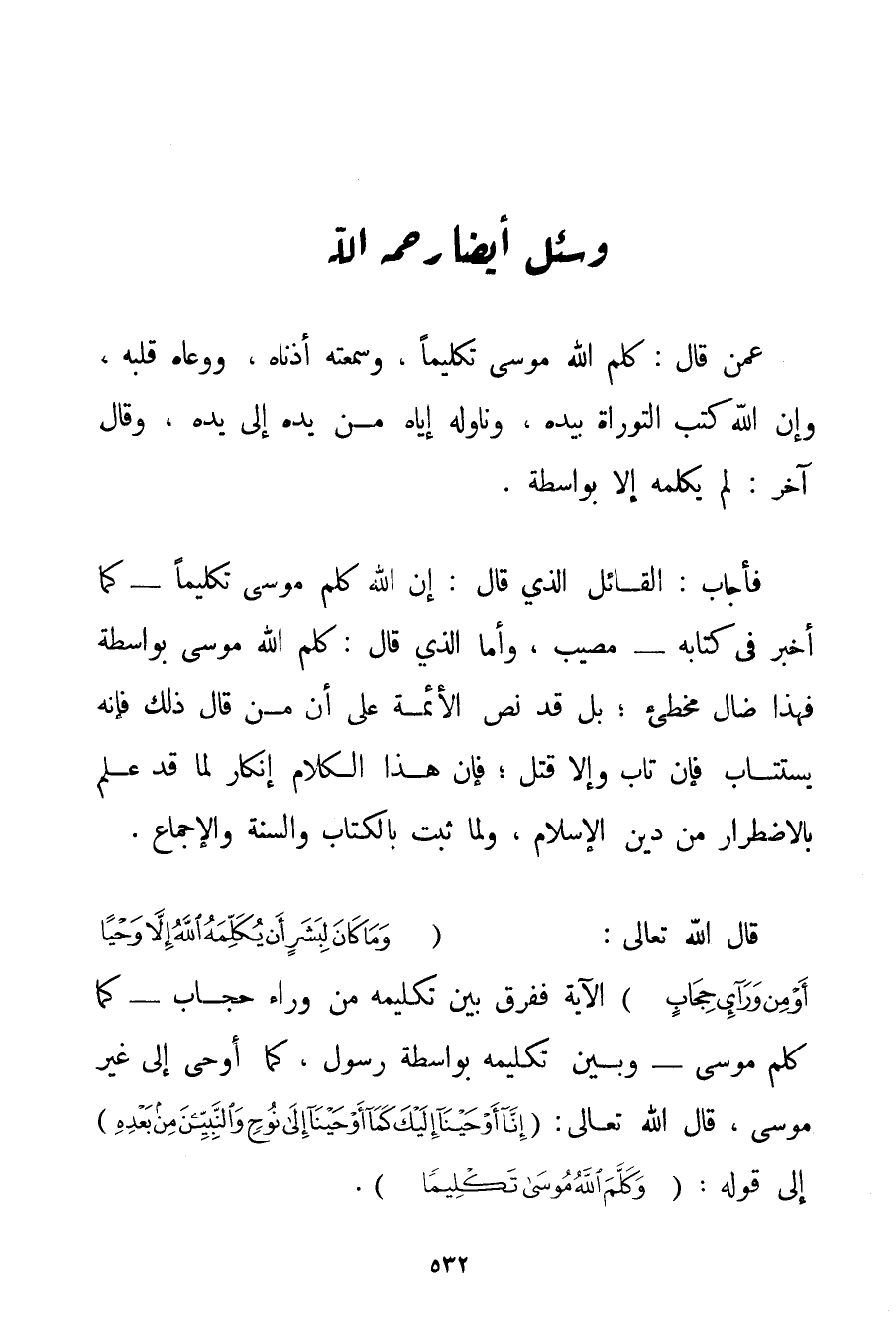 الْقَائِلُ الَّذِي قَالَ: إنَّ اللَّهَ كَلَّمَ مُوسَى تَكْلِيمًا - كَمَا أَخْبَرَ فِي كِتَابِهِ - مُصِيبٌ وَأَمَّا الَّذِي قَالَ: كَلَّمَ اللَّهُ مُوسَى بِوَاسِطَةِ فَهَذَا ضَالٌّ مُخْطِئٌ؛ بَلْ قَدْ نَصَّ الْأَئِمَّةُ عَلَى أَنَّ مَنْ قَالَ ذَلِكَ فَإِنَّهُ يُسْتَتَابُ فَإِنْ تَابَ وَإِلَّا قُتِلَ؛ فَإِنَّ هَذَا الْكَلَامَ إنْكَارٌ لِمَا قَدْ عُلِمَ بِالِاضْطِرَارِ مِنْ دِينِ الْإِسْلَامِ وَلِمَا ثَبَتَ بِالْكِتَابِ وَالسُّنَّةِ وَالْإِجْمَاعِ. قَالَ اللَّهُ تَعَالَى: {وَمَا كَانَ لِبَشَرٍ أَنْ يُكَلِّمَهُ اللَّهُ إلَّا وَحْيًا أَوْ مِنْ وَرَاءِ حِجَابٍ} الْآيَةَ فَفَرَّقَ بَيْنَ تَكْلِيمِهِ مِنْ وَرَاءِ حِجَابٍ - كَمَا كَلَّمَ مُوسَى - وَبَيْنَ تَكْلِيمِهِ بِوَاسِطَةِ رَسُولٍ كَمَا أَوْحَى إلَى غَيْرِ مُوسَى قَالَ اللَّهُ تَعَالَى: {إنَّا أَوْحَيْنَا إلَيْكَ كَمَا أَوْحَيْنَا إلَى نُوحٍ وَالنَّبِيِّينَ مِنْ بَعْدِهِ} إلَى قَوْلِهِ: {وَكَلَّمَ اللَّهُ مُوسَى تَكْلِيمًا} .