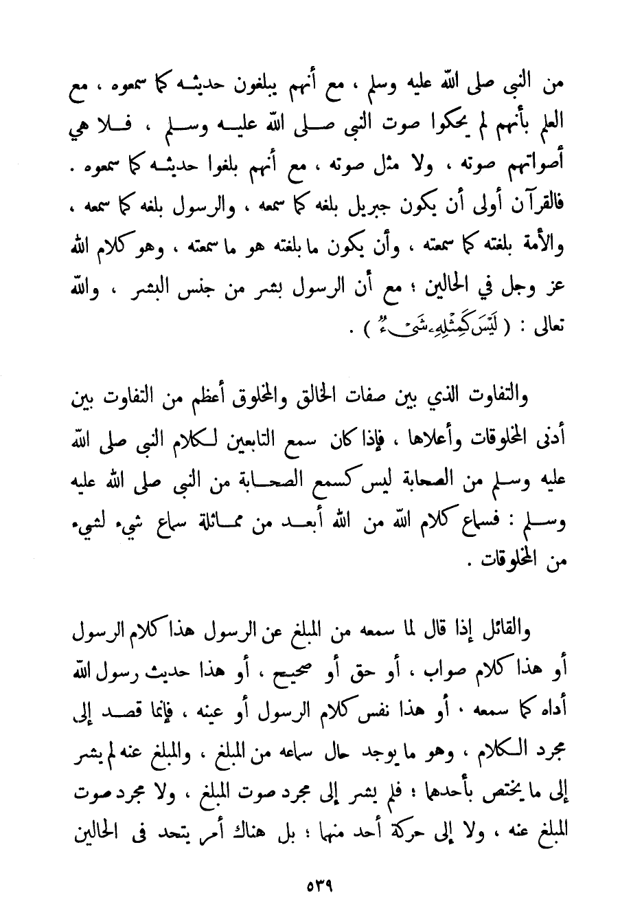 مِنْ النَّبِيِّ صَلَّى اللَّهُ عَلَيْهِ وَسَلَّمَ مَعَ أَنَّهُمْ يُبَلِّغُونَ حَدِيثَهُ كَمَا سَمِعُوهُ مَعَ الْعِلْمِ بِأَنَّهُمْ لَمْ يَحْكُوا صَوْتَ النَّبِيِّ صَلَّى اللَّهُ عَلَيْهِ وَسَلَّمَ فَلَا هِيَ أَصْوَاتُهُمْ صَوْتَهُ وَلَا مِثْلَ صَوْتِهِ مَعَ أَنَّهُمْ بَلَّغُوا حَدِيثَهُ كَمَا سَمِعُوهُ. فَالْقُرْآنُ أَوْلَى أَنْ يَكُونَ جِبْرِيلُ بَلَّغَهُ كَمَا سَمِعَهُ وَالرَّسُولُ بَلَّغَهُ كَمَا سَمِعَهُ وَالْأُمَّةُ بَلَّغَتْهُ كَمَا سَمِعَتْهُ وَأَنْ يَكُونَ مَا بَلَّغَتْهُ هُوَ مَا سَمِعَتْهُ وَهُوَ كَلَامُ اللَّهِ عَزَّ وَجَلَّ فِي الْحَالَيْنِ؛ مَعَ أَنَّ الرَّسُولَ بَشَرٌ مِنْ جِنْسِ الْبَشَرِ " وَاَللَّهُ تَعَالَى: {لَيْسَ كَمِثْلِهِ شَيْءٌ} . وَالتَّفَاوُتُ الَّذِي بَيْنَ صِفَاتِ الْخَالِقِ وَالْمَخْلُوقِ أَعْظَمُ مِنْ التَّفَاوُتِ بَيْنَ أَدْنَى الْمَخْلُوقَاتِ وَأَعْلَاهَا فَإِذَا كَانَ سَمْعُ التَّابِعِينَ لِكَلَامِ النَّبِيِّ صَلَّى اللَّهُ عَلَيْهِ وَسَلَّمَ مِنْ الصَّحَابَةِ لَيْسَ كَسَمْعِ الصَّحَابَةِ مِنْ النَّبِيِّ صَلَّى اللَّهُ عَلَيْهِ وَسَلَّمَ فَسَمَاعُ كَلَامِ اللَّهِ مِنْ اللَّهِ أَبْعَدُ مِنْ مُمَاثَلَةِ سَمَاعِ شَيْءٍ لِشَيْءِ مِنْ الْمَخْلُوفَاتِ. وَالْقَائِلُ إذَا قَالَ لِمَا سَمِعَهُ مِنْ الْمُبَلِّغِ عَنْ الرَّسُولِ هَذَا كَلَامُ الرَّسُولِ أَوْ هَذَا كَلَامٌ صَوَابٌ أَوْ حَقٌّ أَوْ صَحِيحٌ أَوْ هَذَا حَدِيثُ رَسُولِ اللَّهِ أَدَّاهُ كَمَا سَمِعَهُ. أَوْ هَذَا نَفْسُ كَلَامِ الرَّسُولِ أَوْ عَيْنُهُ فَإِنَّمَا قَصَدَ إلَى مُجَرَّدِ الْكَلَامِ وَهُوَ مَا يُوجَدُ حَالَ سَمَاعِهِ مِنْ الْمُبَلِّغِ وَالْمُبَلَّغِ عَنْهُ لَمْ يُشِرْ إلَى مَا يَخْتَصُّ بِأَحَدِهِمَا؛ فَلَمْ يُشِرْ إلَى مُجَرَّدِ صَوْتِ الْمُبَلِّغِ وَلَا مُجَرَّدِ صَوْتِ الْمُبَلَّغِ عَنْهُ وَلَا إلَى حَرَكَةِ أَحَدٍ مِنْهُمَا؛ بَلْ هُنَاكَ أَمْرٌ يَتَّحِدُ فِي الْحَالَيْنِ