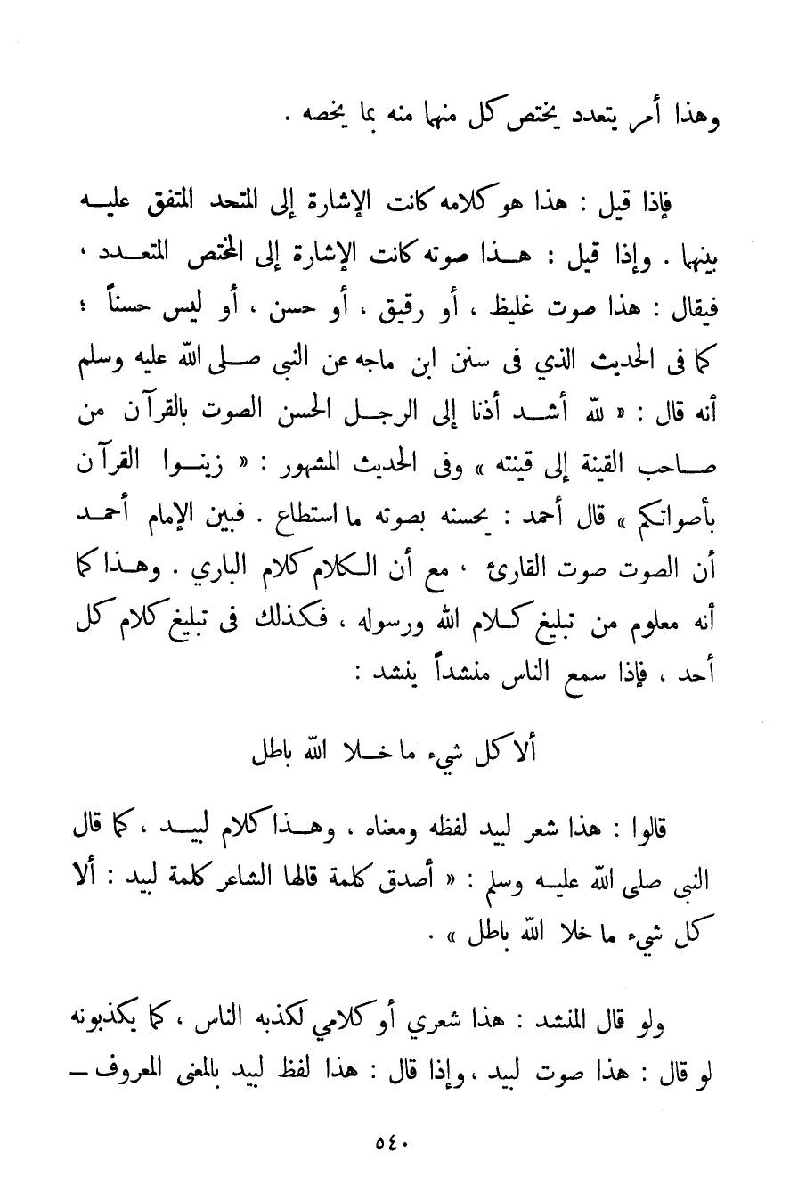 وَهَذَا أَمْرٌ يَتَعَدَّدُ يَخْتَصُّ كُلٌّ مِنْهُمَا مِنْهُ بِمَا يَخُصُّهُ. فَإِذَا قِيلَ: هَذَا هُوَ كَلَامُهُ كَانَتْ الْإِشَارَةُ إلَى الْمُتَّحِدِ الْمُتَّفَقِ عَلَيْهِ بَيْنَهُمَا. وَإِذَا قِيلَ: هَذَا صَوْتُهُ كَانَتْ الْإِشَارَةُ إلَى الْمُخْتَصِّ الْمُتَعَدِّدِ فَيُقَالُ: هَذَا صَوْتٌ غَلِيظٌ أَوْ رَقِيقٌ أَوْ حَسَنٌ أَوْ لَيْسَ حَسَنًا؛ كَمَا فِي الْحَدِيثِ الَّذِي فِي سُنَنِ ابْنِ مَاجَه عَنْ النَّبِيِّ صَلَّى اللَّهُ عَلَيْهِ وَسَلَّمَ أَنَّهُ قَالَ: {لَلَّهُ أَشَدُّ أَذْنًا إلَى الرَّجُلِ الْحَسَنِ الصَّوْتِ بِالْقُرْآنِ مِنْ صَاحِبِ الْقَيْنَةِ إلَى قَيْنَتِهِ} وَفِي الْحَدِيثِ الْمَشْهُورِ: {زُيِّنُوا الْقُرْآنَ بِأَصْوَاتِكُمْ} قَالَ أَحْمَد. يُحَسِّنُهُ بِصَوْتِهِ مَا اسْتَطَاعَ. فَبَيَّنَ الْإِمَامُ أَحْمَد أَنَّ الصَّوْتَ صَوْتُ الْقَارِئِ مَعَ أَنَّ الْكَلَامَ كَلَامُ الْبَارِي. وَهَذَا كَمَا أَنَّهُ مَعْلُومٌ مِنْ تَبْلِيغِ كَلَامِ اللَّهِ وَرَسُولِهِ فَكَذَلِكَ فِي تَبْلِيغِ كَلَامِ كُلِّ أَحَدٍ فَإِذَا سَمِعَ النَّاسُ مُنْشِدًا يُنْشِدُ. أَلَا كُلُّ شَيْءٍ مَا خَلَا اللَّهَ بَاطِلٌ قَالُوا: هَذَا شِعْرُ لَبِيَدٍ لَفْظُهُ وَمَعْنَاهُ وَهَذَا كَلَامُ لَبِيَدٍ كَمَا قَالَ النَّبِيُّ صَلَّى اللَّهُ عَلَيْهِ وَسَلَّمَ {أَصْدَقُ كَلِمَةٍ قَالَهَا الشَّاعِرُ كَلِمَةُ لَبِيَدٍ: أَلَا كُلُّ شَيْءٍ مَا خَلَا اللَّهَ بَاطِلٌ} . وَلَوْ قَالَ الْمُنْشِدُ: هَذَا شَعْرِي أَوْ كَلَامِي لَكَذَّبَهُ النَّاسُ كَمَا يُكَذِّبُونَهُ لَوْ قَالَ: هَذَا صَوْتُ لَبِيَدٍ وَإِذَا قَالَ: هَذَا لَفْظُ لَبِيَدٍ بِالْمَعْنَى الْمَعْرُوفِ - وَهُوَ أَنَّ هَذَا الْكَلَامَ الْمَلْفُوظَ هُوَ كَلَامُهُ بِنَظْمِهِ وَتَأْلِيفِهِ - لَصَدَّقَهُ النَّاسُ.
