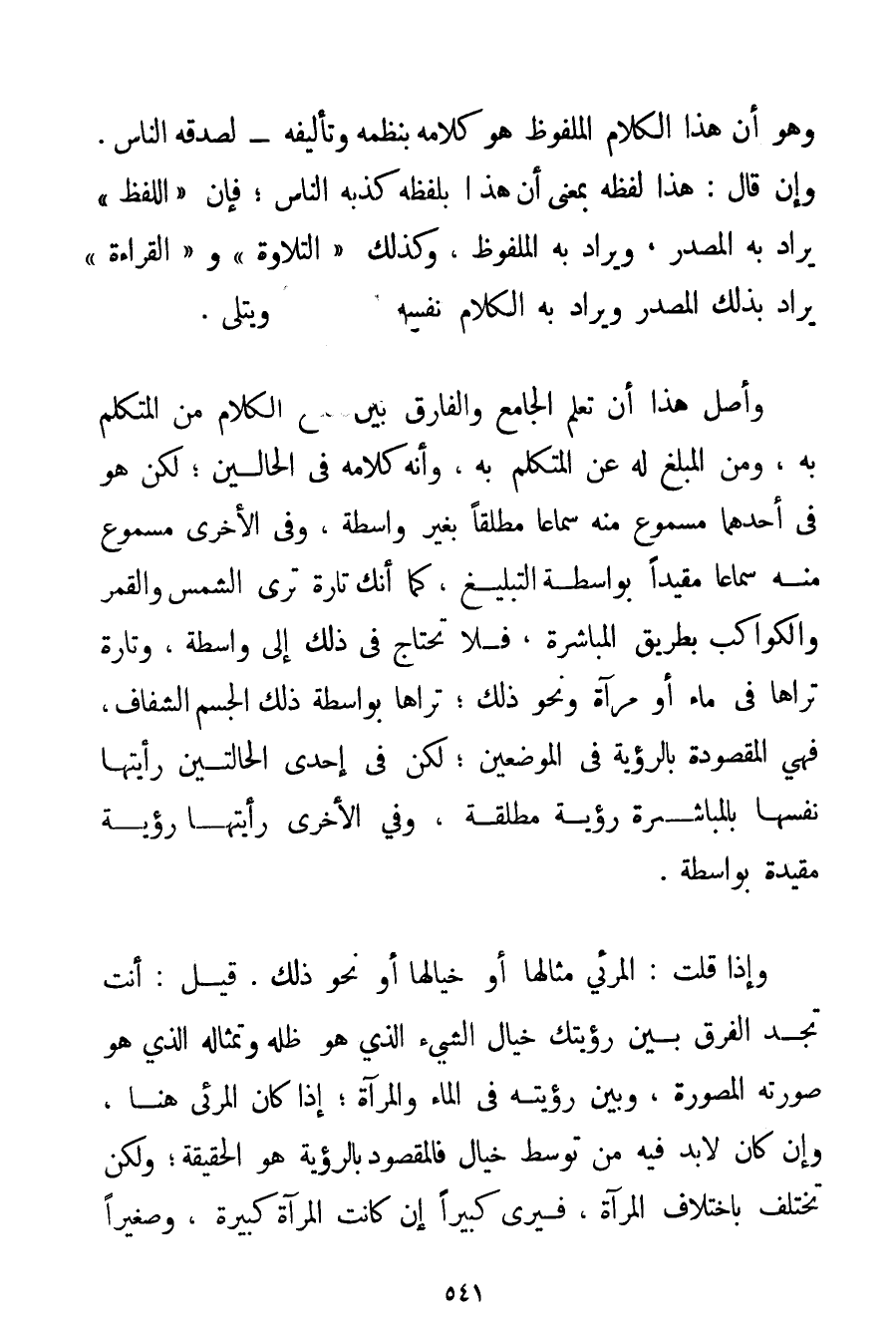 وَإِنْ قَالَ: هَذَا لَفْظُهُ بِمَعْنَى أَنَّ هَذَا بِلَفْظِهِ كَذَّبَهُ النَّاسُ؛ فَإِنَّ " اللَّفْظَ " يُرَادُ بِهِ الْمَصْدَرُ " وَيُرَادُ بِهِ الْمَلْفُوظُ وَكَذَلِكَ " التِّلَاوَةُ " وَ " الْقِرَاءَةُ " يُرَادُ بِذَلِكَ الْمَصْدَرُ وَيُرَادُ بِهِ الْكَلَامُ نَفْسُهُ الَّذِي يُقْرَأُ وَيُتْلَى. وَأَصْلُ هَذَا أَنَّ تَعَلُّمَ الْجَامِعِ وَالْفَارِقِ بَيْنَ سَمَاعِ الْكَلَامِ مِنْ الْمُتَكَلِّمِ بِهِ وَمِنْ الْمُبَلِّغِ لَهُ عَنْ الْمُتَكَلِّمِ بِهِ وَأَنَّهُ كَلَامُهُ فِي الْحَالَيْنِ: لَكِنْ هُوَ فِي أَحَدِهِمَا مَسْمُوعٌ مِنْهُ سَمَاعًا مُطْلَقًا بِغَيْرِ وَاسِطَةٍ وَفِي الْأُخْرَى مَسْمُوعٌ مِنْهُ سَمَاعًا مُقَيَّدًا بِوَاسِطَةِ التَّبْلِيغِ كَمَا أَنَّك تَارَةً تَرَى الشَّمْسَ وَالْقَمَرَ وَالْكَوَاكِبَ بِطَرِيقِ الْمُبَاشَرَةِ فَلَا تَحْتَاجُ فِي ذَلِكَ إلَى وَاسِطَةٍ وَتَارَةً تَرَاهَا فِي مَاءٍ أَوْ مِرْآةٍ وَنَحْوِ ذَلِكَ؛ تَرَاهَا بِوَاسِطَةِ ذَلِكَ الْجِسْمِ الشَّفَّافِ فَهِيَ الْمَقْصُودَةُ بِالرُّؤْيَةِ فِي الْمَوْضِعَيْنِ. لَكِنْ فِي إحْدَى الْحَالَتَيْنِ رَأَيْتهَا نَفْسَهَا بِالْمُبَاشَرَةِ رُؤْيَةً مُطْلَقَةً وَفِي الْأُخْرَى رَأَيْتهَا رُؤْيَةً مُقَيَّدَةً بِوَاسِطَةِ. وَإِذَا قُلْت: الْمَرْئِيُّ مِثَالُهَا أَوْ خَيَالُهَا أَوْ نَحْوُ ذَلِكَ. قِيلَ: أَنْتَ تَجِدُ الْفَرْقَ بَيْنَ رُؤْيَتِك خَيَالَ الشَّيْءِ الَّذِي هُوَ ظِلُّهُ وَتِمْثَالُهُ الَّذِي هُوَ صُورَتُهُ الْمُصَوَّرَةُ وَبَيْنَ رُؤْيَتِهِ فِي الْمَاءِ وَالْمِرْآةِ؛ إذَا كَانَ الْمَرْئِيُّ هُنَا وَإِنْ كَانَ لَا بُدَّ فِيهِ مِنْ تَوَسُّطِ خَيَالٍ فَالْمَقْصُودُ بِالرُّؤْيَةِ هُوَ الْحَقِيقَةُ؛ وَلَكِنْ تَخْتَلِفُ بِاخْتِلَافِ الْمِرْآةِ فَيُرَى كَبِيرًا إنْ كَانَتْ الْمِرْآةُ كَبِيرَةً وَصَغِيرًا