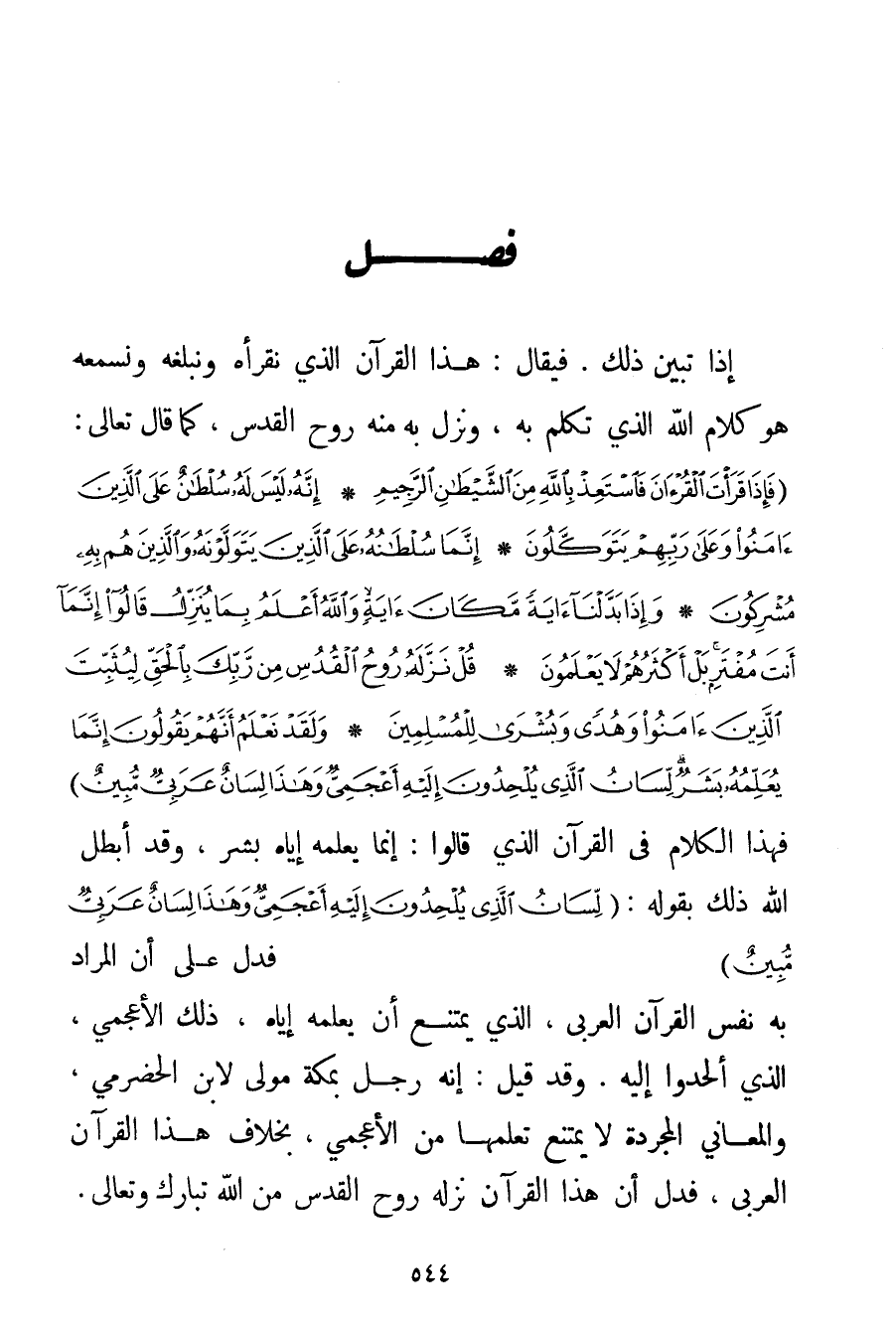 إذَا تَبَيَّنَ ذَلِكَ، فَيُقَالُ: هَذَا الْقُرْآنُ الَّذِي نَقْرَؤُهُ وَنُبَلِّغُهُ وَنَسْمَعُهُ هُوَ كَلَامُ اللَّهِ الَّذِي تَكَلَّمَ بِهِ وَنَزَلَ بِهِ مِنْهُ رُوحُ الْقُدُسِ كَمَا قَالَ تَعَالَى: {فَإِذَا قَرَأْتَ الْقُرْآنَ فَاسْتَعِذْ بِاللَّهِ مِنَ الشَّيْطَانِ الرَّجِيمِ} {إنَّهُ لَيْسَ لَهُ سُلْطَانٌ عَلَى الَّذِينَ آمَنُوا وَعَلَى رَبِّهِمْ يَتَوَكَّلُونَ} {إنَّمَا سُلْطَانُهُ عَلَى الَّذِينَ يَتَوَلَّوْنَهُ وَالَّذِينَ هُمْ بِهِ مُشْرِكُونَ} {وَإِذَا بَدَّلْنَا آيَةً مَكَانَ آيَةٍ وَاللَّهُ أَعْلَمُ بِمَا يُنَزِّلُ قَالُوا إنَّمَا أَنْتَ مُفْتَرٍ بَلْ أَكْثَرُهُمْ لَا يَعْلَمُونَ} {قُلْ نَزَّلَهُ رُوحُ الْقُدُسِ مِنْ رَبِّكَ بِالْحَقِّ لِيُثَبِّتَ الَّذِينَ آمَنُوا وَهُدًى وَبُشْرَى لِلْمُسْلِمِينَ} {وَلَقَدْ نَعْلَمُ أَنَّهُمْ يَقُولُونَ إنَّمَا يُعَلِّمُهُ بَشَرٌ لِسَانُ الَّذِي يُلْحِدُونَ إلَيْهِ أَعْجَمِيٌّ وَهَذَا لِسَانٌ عَرَبِيٌّ مُبِينٌ} فَهَذَا الْكَلَامُ فِي الْقُرْآنِ الَّذِي قَالُوا: إنَّمَا يُعَلِّمُهُ إيَّاهُ بَشَرٌ وَقَدْ أَبْطَلَ اللَّهُ ذَلِكَ بِقَوْلِهِ: {لِسَانُ الَّذِي يُلْحِدُونَ إلَيْهِ أَعْجَمِيٌّ وَهَذَا لِسَانٌ عَرَبِيٌّ مُبِينٌ} فَدَلَّ عَلَى أَنَّ الْمُرَادَ بِهِ نَفْسُ الْقُرْآنِ الْعَرَبِيِّ الَّذِي يَمْتَنِعُ أَنْ يُعَلِّمَهُ إيَّاهُ ذَلِكَ الْأَعْجَمِيُّ الَّذِي أَلْحَدُوا إلَيْهِ. وَقَدْ قِيلَ: إنَّهُ رَجُلٌ بِمَكَّةَ مَوْلًى لِابْنِ الْحَضْرَمِيّ وَالْمَعَانِي الْمُجَرَّدَةُ لَا يَمْتَنِعُ تَعَلُّمُهَا مِنْ الْأَعْجَمِيِّ بِخِلَافِ هَذَا الْقُرْآنِ الْعَرَبِيِّ فَدَلَّ أَنَّ هَذَا الْقُرْآنَ نَزَّلَهُ رُوحُ الْقُدُسِ مِنْ اللَّهِ تَبَارَكَ وَتَعَالَى.