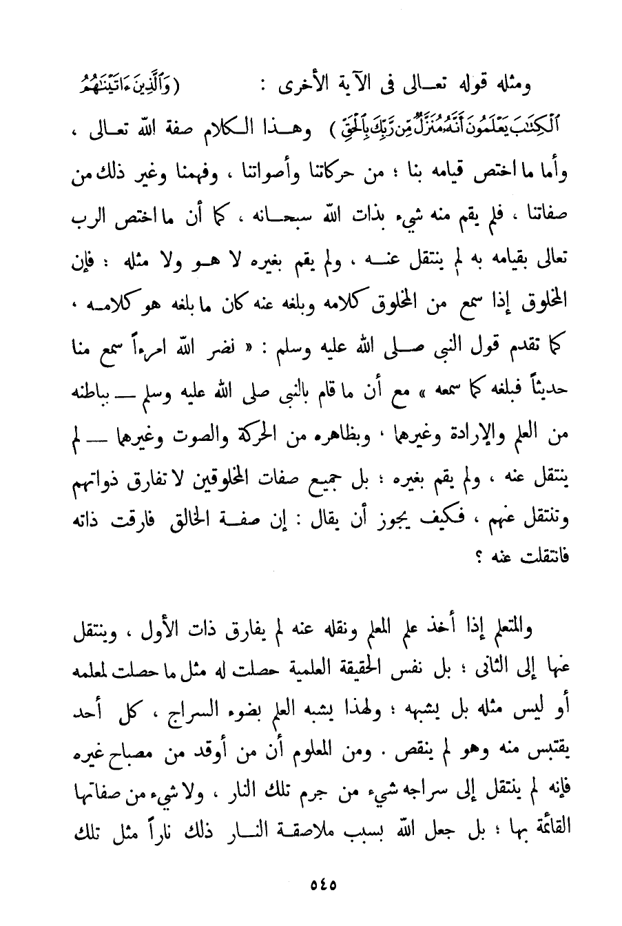 وَمِثْلُهُ قَوْله تَعَالَى فِي الْآيَةِ الْأُخْرَى: {وَالَّذِينَ آتَيْنَاهُمُ الْكِتَابَ يَعْلَمُونَ أَنَّهُ مُنَزَّلٌ مِنْ رَبِّكَ بِالْحَقِّ} وَهَذَا الْكَلَامُ صِفَةُ اللَّهِ تَعَالَى وَأَمَّا مَا اُخْتُصَّ قِيَامُهُ بِنَا؛ مِنْ حَرَكَاتِنَا وَأَصْوَاتِنَا وَفَهْمِنَا وَغَيْرِ ذَلِكَ مِنْ صِفَاتِنَا فَلَمْ يَقُمْ مِنْهُ شَيْءٌ بِذَاتِ اللَّهِ سُبْحَانَهُ كَمَا أَنَّ مَا اخْتَصَّ الرَّبُّ تَعَالَى بِقِيَامِهِ بِهِ لَمْ يَنْتَقِلْ عَنْهُ وَلَمْ يَقُمْ بِغَيْرِهِ لَا هُوَ وَلَا مِثْلُهُ: فَإِنَّ الْمَخْلُوقَ إذَا سَمِعَ مِنْ الْمَخْلُوقِ كَلَامَهُ وَبَلَّغَهُ عَنْهُ كَانَ مَا بَلَّغَهُ هُوَ كَلَامَهُ كَمَا تَقَدَّمَ قَوْلُ النَّبِيِّ صَلَّى اللَّهُ عَلَيْهِ وَسَلَّمَ {: نَضَّرَ اللَّهُ امْرَأَ سَمِعَ مِنَّا حَدِيثًا فَبَلَّغَهُ كَمَا سَمِعَهُ} مَعَ أَنَّ مَا قَامَ بِالنَّبِيِّ صَلَّى اللَّهُ عَلَيْهِ وَسَلَّمَ - بِبَاطِنِهِ مِنْ الْعِلْمِ وَالْإِرَادَةِ وَغَيْرِهِمَا وَبِظَاهِرِهِ مِنْ الْحَرَكَةِ وَالصَّوْتِ وَغَيْرِهِمَا - لَمْ يَنْتَقِلْ عَنْهُ وَلَمْ يَقُمْ بِغَيْرِهِ؛ بَلْ جَمِيعُ صِفَاتِ الْمَخْلُوقِينَ لَا تُفَارِقُ ذَوَاتِهِمْ وَتَنْتَقِلُ عَنْهُمْ فَكَيْفَ يَجُوزُ أَنْ يُقَالَ: إنَّ صِفَةَ الْخَالِقِ فَارَقَتْ ذَاتَه فَانْتَقَلَتْ عَنْهُ؟ وَالْمُتَعَلِّمُ إذَا أَخَذَ عِلْمَ الْمُعَلِّمِ وَنَقَلَهُ عَنْهُ لَمْ يُفَارِقْ ذَاتَ الْأَوَّلِ وَيَنْتَقِلْ عَنْهَا إلَى الثَّانِي؛ بَلْ نَفْسُ الْحَقِيقَةِ الْعِلْمِيَّةِ حَصَلَتْ لَهُ مِثْلَ مَا حَصَلَتْ لِمُعَلِّمِهِ أَوْ لَيْسَ مَثَلَهُ بَلْ يُشْبِهُهُ؛ وَلِهَذَا يُشَبَّهُ الْعِلْمُ بِضَوْءِ السِّرَاجِ كُلُّ أَحَدٍ يَقْتَبِسُ مِنْهُ وَهُوَ لَمْ يَنْقُصْ. وَمِنْ الْمَعْلُومِ أَنَّ مَنْ أَوْقَدَ مِنْ مِصْبَاحِ غَيْرِهِ فَإِنَّهُ لَمْ يَنْتَقِلْ إلَى سِرَاجِهِ شَيْءٌ مِنْ جِرْمِ تِلْكَ النَّارِ وَلَا شَيْءٌ مِنْ صِفَاتِهَا الْقَائِمَةِ بِهَا؛ بَلْ جَعَلَ اللَّهُ بِسَبَبِ مُلَاصَقَةِ النَّارِ ذَلِكَ نَارًا مِثْلَ تِلْكَ