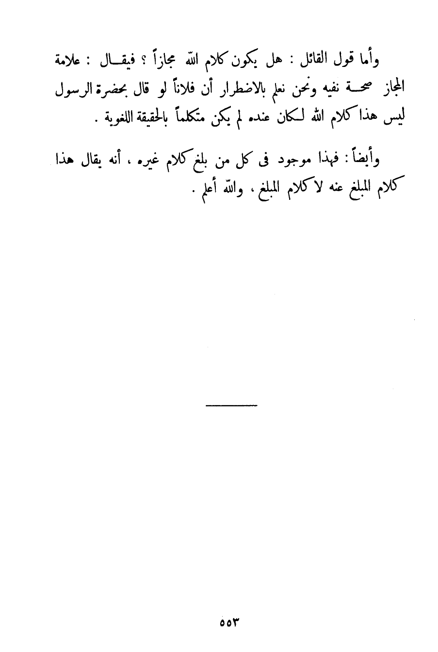 وَأَمَّا قَوْلُ الْقَائِلِ: هَلْ يَكُونُ كَلَامُ اللَّهِ مَجَازًا؟ فَيُقَالُ: عَلَامَةُ الْمَجَازِ صِحَّةُ نَفْيِهِ وَنَحْنُ نَعْلَمُ بِالِاضْطِرَارِ أَنَّ فُلَانًا لَوْ قَالَ بِحَضْرَةِ الرَّسُولِ لَيْسَ هَذَا كَلَامَ اللَّهِ لَكَانَ عِنْدَهُ لَمْ يَكُنْ مُتَكَلِّمًا بِالْحَقِيقَةِ اللُّغَوِيَّةِ. وَأَيْضًا: فَهَذَا مَوْجُودٌ فِي كُلِّ مَنْ بَلَّغَ كَلَامَ غَيْرِهِ أَنَّهُ يُقَالُ هَذَا كَلَامُ الْمُبَلَّغِ عَنْهُ لَا كَلَامُ الْمُبَلِّغِ وَاَللَّهُ أَعْلَمُ.