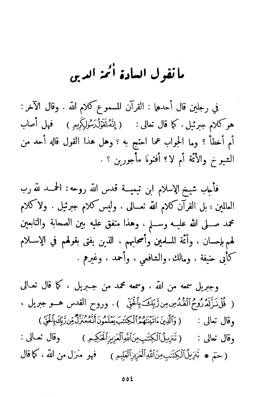الْحَمْدُ لِلَّهِ رَبِّ الْعَالَمِينَ؛ بَلْ الْقُرْآنُ كَلَامُ اللَّهِ تَعَالَى وَلَيْسَ كَلَامَ جِبْرِيلَ. وَلَا كَلَامَ مُحَمَّدٍ صَلَّى اللَّهُ عَلَيْهِ وَسَلَّمَ وَهَذَا مُتَّفَقٌ عَلَيْهِ بَيْنَ الصَّحَابَةِ وَالتَّابِعِينَ لَهُمْ بِإِحْسَانِ وَأَئِمَّةِ الْمُسْلِمِينَ وَأَصْحَابِهِمْ الَّذِينَ يُفْتَى بِقَوْلِهِمْ فِي الْإِسْلَامِ كَأَبِي حَنِيفَةَ وَمَالِكٍ وَالشَّافِعِيِّ وَأَحْمَد وَغَيْرِهِمْ. وَجِبْرِيلُ سَمِعَهُ مِنْ اللَّهِ وَسَمِعَهُ مُحَمَّدٌ مِنْ جِبْرِيلَ كَمَا قَالَ تَعَالَى {قُلْ نَزَّلَهُ رُوحُ الْقُدُسِ مِنْ رَبِّكَ بِالْحَقِّ} . وَرُوحُ الْقُدُسِ هُوَ جِبْرِيلُ وَقَالَ تَعَالَى: {وَالَّذِينَ آتَيْنَاهُمُ الْكِتَابَ يَعْلَمُونَ أَنَّهُ مُنَزَّلٌ مِنْ رَبِّكَ بِالْحَقِّ} وَقَالَ تَعَالَى: {تَنْزِيلُ الْكِتَابِ مِنَ اللَّهِ الْعَزِيزِ الْحَكِيمِ} وَقَالَ تَعَالَى: {حم} {تَنْزِيلُ الْكِتَابِ مِنَ اللَّهِ الْعَزِيزِ الْعَلِيمِ} فَهُوَ مُنَزَّلٌ مِنْ اللَّهِ كَمَا قَالَ