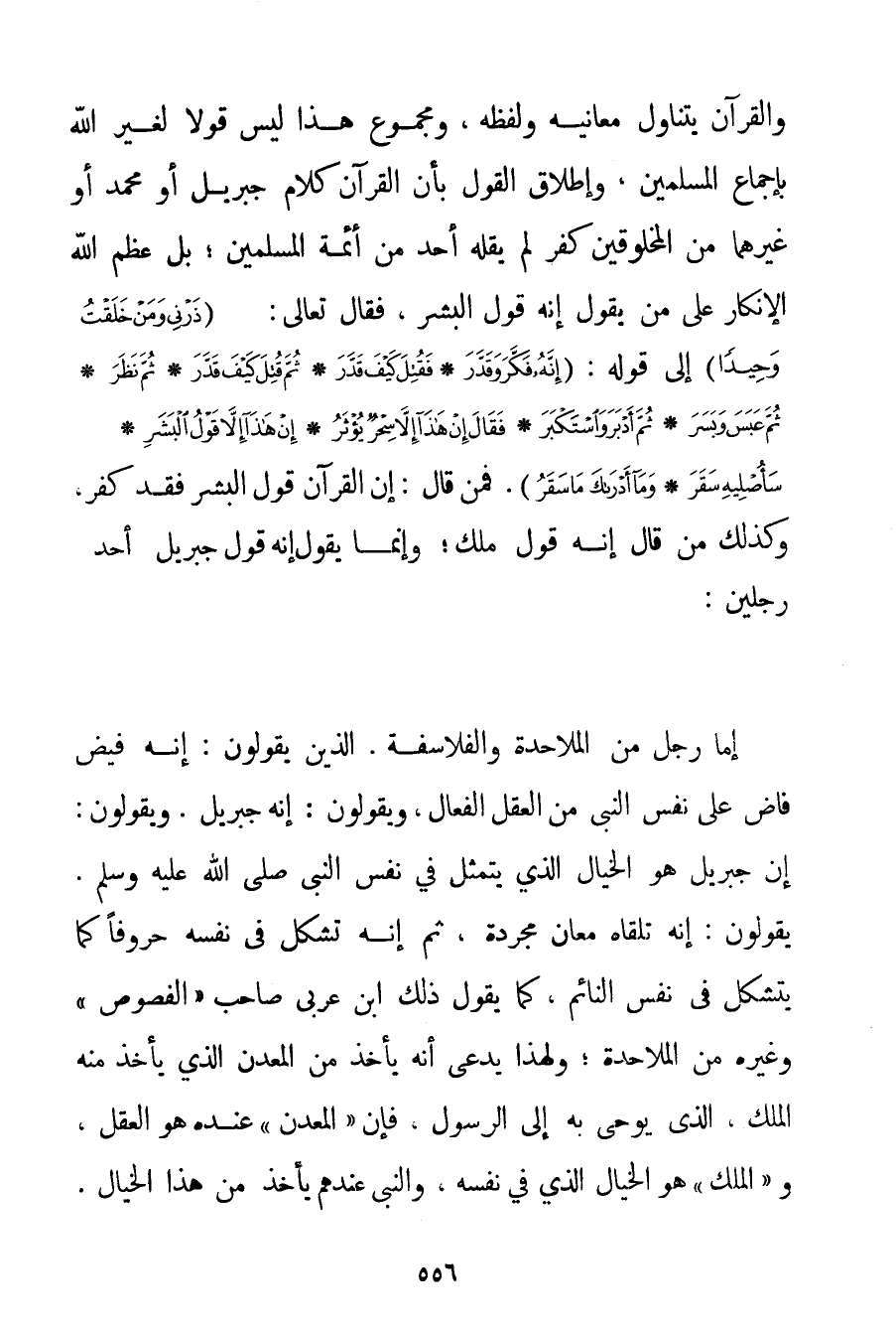 وَالْقُرْآنُ يَتَنَاوَلُ مَعَانِيَهُ وَلَفْظَهُ وَمَجْمُوعُ هَذَا لَيْسَ قَوْلًا لِغَيْرِ اللَّهِ بِإِجْمَاعِ الْمُسْلِمِينَ وَإِطْلَاقُ الْقَوْلِ بِأَنَّ الْقُرْآنَ كَلَامُ جِبْرِيلَ أَوْ مُحَمَّدٍ أَوْ غَيْرِهِمَا مِنْ الْمَخْلُوقِينَ كُفْرٌ لَمْ يَقُلْهُ أَحَدٌ مِنْ أَئِمَّةِ الْمُسْلِمِينَ؛ بَلْ عَظَّمَ اللَّهُ الْإِنْكَارَ عَلَى مَنْ يَقُولُ إنَّهُ قَوْلُ الْبَشَرِ فَقَالَ تَعَالَى: {ذَرْنِي وَمَنْ خَلَقْتُ وَحِيدًا} إلَى قَوْلِهِ: {إنَّهُ فَكَّرَ وَقَدَّرَ} {فَقُتِلَ كَيْفَ قَدَّرَ} {ثُمَّ قُتِلَ كَيْفَ قَدَّرَ} {ثُمَّ نَظَرَ} {ثُمَّ عَبَسَ وَبَسَرَ} {ثُمَّ أَدْبَرَ وَاسْتَكْبَرَ} {فَقَالَ إنْ هَذَا إلَّا سِحْرٌ يُؤْثَرُ} {إنْ هَذَا إلَّا قَوْلُ الْبَشَرِ} {سَأُصْلِيهِ سَقَرَ} {وَمَا أَدْرَاكَ مَا سَقَرُ} . فَمَنْ قَالَ: إنَّ الْقُرْآنَ قَوْلُ الْبَشَرِ فَقَدْ كَفَرَ وَكَذَلِكَ مَنْ قَالَ إنَّهُ قَوْلُ مَلَكٍ؛ وَإِنَّمَا يَقُولُ إنَّهُ قَوْلُ جِبْرِيلَ أَحَدُ رَجُلَيْنِ: إمَّا رَجُلٌ مِنْ الْمَلَاحِدَةِ وَالْفَلَاسِفَةِ. الَّذِينَ يَقُولُونَ: إنَّهُ فَيْضٌ فَاضَ عَلَى نَفْسِ النَّبِيِّ مِنْ الْعَقْلِ الْفَعَّالِ وَيَقُولُونَ: إنَّهُ جِبْرِيلُ. وَيَقُولُونَ: إنَّ جِبْرِيلَ هُوَ الْخَيَالُ الَّذِي يَتَمَثَّلُ فِي نَفْسِ النَّبِيِّ صَلَّى اللَّهُ عَلَيْهِ وَسَلَّمَ. يَقُولُونَ: إنَّهُ تَلَقَّاهُ مَعَانٍ مُجَرَّدَةً ثُمَّ إنَّهُ تَشَكَّلَ فِي نَفْسِهِ حُرُوفًا كَمَا يَتَشَكَّلُ فِي نَفْسِ النَّائِمِ كَمَا يَقُولُ ذَلِكَ ابْنُ عَرَبِيٍّ صَاحِبُ " الْفُصُوصِ " وَغَيْرُهُ مِنْ الْمَلَاحِدَةِ؛ وَلِهَذَا يَدَّعِي أَنَّهُ يَأْخُذُ مِنْ الْمَعْدِنِ الَّذِي يَأْخُذُ مِنْهُ الْمَلَكُ الَّذِي يُوحِي بِهِ إلَى الرَّسُولِ فَإِنَّ " الْمَعْدِنَ " عِنْدَهُ هُوَ الْعَقْلُ وَ " الْمَلَكُ " هُوَ الْخَيَالُ الَّذِي فِي نَفْسِهِ وَالنَّبِيُّ عِنْدَهُمْ يَأْخُذُ مِنْ هَذَا الْخَيَالِ.