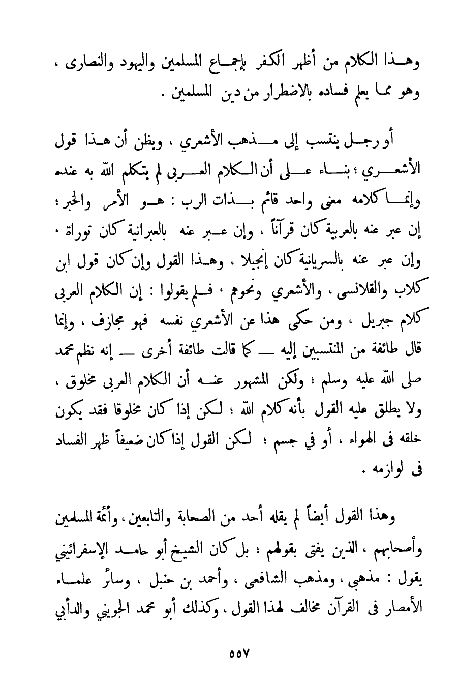 وَهَذَا الْكَلَامُ مَنْ أَظْهَرِ الْكُفْرِ بِإِجْمَاعِ الْمُسْلِمِينَ وَالْيَهُودِ وَالنَّصَارَى وَهُوَ مِمَّا يُعْلَمُ فَسَادُهُ بِالِاضْطِرَارِ مِنْ دِينِ الْمُسْلِمِينَ. أَوْ رَجُلٌ يَنْتَسِبُ إلَى مَذْهَبِ الْأَشْعَرِيِّ وَيَظُنُّ أَنَّ هَذَا قَوْلُ الْأَشْعَرِيِّ؛ بِنَاءً عَلَى أَنَّ الْكَلَامَ الْعَرَبِيَّ لَمْ يَتَكَلَّمْ اللَّهُ بِهِ عِنْدَهُ وَإِنَّمَا كَلَامُهُ مَعْنًى وَاحِدٌ قَائِمٌ بِذَاتِ الرَّبِّ: هُوَ الْأَمْرُ وَالْخَبَرُ؛ إنْ عُبِّرَ عَنْهُ بِالْعَرَبِيَّةِ كَانَ قُرْآنًا وَإِنْ عُبِّرَ عَنْهُ بالعبرانية كَانَ تَوْرَاةً وَإِنْ عُبِّرَ عَنْهُ بالسريانية كَانَ إنْجِيلًا وَهَذَا الْقَوْلُ وَإِنْ كَانَ قَوْلُ ابْنِ كُلَّابٍ والقلانسي وَالْأَشْعَرِيِّ وَنَحْوِهِمْ فَلَمْ يَقُولُوا: إنَّ الْكَلَامَ الْعَرَبِيَّ كَلَامُ جِبْرِيلَ وَمَنْ حَكَى هَذَا عَنْ الْأَشْعَرِيِّ نَفْسِهِ فَهُوَ مُجَازِفٌ وَإِنَّمَا قَالَ طَائِفَةٌ مِنْ الْمُنْتَسِبِينَ إلَيْهِ - كَمَا قَالَتْ طَائِفَةٌ أُخْرَى - إنَّهُ نَظْمُ مُحَمَّدٍ صَلَّى اللَّهُ عَلَيْهِ وَسَلَّمَ وَلَكِنَّ الْمَشْهُورَ عَنْهُ أَنَّ الْكَلَامَ الْعَرَبِيَّ مَخْلُوقٌ وَلَا يُطْلَقُ عَلَيْهِ الْقَوْلُ بِأَنَّهُ كَلَامُ اللَّهِ؛ لَكِنْ إذَا كَانَ مَخْلُوقًا فَقَدْ يَكُونُ خَلَقَهُ فِي الْهَوَاءِ أَوْ فِي جِسْمٍ؛ لَكِنَّ الْقَوْلَ إذَا كَانَ ضَعِيفًا ظَهَرَ الْفَسَادُ فِي لَوَازِمِهِ. وَهَذَا الْقَوْلُ أَيْضًا لَمْ يَقُلْهُ أَحَدٌ مِنْ الصَّحَابَةِ وَالتَّابِعِينَ وَأَئِمَّةِ الْمُسْلِمِينَ وَأَصْحَابِهِمْ الَّذِينَ يُفْتَى بِقَوْلِهِمْ: بَلْ كَانَ الشَّيْخُ أَبُو حَامِدٍ الإسفراييني يَقُولُ: مَذْهَبِي وَمَذْهَبُ الشَّافِعِيِّ وَأَحْمَد بْنِ حَنْبَلٍ وَسَائِر عُلَمَاءِ الْأَمْصَارِ فِي الْقُرْآنِ مُخَالِفٌ لِهَذَا الْقَوْلِ وَكَذَلِكَ أَبُو مُحَمَّدٍ الجُوَيْنِي - وَالِدُ أَبِي