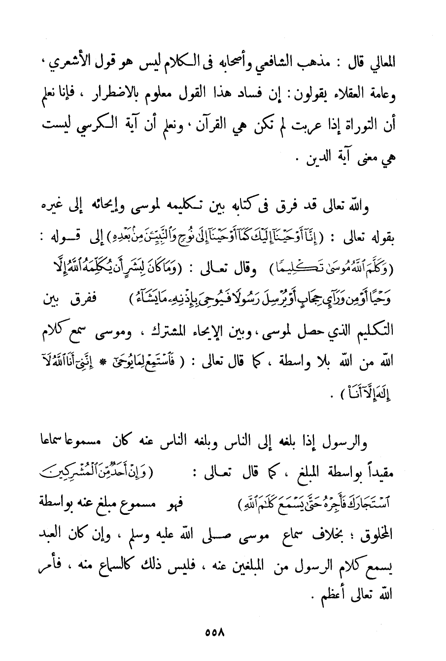 الْمَعَالِي - قَالَ: مَذْهَبُ الشَّافِعِيِّ وَأَصْحَابِهِ فِي الْكَلَامِ لَيْسَ هُوَ قَوْلَ الْأَشْعَرِيِّ وَعَامَّةِ الْعُقَلَاءِ يَقُولُونَ: إنَّ فَسَادَ هَذَا الْقَوْلِ مَعْلُومٌ بِالِاضْطِرَارِ فَإِنَّا نَعْلَمُ أَنَّ التَّوْرَاةَ إذَا عُرِّبَتْ لَمْ تَكُنْ هِيَ الْقُرْآنَ وَنَعْلَمُ أَنَّ آيَةَ الْكُرْسِيِّ لَيْسَتْ هِيَ مَعْنَى آيَةِ الدَّيْنِ. وَاَللَّهُ تَعَالَى قَدْ فَرَّقَ فِي كِتَابِهِ بَيْنَ تَكْلِيمِهِ لِمُوسَى وَإِيحَائِهِ إلَى غَيْرِهِ بِقَوْلِهِ تَعَالَى: {إنَّا أَوْحَيْنَا إلَيْكَ كَمَا أَوْحَيْنَا إلَى نُوحٍ وَالنَّبِيِّينَ مِنْ بَعْدِهِ} إلَى قَوْلِهِ: {وَكَلَّمَ اللَّهُ مُوسَى تَكْلِيمًا} وَقَالَ تَعَالَى: {وَمَا كَانَ لِبَشَرٍ أَنْ يُكَلِّمَهُ اللَّهُ إلَّا وَحْيًا أَوْ مِنْ وَرَاءِ حِجَابٍ أَوْ يُرْسِلَ رَسُولًا فَيُوحِيَ بِإِذْنِهِ مَا يَشَاءُ} فَفَرَّقَ بَيْنَ التَّكْلِيمِ الَّذِي حَصَلَ لِمُوسَى وَبَيْنَ الْإِيحَاءِ الْمُشْتَرَكِ وَمُوسَى سَمِعَ كَلَامَ اللَّهِ مِنْ اللَّهِ بِلَا وَاسِطَةٍ كَمَا قَالَ تَعَالَى. {فَاسْتَمِعْ لِمَا يُوحَى} {إنَّنِي أَنَا اللَّهُ لَا إلَهَ إلَّا أَنَا} . وَالرَّسُولُ إذَا بَلَّغَهُ إلَى النَّاسِ وَبَلَّغَهُ النَّاسُ عَنْهُ كَانَ مَسْمُوعًا سَمَاعًا مُقَيَّدًا بِوَاسِطَةِ الْمُبَلِّغِ كَمَا قَالَ تَعَالَى: {وَإِنْ أَحَدٌ مِنَ الْمُشْرِكِينَ اسْتَجَارَكَ فَأَجِرْهُ حَتَّى يَسْمَعَ كَلَامَ اللَّهِ} فَهُوَ مَسْمُوعٌ مُبَلَّغٌ عَنْهُ بِوَاسِطَةِ الْمَخْلُوقِ؛ بِخِلَافِ سَمَاعِ مُوسَى صَلَّى اللَّهُ عَلَيْهِ وَسَلَّمَ وَإِنْ كَانَ الْعَبْدُ يَسْمَعُ كَلَامَ الرَّسُولِ مِنْ الْمُبَلِّغِينَ عَنْهُ فَلَيْسَ ذَلِكَ كَالسَّمَاعِ مِنْهُ فَأَمْرُ اللَّهِ تَعَالَى أَعْظَمُ.