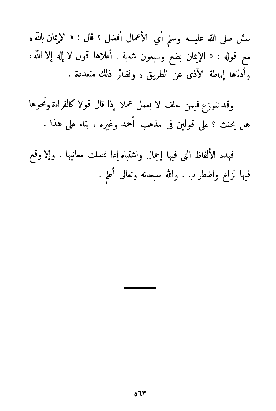 {سُئِلَ صَلَّى اللَّهُ عَلَيْهِ وَسَلَّمَ أَيُّ الْأَعْمَالِ أَفْضَلُ؟ قَالَ: الْإِيمَانُ بِاَللَّهِ} مَعَ قَوْلِهِ: {الْإِيمَانُ بِضْعٌ وَسَبْعُونَ شُعْبَةً أَعْلَاهَا قَوْلُ لَا إلَهَ إلَّا اللَّهُ؛ وَأَدْنَاهَا إمَاطَةُ الْأَذَى عَنْ الطَّرِيقِ} وَنَظَائِرُ ذَلِكَ مُتَعَدِّدَةٌ. وَقَدْ تُنُوزِعَ فِيمَنْ حَلَفَ لَا يَعْمَلُ عَمَلًا إذَا قَالَ قَوْلًا كَالْقِرَاءَةِ وَنَحْوِهَا هَلْ يَحْنَثُ؟ عَلَى قَوْلَيْنِ فِي مَذْهَبِ أَحْمَد وَغَيْرِهِ بِنَاءً عَلَى هَذَا. فَهَذِهِ الْأَلْفَاظُ الَّتِي فِيهَا إجْمَالٌ وَاشْتِبَاهٌ إذَا فُصِّلَتْ مَعَانِيهَا. وَإِلَّا وَقَعَ فِيهَا نِزَاعٌ وَاضْطِرَابٌ. وَاَللَّهُ سُبْحَانَهُ وَتَعَالَى أَعْلَمُ.