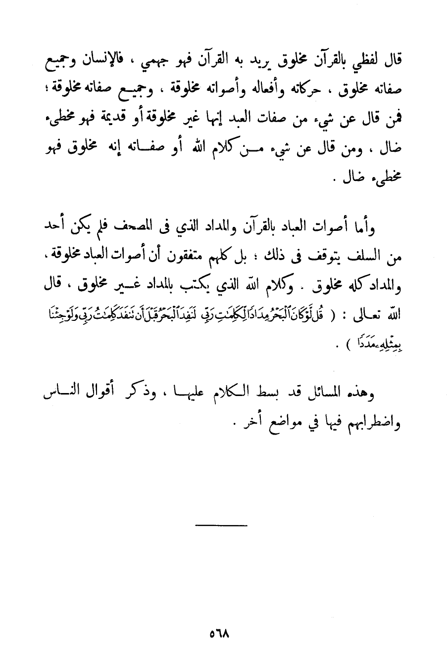 قَالَ لَفْظِي بِالْقُرْآنِ مَخْلُوقٌ يُرِيدُ بِهِ الْقُرْآنَ فَهُوَ جهمي فَالْإِنْسَانُ وَجَمِيعُ صِفَاتِهِ مَخْلُوقٌ حَرَكَاتُهُ وَأَفْعَالُهُ وَأَصْوَاتُهُ مَخْلُوقَةٌ وَجَمِيعُ صِفَاتِهِ مَخْلُوقَةٌ؛ فَمَنْ قَالَ عَنْ شَيْءٍ مِنْ صِفَاتِ الْعَبْدِ إنَّهَا غَيْرُ مَخْلُوقَةٍ أَوْ قَدِيمَةٌ فَهُوَ مُخْطِئٌ ضَالٌّ وَمَنْ قَالَ عَنْ شَيْءٍ مِنْ كَلَام اللَّهِ أَوْ صِفَاتِهِ إنَّهُ مَخْلُوقٌ فَهُوَ مُخْطِئٌ ضَالٌّ. وَأَمَّا أَصْوَاتُ الْعِبَادِ بِالْقُرْآنِ وَالْمِدَادِ الَّذِي فِي الْمُصْحَفِ فَلَمْ يَكُنْ أَحَدٌ مِنْ السَّلَفِ يَتَوَقَّفُ فِي ذَلِكَ؛ بَلْ كُلُّهُمْ مُتَّفِقُونَ أَنَّ أَصْوَاتَ الْعِبَادِ مَخْلُوقَةٌ وَالْمِدَادَ كُلَّهُ مَخْلُوقٌ وَكَلَامُ اللَّهِ الَّذِي يُكْتَبُ بِالْمِدَادِ غَيْرُ مَخْلُوقٍ قَالَ اللَّهُ تَعَالَى: {قُلْ لَوْ كَانَ الْبَحْرُ مِدَادًا لِكَلِمَاتِ رَبِّي لَنَفِدَ الْبَحْرُ قَبْلَ أَنْ تَنْفَدَ كَلِمَاتُ رَبِّي وَلَوْ جِئْنَا بِمِثْلِهِ مَدَدًا} . وَهَذِهِ الْمَسَائِلُ قَدْ بُسِطَ الْكَلَامُ عَلَيْهَا وَذُكِرَ أَقْوَالُ النَّاسِ وَاضْطِرَابُهُمْ فِيهَا فِي مَوَاضِعَ أُخَرَ.