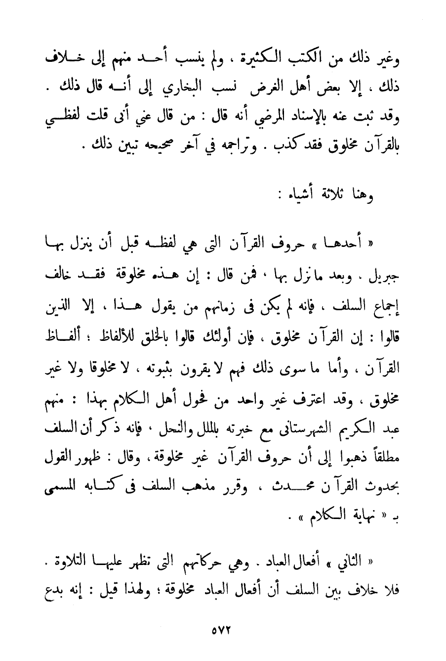 وَغَيْرِ ذَلِكَ مِنْ الْكُتُبِ الْكَثِيرَةِ وَلَمْ يُنْسَبْ أَحَدٌ مِنْهُمْ إلَى خِلَافِ ذَلِكَ إلَّا بَعْضُ أَهْلِ الْغَرَضِ نَسَبَ الْبُخَارِيَّ إلَى أَنَّهُ قَالَ ذَلِكَ. وَقَدْ ثَبَتَ عَنْهُ بِالْإِسْنَادِ الْمَرَضِيِّ أَنَّهُ قَالَ: مَنْ قَالَ عَنِّي أَنِّي قُلْت لَفْظِي بِالْقُرْآنِ مَخْلُوقٌ فَقَدْ كَذَبَ. وَتَرَاجِمُهُ فِي آخِرِ صَحِيحِهِ تُبَيِّنُ ذَلِكَ. وَهُنَا ثَلَاثَةُ أَشْيَاءَ: " أَحَدُهَا " حُرُوفُ الْقُرْآنِ الَّتِي هِيَ لَفْظُهُ قَبْلَ أَنْ يَنْزِلَ بِهَا جِبْرِيلُ وَبَعْدَ مَا نَزَلَ بِهَا فَمَنْ قَالَ: إنَّ هَذِهِ مَخْلُوقَةٌ فَقَدْ خَالَفَ إجْمَاعَ السَّلَفِ فَإِنَّهُ لَمْ يَكُنْ فِي زَمَانِهِمْ مَنْ يَقُولُ هَذَا إلَّا الَّذِينَ قَالُوا. إنَّ الْقُرْآنَ مَخْلُوقٌ فَإِنَّ أُولَئِكَ قَالُوا بِالْخَلْقِ لِلْأَلْفَاظِ؛ أَلْفَاظِ الْقُرْآنِ وَأَمَّا مَا سِوَى ذَلِكَ فَهُمْ لَا يُقِرُّونَ بِثُبُوتِهِ لَا مَخْلُوقًا وَلَا غَيْرَ مَخْلُوقٍ وَقَدْ اعْتَرَفَ غَيْرُ وَاحِدٍ مِنْ فُحُولِ أَهْلِ الْكَلَامِ بِهَذَا: مِنْهُمْ عَبْدُ الْكَرِيمِ الشَّهْرَستَانِي مَعَ خِبْرَتِهِ بِالْمِلَلِ وَالنِّحَلِ فَإِنَّهُ ذَكَرَ أَنَّ السَّلَفَ مُطْلَقًا ذَهَبُوا إلَى أَنَّ حُرُوفَ الْقُرْآنِ غَيْرُ مَخْلُوقَةٍ وَقَالَ: ظُهُورُ الْقَوْلِ بِحُدُوثِ الْقُرْآنِ مُحْدَثٌ وَقَرَّرَ مَذْهَبَ السَّلَفِ فِي كِتَابِهِ الْمُسَمَّى بِ " نِهَايَةِ الْكَلَامِ ". " الثَّانِي " أَفْعَالُ الْعِبَادِ وَهِيَ حَرَكَاتُهُمْ الَّتِي تَظْهَرُ عَلَيْهَا التِّلَاوَةُ. فَلَا خِلَافَ بَيْنَ السَّلَفِ أَنَّ أَفْعَالَ الْعِبَادِ مَخْلُوفَةٌ؛ وَلِهَذَا قِيلَ: إنَّهُ بَدَّعَ