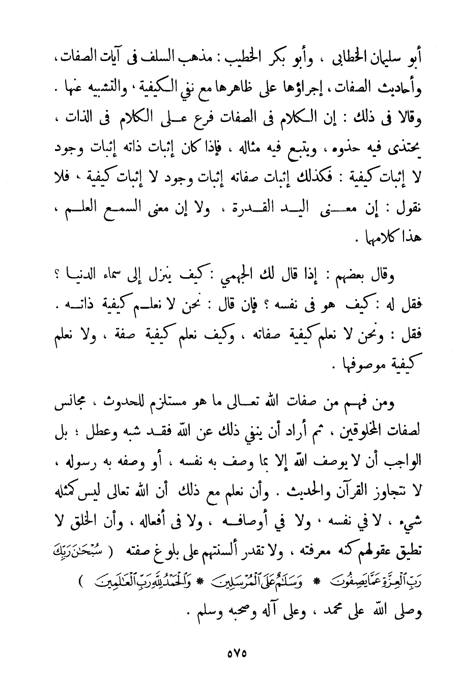 أَبُو سُلَيْمَانَ الخطابي وَأَبُو بَكْرٍ الْخَطِيبُ: مَذْهَبُ السَّلَفِ فِي آيَاتِ الصِّفَاتِ وَأَحَادِيثِ الصِّفَاتِ إجْرَاؤُهَا عَلَى ظَاهِرِهَا مَعَ نَفْيِ الْكَيْفِيَّةِ وَالتَّشْبِيهِ عَنْهَا. وَقَالَا فِي ذَلِكَ: إنَّ الْكَلَامَ فِي الصِّفَاتِ فَرْعٌ عَلَى الْكَلَامِ فِي الذَّاتِ يُحْتَذَى فِيهِ حَذْوَهُ وَيُتَّبَعُ فِيهِ مِثَالَهُ فَإِذَا كَانَ إثْبَاتُ ذَاتِهِ إثْبَاتَ وُجُودٍ لَا إثْبَاتَ كَيْفِيَّةٍ: فَكَذَلِكَ إثْبَاتُ صِفَاتِهِ إثْبَاتُ وُجُودٍ لَا إثْبَاتُ كَيْفِيَّةٍ فَلَا نَقُولُ: إنَّ مَعْنَى الْيَدِ الْقُدْرَةُ وَلَا إنَّ مَعْنَى السَّمْعِ الْعِلْمُ هَذَا كَلَامُهُمَا. وَقَالَ بَعْضُهُمْ: إذَا قَالَ لَك الجهمي: كَيْفَ يَنْزِلُ إلَى سَمَاءِ الدُّنْيَا؟ فَقُلْ لَهُ: كَيْفَ هُوَ فِي نَفْسِهِ؟ فَإِنْ قَالَ: نَحْنُ لَا نَعْلَمُ كَيْفِيَّةَ ذَاتِهِ. فَقُلْ: وَنَحْنُ لَا نَعْلَمُ كَيْفِيَّةَ صِفَاتِهِ وَكَيْفَ نَعْلَمُ كَيْفِيَّةَ صِفَةٍ وَلَا نَعْلَمُ كَيْفِيَّةَ مَوْصُوفِهَا. وَمَنْ فَهِمَ مِنْ صِفَاتِ اللَّهِ تَعَالَى مَا هُوَ مُسْتَلْزِمٌ لِلْحُدُوثِ مُجَانِسٌ لِصِفَاتِ الْمَخْلُوقِينَ ثُمَّ أَرَادَ أَنْ يَنْفِيَ ذَلِكَ عَنْ اللَّهِ فَقَدْ شَبَّهَ وَعَطَّلَ؛ بَلْ الْوَاجِبُ أَنْ لَا يُوصَفَ اللَّهُ إلَّا بِمَا وَصَفَ بِهِ نَفْسَهُ أَوْ وَصَفَهُ بِهِ رَسُولُهُ لَا نَتَجَاوَزُ الْقُرْآنَ وَالْحَدِيثَ. وَأَنْ نَعْلَمَ مَعَ ذَلِكَ أَنَّ اللَّهَ تَعَالَى لَيْسَ كَمِثْلِهِ شَيْءٌ لَا فِي نَفْسِهِ وَلَا فِي أَوْصَافِهِ وَلَا فِي أَفْعَالِهِ وَأَنَّ الْخَلْقَ لَا تُطِيقُ عُقُولُهُمْ كُنْهَ مَعْرِفَتِهِ وَلَا تَقْدِرُ أَلْسِنَتُهُمْ عَلَى بُلُوغِ صِفَتِهِ {سُبْحَانَ رَبِّكَ رَبِّ الْعِزَّةِ عَمَّا يَصِفُونَ} {وَسَلَامٌ عَلَى الْمُرْسَلِينَ} {وَالْحَمْدُ لِلَّهِ رَبِّ الْعَالَمِينَ} وَصَلَّى اللَّهُ عَلَى مُحَمَّدٍ وَعَلَى آلِهِ وَصَحْبِهِ وَسَلَّمَ.