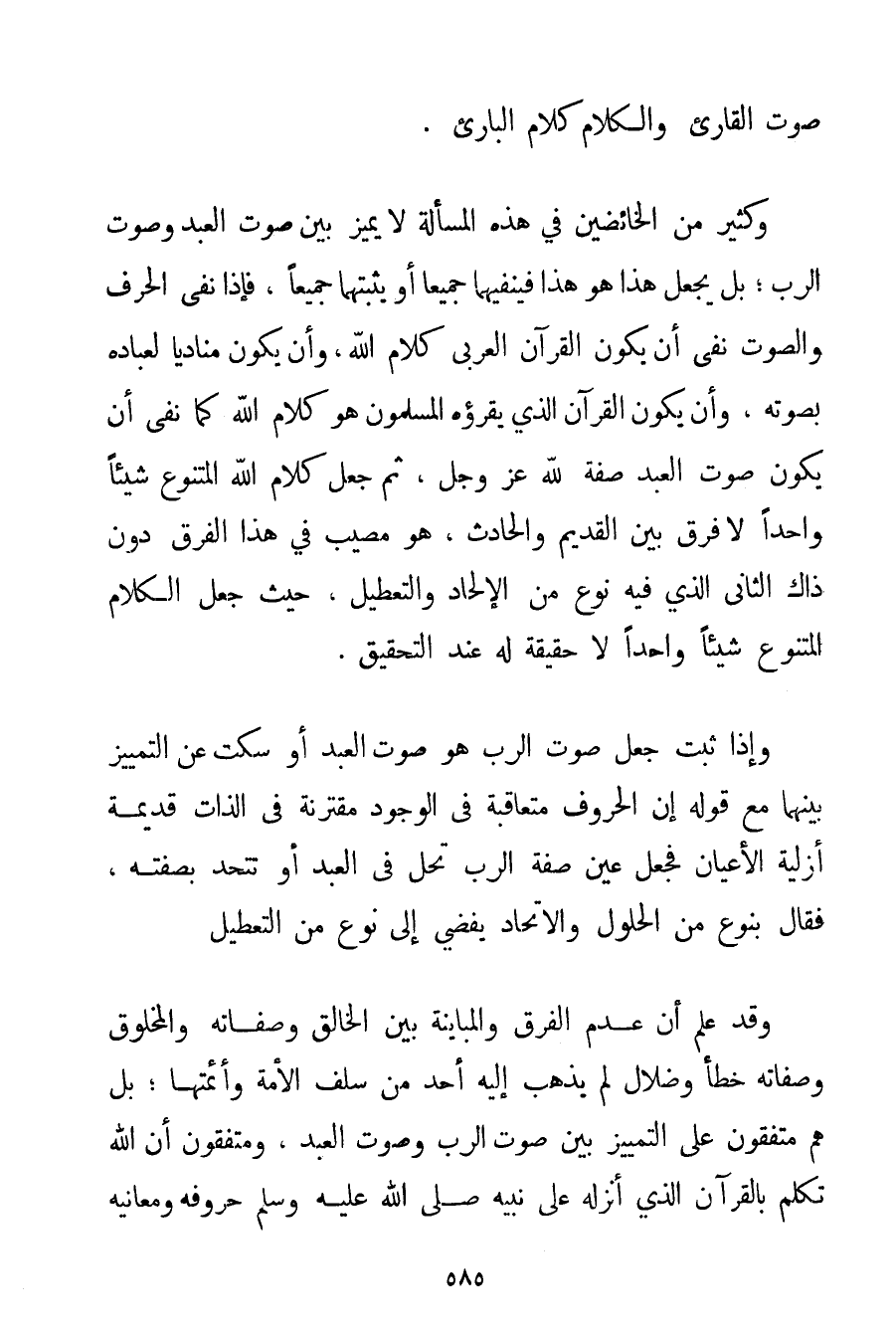 صَوْتُ الْقَارِئِ وَالْكَلَامُ كَلَامُ الْبَارِئِ. وَكَثِيرٌ مِنْ الْخَائِضِينَ فِي هَذِهِ الْمَسْأَلَةِ لَا يُمَيِّزُ بَيْنَ صَوْتِ الْعَبْدِ وَصَوْتِ الرَّبِّ؛ بَلْ يَجْعَلُ هَذَا هُوَ هَذَا فَيَنْفِيهِمَا جَمِيعًا أَوْ يُثْبِتُهُمَا جَمِيعًا فَإِذَا نَفَى الْحَرْفَ وَالصَّوْتَ نَفَى أَنْ يَكُونَ الْقُرْآنُ الْعَرَبِيُّ كَلَامَ اللَّهِ وَأَنْ يَكُونَ مُنَادِيًا لِعِبَادِهِ بِصَوْتِهِ وَأَنْ يَكُونَ الْقُرْآنُ الَّذِي يَقْرَؤُهُ الْمُسْلِمُونَ هُوَ كَلَامُ اللَّهِ كَمَا نَفَى أَنْ يَكُونَ صَوْتُ الْعَبْدِ صِفَةً لِلَّهِ عَزَّ وَجَلَّ ثُمَّ جَعَلَ كَلَامَ اللَّهِ الْمُتَنَوِّعَ شَيْئًا وَاحِدًا لَا فَرْقَ بَيْنَ الْقَدِيمِ وَالْحَادِثِ هُوَ مُصِيبٌ فِي هَذَا الْفَرْقِ دُونَ ذَاكَ الثَّانِي الَّذِي فِيهِ نَوْعٌ مِنْ الْإِلْحَادِ وَالتَّعْطِيلِ حَيْثُ جَعَلَ الْكَلَامَ الْمُتَنَوِّعَ شَيْئًا وَاحِدًا لَا حَقِيقَةَ لَهُ عِنْدَ التَّحْقِيقِ. وَإِذَا ثَبَتَ جَعْلُ صَوْتِ الرَّبِّ هُوَ صَوْتَ الْعَبْدِ أَوْ سَكَتَ عَنْ التَّمْيِيزِ بَيْنَهُمَا مَعَ قَوْلِهِ إنَّ الْحُرُوفَ مُتَعَاقِبَةٌ فِي الْوُجُودِ مُقْتَرِنَةٌ فِي الذَّاتِ قَدِيمَةٌ أَزَلِيَّةُ الْأَعْيَانِ فَجَعَلَ عَيْنَ صِفَةِ الرَّبِّ تَحِلُّ فِي الْعَبْدِ أَوْ تَتَّحِدُ بِصِفَتِهِ فَقَالَ بِنَوْعِ مِنْ الْحُلُولِ وَالِاتِّحَادِ يُفْضِي إلَى نَوْعٍ مِنْ التَّعْطِيلِ. وَقَدْ عُلِمَ أَنَّ عَدَمَ الْفَرْقِ وَالْمُبَايَنَةِ بَيْنَ الْخَالِقِ وَصِفَاتِهِ وَالْمَخْلُوقِ وَصِفَاتِهِ خَطَأٌ وَضَلَالٌ لَمْ يَذْهَبْ إلَيْهِ أَحَدٌ مِنْ سَلَفِ الْأُمَّةِ وَأَئِمَّتِهَا؛ بَلْ هُمْ مُتَّفِقُونَ عَلَى التَّمْيِيزِ بَيْنَ صَوْتِ الرَّبِّ وَصَوْتِ الْعَبْدِ وَمُتَّفِقُونَ أَنَّ اللَّهَ تَكَلَّمَ بِالْقُرْآنِ الَّذِي أَنْزَلَهُ عَلَى نَبِيِّهِ صَلَّى اللَّهُ عَلَيْهِ وَسَلَّمَ حُرُوفَهُ وَمَعَانِيَهُ