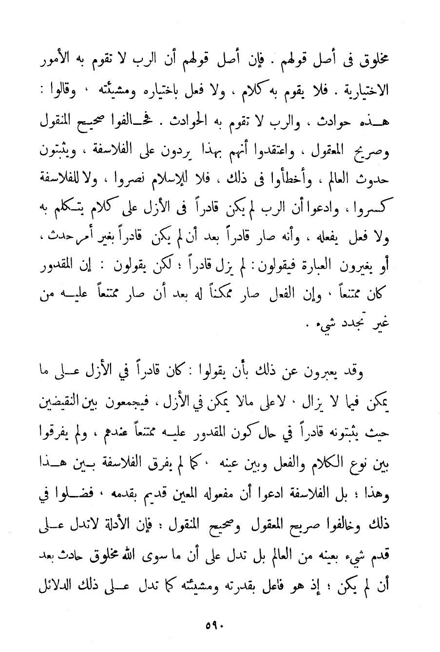 مَخْلُوقٌ فِي أَصْلِ قَوْلِهِمْ. فَإِنَّ أَصْلَ قَوْلِهِمْ أَنَّ الرَّبَّ لَا تَقُومُ بِهِ الْأُمُورُ الِاخْتِيَارِيَّةُ. فَلَا يَقُومُ بِهِ كَلَامٌ وَلَا فِعْلٌ بِاخْتِيَارِهِ وَمَشِيئَتِهِ وَقَالُوا: هَذِهِ حَوَادِثُ وَالرَّبُّ لَا تَقُومُ بِهِ الْحَوَادِثُ. فَخَالَفُوا صَحِيحَ الْمَنْقُولِ وَصَرِيحَ الْمَعْقُولِ وَاعْتَقَدُوا أَنَّهُمْ بِهَذَا يَرُدُّونَ عَلَى الْفَلَاسِفَةِ وَيُثْبِتُونَ حُدُوثَ الْعَالَمِ وَأَخْطَئُوا فِي ذَلِكَ فَلَا لِلْإِسْلَامِ نَصَرُوا وَلَا لِلْفَلَاسِفَةِ كَسَرُوا وَادَّعَوْا أَنَّ الرَّبَّ لَمْ يَكُنْ قَادِرًا فِي الْأَزَلِ عَلَى كَلَامٍ يَتَكَلَّمُ بِهِ وَلَا فِعْلٍ يَفْعَلُهُ وَأَنَّهُ صَارَ قَادِرًا بَعْدَ أَنْ لَمْ يَكُنْ قَادِرًا بِغَيْرِ أَمْرٍ حَدَثَ أَوْ يُغَيِّرُونَ الْعِبَارَةَ فَيَقُولُونَ. لَمْ يَزَلْ قَادِرًا؛ لَكِنْ يَقُولُونَ: إنَّ الْمَقْدُورَ كَانَ مُمْتَنِعًا وَإِنَّ الْفِعْلَ صَارَ مُمْكِنًا لَهُ بَعْدَ أَنْ صَارَ مُمْتَنِعًا عَلَيْهِ مِنْ غَيْرِ تَجَدُّدِ شَيْءٍ. وَقَدْ يُعَبِّرُونَ عَنْ ذَلِكَ بِأَنْ يَقُولُوا: كَانَ قَادِرًا فِي الْأَزَلِ عَلَى مَا يُمْكِنُ فِيمَا لَا يَزَالُ لَا عَلَى مَا لَا يُمْكِنُ فِي الْأَزَلِ فَيَجْمَعُونَ بَيْنَ النَّقِيضَيْنِ حَيْثُ يُثْبِتُونَهُ قَادِرًا فِي حَالِ كَوْنِ الْمَقْدُورِ عَلَيْهِ مُمْتَنِعًا عِنْدَهُمْ وَلَمْ يُفَرِّقُوا بَيْنَ نَوْعِ الْكَلَامِ وَالْفِعْلِ وَبَيْنَ عَيْنِهِ كَمَا لَمْ يُفَرِّقْ الْفَلَاسِفَةُ بَيْنَ هَذَا وَهَذَا؛ بَلْ الْفَلَاسِفَةُ ادَّعَوْا أَنَّ مَفْعُولَهُ الْمُعَيَّنَ قَدِيمٌ بِقِدَمِهِ فَضَلُّوا فِي ذَلِكَ وَخَالَفُوا صَرِيحَ الْمَعْقُولِ وَصَحِيحَ الْمَنْقُولِ؛ فَإِنَّ الْأَدِلَّةَ لَا تَدُلُّ عَلَى قِدَمِ شَيْءٍ بِعَيْنِهِ مِنْ الْعَالَمِ بَلْ تَدُلُّ عَلَى أَنَّ مَا سِوَى اللَّهِ مَخْلُوقٌ حَادِثٌ بَعْدَ أَنْ لَمْ يَكُنْ؛ إذْ هُوَ فَاعِلٌ بِقُدْرَتِهِ وَمَشِيئَتِهِ كَمَا تَدُلُّ عَلَى ذَلِكَ الدَّلَائِلُ