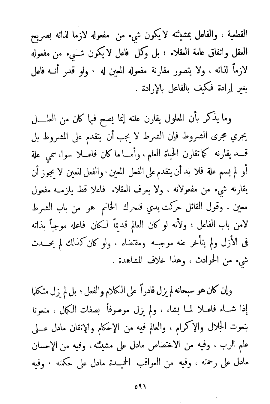 الْقَطْعِيَّةُ وَالْفَاعِلُ بِمَشِيئَتِهِ لَا يَكُونُ شَيْءٌ مِنْ مَفْعُولِهِ لَازِمًا لِذَاتِهِ بِصَرِيحِ الْعَقْلِ وَاتِّفَاقِ عَامَّةِ الْعُقَلَاءِ. بَلْ وَكُلُّ فَاعِلٍ لَا يَكُونُ شَيْءٌ مِنْ مَفْعُولِهِ لَازِمًا لِذَاتِهِ وَلَا يُتَصَوَّرُ مُقَارَنَةُ مَفْعُولِهِ الْمُعَيَّنِ لَهُ وَلَوْ قُدِّرَ أَنَّهُ فَاعِلٌ بِغَيْرِ إرَادَةٍ فَكَيْفَ بِالْفَاعِلِ بِالْإِرَادَةِ. وَمَا يُذْكَرُ بِأَنَّ الْمَعْلُولَ يُقَارِنُ عِلَّتَهُ إنَّمَا يَصِحُّ فِيمَا كَانَ مِنْ الْعِلَلِ يَجْرِي مَجْرَى الشُّرُوطِ فَإِنَّ الشَّرْطَ لَا يَجِبُ أَنْ يَتَقَدَّمَ عَلَى الْمَشْرُوطِ بَلْ قَدْ يُقَارِنُهُ كَمَا تُقَارِنُ الْحَيَاةُ الْعِلْمَ وَأَمَّا مَا كَانَ فَاعِلًا سَوَاءً سُمِّيَ عِلَّةً أَوْ لَمْ يُسَمَّ عِلَّةً فَلَا بُدَّ أَنْ يَتَقَدَّمَ عَلَى الْفِعْلِ الْمُعَيَّنِ وَالْفِعْلُ الْمُعَيَّنُ لَا يَجُوزُ أَنْ يُقَارِنَهُ شَيْءٌ مِنْ مَفْعُولَاتِهِ وَلَا يَعْرِفَ الْعُقَلَاءُ فَاعِلًا قَطُّ يَلْزَمُهُ مَفْعُولٌ مُعَيَّنٌ. وَقَوْلُ الْقَائِلِ حَرَّكْت يَدِي فَتَحَرَّكَ الْخَاتَمُ هُوَ مِنْ بَابِ الشَّرْطِ لَا مِنْ بَابِ الْفَاعِلِ؛ وَلِأَنَّهُ لَوْ كَانَ الْعَالَمُ قَدِيمًا لَكَانَ فَاعِلُهُ مُوجِبًا بِذَاتِهِ فِي الْأَزَلِ وَلَمْ يَتَأَخَّرْ عَنْهُ مُوجَبُهُ وَمُقْتَضَاهُ وَلَوْ كَانَ كَذَلِكَ لَمْ يَحْدُثْ شَيْءٌ مِنْ الْحَوَادِثِ وَهَذَا خِلَافُ الْمُشَاهَدَةِ. وَإِنْ كَانَ هُوَ سُبْحَانَهُ لَمْ يَزَلْ قَادِرًا عَلَى الْكَلَامِ وَالْفِعْلِ؛ بَلْ لَمْ يَزَلْ مُتَكَلِّمًا إذَا شَاءَ فَاعِلًا لِمَا يَشَاءُ وَلَمْ يَزَلْ مَوْصُوفًا بِصِفَاتِ الْكَمَالِ مَنْعُوتًا بِنُعُوتِ الْجَلَالِ وَالْإِكْرَامِ وَالْعَالَمُ فِيهِ مِنْ الْإِحْكَامِ وَالْإِتْقَانِ مَا دَلَّ عَلَى عِلْمِ الرَّبِّ وَفِيهِ مِنْ الِاخْتِصَاصِ مَا دَلَّ عَلَى مَشِيئَتِهِ وَفِيهِ مِنْ الْإِحْسَانِ مَا دَلَّ عَلَى رَحْمَتِهِ؛ وَفِيهِ مِنْ الْعَوَاقِبِ الْحَمِيدَةِ مَا دَلَّ عَلَى حِكْمَتِهِ وَفِيهِ