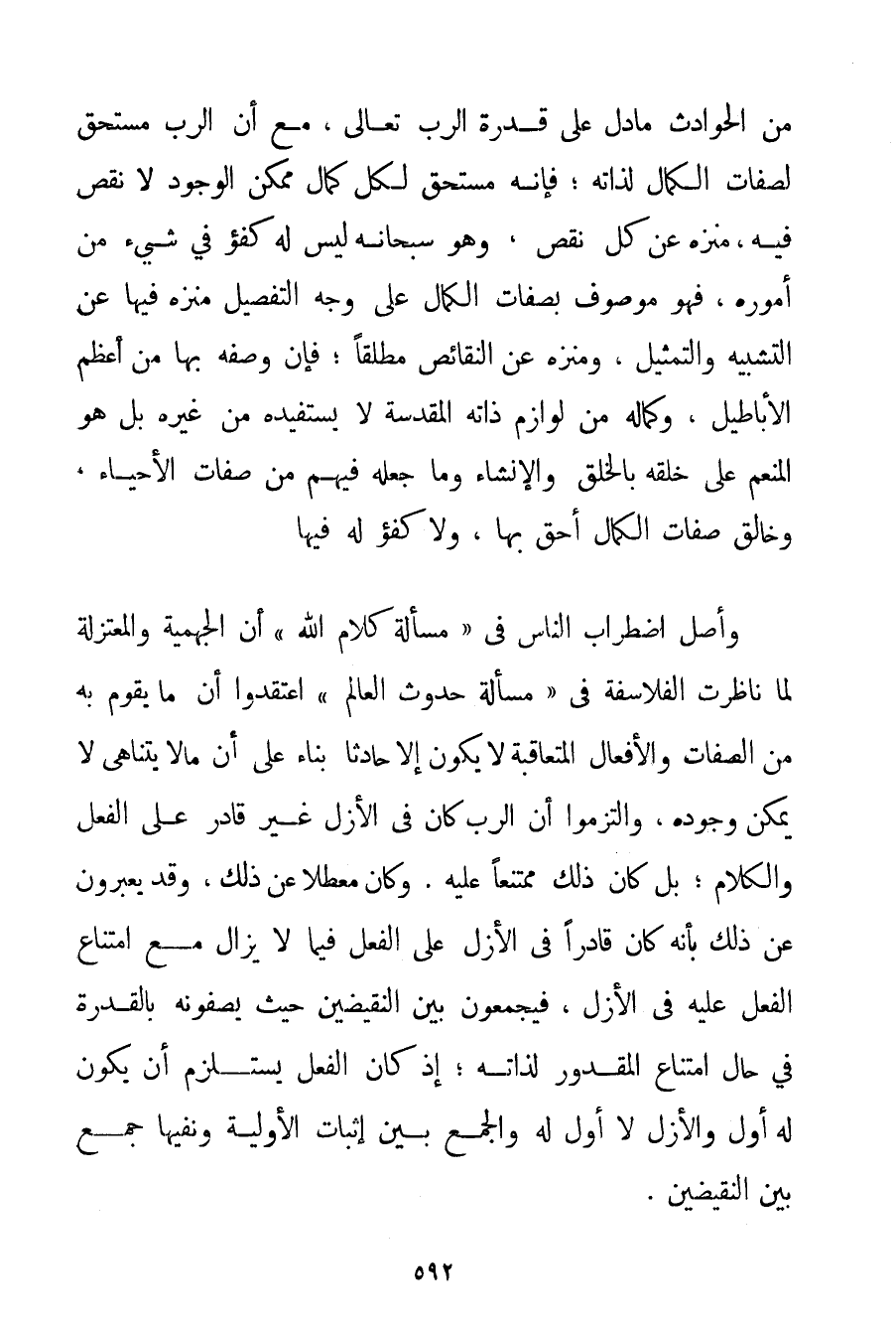 وَأَصْلُ اضْطِرَابِ النَّاسِ فِي " مَسْأَلَةِ كَلَامِ اللَّهِ " أَنَّ الْجَهْمِيَّة وَالْمُعْتَزِلَةَ لَمَّا نَاظَرَتْ الْفَلَاسِفَةَ فِي " مَسْأَلَةِ حُدُوثِ الْعَالَمِ " اعْتَقَدُوا أَنَّ مَا يَقُومُ بِهِ مِنْ الصِّفَاتِ وَالْأَفْعَالِ الْمُتَعَاقِبَةِ لَا يَكُونُ إلَّا حَادِثًا بِنَاءً عَلَى أَنَّ مَا لَا يَتَنَاهَى لَا يُمْكِنُ وُجُودُهُ وَالْتَزَمُوا أَنَّ الرَّبَّ كَانَ فِي الْأَزَلِ غَيْرَ قَادِرٍ عَلَى الْفِعْلِ وَالْكَلَامِ؛ بَلْ كَانَ ذَلِكَ مُمْتَنِعًا عَلَيْهِ. وَكَانَ مُعَطَّلًا عَنْ ذَلِكَ وَقَدْ يُعَبِّرُونَ عَنْ ذَلِكَ بِأَنَّهُ كَانَ قَادِرًا فِي الْأَزَلِ عَلَى الْفِعْلِ فِيمَا لَا يَزَالُ مَعَ امْتِنَاعِ الْفِعْلِ عَلَيْهِ فِي الْأَزَلِ فَيَجْمَعُونَ بَيْنَ النَّقِيضَيْنِ حَيْثُ يَصِفُونَهُ بِالْقُدْرَةِ فِي حَالِ امْتِنَاعِ الْمَقْدُورِ لِذَاتِهِ؛ إذْ كَانَ الْفِعْلُ يَسْتَلْزِمُ أَنْ يَكُونَ لَهُ أَوَّلُ وَالْأَزَلُ لَا أَوَّلَ لَهُ وَالْجَمْعُ بَيْنَ إثْبَاتِ الْأَوَّلِيَّةِ وَنَفْيِهَا جَمْعٌ بَيْنَ النَّقِيضَيْنِ.