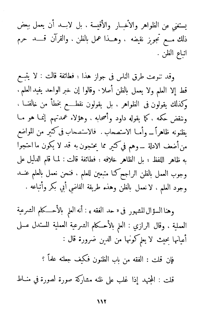 يَسْتَغْنِي عَنْ الظَّوَاهِرِ وَالْأَخْبَارِ وَالْأَقْيِسَةِ بَلْ لَا بُدَّ أَنْ يَعْمَلَ بِبَعْضِ ذَلِكَ مَعَ تَجْوِيزِ نَقِيضِهِ وَهَذَا عَمَلٌ بِالظَّنِّ وَالْقُرْآنُ قَدْ حَرَّمَ اتِّبَاعَ الظَّنِّ. وَقَدْ تَنَوَّعَتْ طُرُقُ النَّاسِ فِي جَوَازِ هَذَا؛ فَطَائِفَةٌ قَالَتْ: لَا يُتَّبَعُ قَطُّ إلَّا الْعِلْمُ وَلَا يُعْمَلُ بِالظَّنِّ أَصْلًا وَقَالُوا إنَّ خَبَرَ الْوَاحِدِ يُفِيدُ الْعِلْمَ وَكَذَلِكَ يَقُولُونَ فِي الظَّوَاهِرِ بَلْ يَقُولُونَ نَقْطَعُ بِخَطَأِ مَنْ خَالَفَنَا وَنَنْقُضُ حُكْمَهُ كَمَا يَقُولُهُ دَاوُد وَأَصْحَابُهُ وَهَؤُلَاءِ عُمْدَتُهُمْ إنَّمَا هُوَ مَا يَظُنُّونَهُ ظَاهِرًا - وَأَمَّا الِاسْتِصْحَابُ فَالِاسْتِصْحَابُ فِي كَثِيرٍ مِنْ الْمَوَاضِعِ مِنْ أَضْعَفِ الْأَدِلَّةِ - وَهُمْ فِي كَثِيرٍ مِمَّا يَحْتَجُّونَ بِهِ قَدْ لَا يَكُونُ مَا احْتَجُّوا بِهِ ظَاهِرَ اللَّفْظِ؛ بَلْ الظَّاهِرُ خِلَافُهُ؛ فَطَائِفَةٌ قَالَتْ: لَمَّا قَامَ الدَّلِيلُ عَلَى وُجُوبِ الْعَمَلِ بِالظَّنِّ الرَّاجِحِ كُنَّا مُتَّبِعِينَ لِلْعِلْمِ فَنَحْنُ نَعْمَلُ بِالْعِلْمِ عِنْدَ وُجُودِ الْعِلْمِ لَا نَعْمَلُ بِالظَّنِّ وَهَذِهِ طَرِيقَةُ الْقَاضِي أَبِي بَكْرٍ وَأَتْبَاعِهِ. وَهُنَا السُّؤَالُ الْمَشْهُورُ فِي " حَدِّ الْفِقْهِ ": أَنَّهُ الْعِلْمُ بِالْأَحْكَامِ الشَّرْعِيَّةِ الْعَمَلِيَّةِ وَقَالَ الرَّازِي: الْعِلْمُ بِالْأَحْكَامِ الشَّرْعِيَّةِ الْعَمَلِيَّةِ الْمُسْتَدَلِّ عَلَى أَعْيَانِهَا بِحَيْثُ لَا يُعْلَمُ كَوْنُهَا مِنْ الدِّينِ ضَرُورَةً قَالَ: فَإِنْ قُلْت: الْفِقْهُ مِنْ بَابِ الظُّنُونِ فَكَيْفَ جَعَلْته عِلْمًا؟ قُلْت: الْمُجْتَهِدُ إذَا غَلَبَ عَلَى ظَنِّهِ مُشَارَكَةُ صُورَةٍ لِصُورَةِ فِي مَنَاطِ