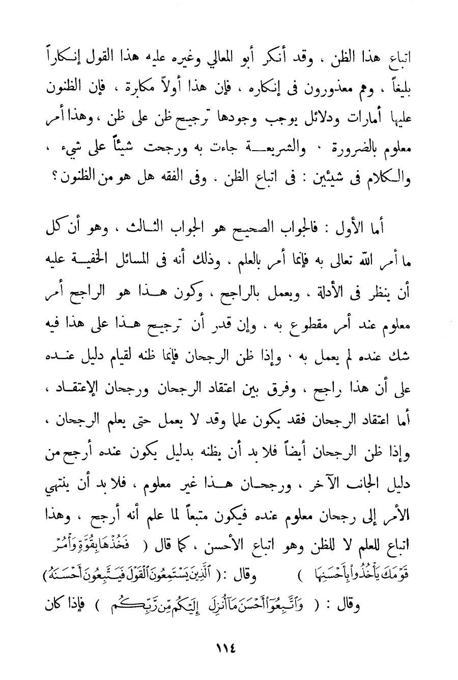 اتِّبَاعُ هَذَا الظَّنِّ وَقَدْ أَنْكَرَ أَبُو الْمَعَالِي وَغَيْرُهُ عَلَيْهِ هَذَا الْقَوْلَ إنْكَارًا بَلِيغًا وَهُمْ مَعْذُورُونَ فِي إنْكَارِهِ فَإِنَّ هَذَا أَوَّلًا مُكَابَرَةٌ فَإِنَّ الظُّنُونَ عَلَيْهَا أَمَارَاتٌ وَدَلَائِلُ يُوجِبُ وُجُودُهَا تَرْجِيحَ ظَنٍّ عَلَى ظَنٍّ وَهَذَا أَمْرٌ مَعْلُومٌ بِالضَّرُورَةِ وَالشَّرِيعَةُ جَاءَتْ بِهِ وَرَجَّحَتْ شَيْئًا عَلَى شَيْءٍ وَالْكَلَامُ فِي شَيْئَيْنِ: فِي اتِّبَاعِ الظَّنِّ وَفِي الْفِقْهِ هَلْ هُوَ مِنْ الظُّنُونِ؟ أَمَّا الْأَوَّلُ: فَالْجَوَابُ الصَّحِيحُ هُوَ الْجَوَابُ الثَّالِثُ وَهُوَ أَنَّ كُلَّ مَا أَمَرَ اللَّهُ تَعَالَى بِهِ فَإِنَّمَا أَمَرَ بِالْعِلْمِ وَذَلِكَ أَنَّهُ فِي الْمَسَائِلِ الْخَفِيَّةِ عَلَيْهِ أَنْ يَنْظُرَ فِي الْأَدِلَّةِ وَيَعْمَلَ بِالرَّاجِحِ وَكَوْنُ هَذَا هُوَ الرَّاجِحُ أَمْرٌ مَعْلُومٌ عِنْدَ أَمْرٍ مَقْطُوعٍ بِهِ وَإِنْ قُدِّرَ أَنَّ تَرْجِيحَ هَذَا عَلَى هَذَا فِيهِ شَكٌّ عِنْدَهُ لَمْ يَعْمَلْ بِهِ وَإِذَا ظَنَّ الرُّجْحَانَ فَإِنَّمَا ظَنُّهُ لِقِيَامِ دَلِيلٍ عِنْدَهُ عَلَى أَنَّ هَذَا رَاجِحٌ وَفَرْقٌ بَيْنَ اعْتِقَادِ الرُّجْحَانِ وَرُجْحَانِ الِاعْتِقَادِ أَمَّا اعْتِقَادُ الرُّجْحَانِ فَقَدْ يَكُونُ عِلْمًا وَقَدْ لَا يَعْمَلُ حَتَّى يَعْلَمَ الرُّجْحَانَ وَإِذَا ظَنَّ الرُّجْحَانَ أَيْضًا فَلَا بُدَّ أَنْ يَظُنَّهُ بِدَلِيلِ يَكُونُ عِنْدَهُ أَرْجَحَ مِنْ دَلِيلِ الْجَانِبِ الْآخَرِ وَرُجْحَانُ هَذَا غَيْرُ مَعْلُومٍ فَلَا بُدَّ أَنْ يَنْتَهِيَ الْأَمْرُ إلَى رُجْحَانٍ مَعْلُومٍ عِنْدَهُ فَيَكُونُ مُتَّبِعًا لِمَا عَلِمَ أَنَّهُ أَرْجَحُ وَهَذَا اتِّبَاعٌ لِلْعِلْمِ لَا لِلظَّنِّ وَهُوَ اتِّبَاعُ الْأَحْسَنِ كَمَا قَالَ {فَخُذْهَا بِقُوَّةٍ وَأْمُرْ قَوْمَكَ يَأْخُذُوا بِأَحْسَنِهَا} وَقَالَ: {الَّذِينَ يَسْتَمِعُونَ الْقَوْلَ فَيَتَّبِعُونَ أَحْسَنَهُ} وَقَالَ: {وَاتَّبِعُوا أَحْسَنَ مَا أُنْزِلَ إلَيْكُمْ مِنْ رَبِّكُمْ} فَإِذَا كَانَ