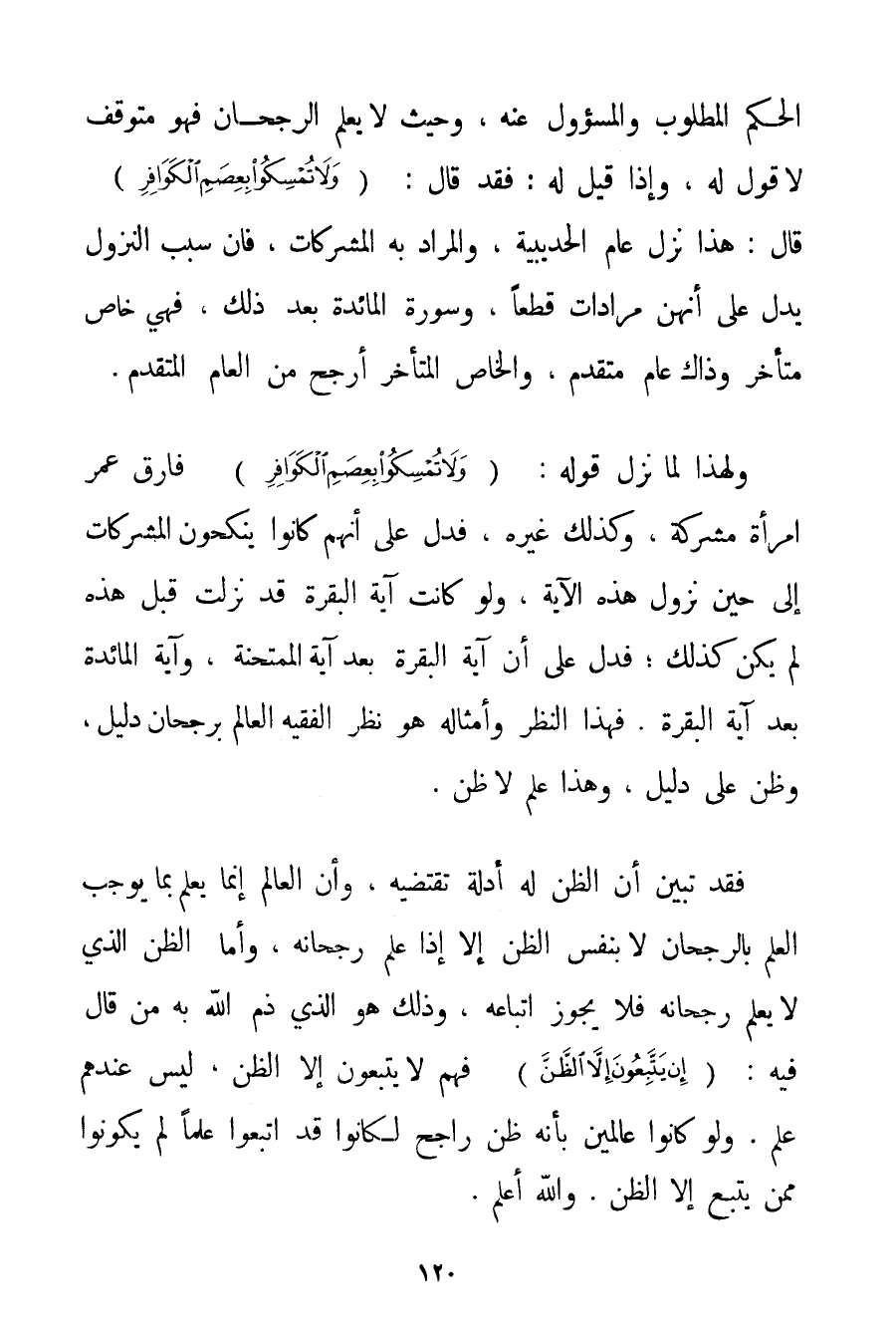 الْحُكْمِ الْمَطْلُوبِ وَالْمَسْؤُولِ عَنْهُ وَحَيْثُ لَا يَعْلَمُ الرُّجْحَانَ فَهُوَ مُتَوَقِّفٌ لَا قَوْلَ لَهُ وَإِذَا قِيلَ لَهُ: فَقَدْ قَالَ: {وَلَا تُمْسِكُوا بِعِصَمِ الْكَوَافِرِ} قَالَ: هَذَا نَزَلَ عَامَ الْحُدَيْبِيَةِ وَالْمُرَادُ بِهِ الْمُشْرِكَاتُ فَإِنَّ سَبَبَ النُّزُولِ يَدُلُّ عَلَى أَنَّهُنَّ مُرَادَاتٌ قَطْعًا وَسُورَةُ الْمَائِدَةِ بَعْدَ ذَلِكَ فَهِيَ خَاصٌّ مُتَأَخِّرٌ وَذَاكَ عَامٌّ مُتَقَدِّمٌ وَالْخَاصُّ الْمُتَأَخِّرُ أَرْجَحُ مِنْ الْعَامِّ الْمُتَقَدِّمِ. وَلِهَذَا لَمَّا نَزَلَ قَوْلُهُ: {وَلَا تُمْسِكُوا بِعِصَمِ الْكَوَافِرِ} فَارَقَ عُمَرُ امْرَأَةً مُشْرِكَةً وَكَذَلِكَ غَيْرُهُ فَدَلَّ عَلَى أَنَّهُمْ كَانُوا يَنْكِحُونَ الْمُشْرِكَاتِ إلَى حِينِ نُزُولِ هَذِهِ الْآيَةِ وَلَوْ كَانَتْ آيَةُ الْبَقَرَةِ قَدْ نَزَلَتْ قَبْلَ هَذِهِ لَمْ يَكُنْ كَذَلِكَ؛ فَدَلَّ عَلَى أَنَّ آيَةَ الْبَقَرَةِ بَعْدَ آيَةِ الْمُمْتَحَنَةِ وَآيَةَ الْمَائِدَةِ بَعْدَ آيَةِ الْبَقَرَةِ. فَهَذَا النَّظَرُ وَأَمْثَالُهُ هُوَ نَظَرُ الْفَقِيهِ الْعَالِمِ بِرُجْحَانِ دَلِيلٍ وَظَنٍّ عَلَى دَلِيلٍ وَهَذَا عِلْمٌ لَا ظَنٌّ. فَقَدْ تَبَيَّنَ أَنَّ الظَّنَّ لَهُ أَدِلَّةٌ تَقْتَضِيهِ وَأَنَّ الْعَالِمَ إنَّمَا يَعْلَمُ بِمَا يُوجِبُ الْعِلْمَ بِالرُّجْحَانِ لَا بِنَفْسِ الظَّنِّ إلَّا إذَا عَلِمَ رُجْحَانَهُ وَأَمَّا الظَّنُّ الَّذِي لَا يُعْلَمُ رُجْحَانُهُ فَلَا يَجُوزُ اتِّبَاعُهُ وَذَلِكَ هُوَ الَّذِي ذَمَّ اللَّهُ بِهِ مَنْ قَالَ فِيهِ: {إنْ يَتَّبِعُونَ إلَّا الظَّنَّ} فَهُمْ لَا يَتَّبِعُونَ إلَّا الظَّنَّ لَيْسَ عِنْدَهُمْ عِلْمٌ. وَلَوْ كَانُوا عَالِمِينَ بِأَنَّهُ ظَنٌّ رَاجِحٌ لَكَانُوا قَدْ اتَّبَعُوا عِلْمًا لَمْ يَكُونُوا مِمَّنْ يَتَّبِعُ إلَّا الظَّنَّ وَاَللَّهُ أَعْلَمُ.