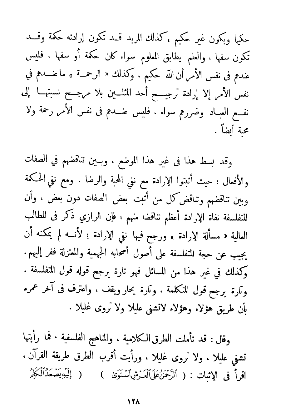 حَكِيمًا وَيَكُونُ غَيْرَ حَكِيمٍ كَذَلِكَ الْمُرِيدُ قَدْ تَكُونُ إرَادَتُهُ حِكْمَةً وَقَدْ تَكُونُ سَفَهًا وَالْعِلْمُ يُطَابِقُ الْمَعْلُومَ سَوَاءٌ كَانَ حِكْمَةً أَوْ سَفَهًا فَلَيْسَ عِنْدَهُمْ فِي نَفْسِ الْأَمْرِ أَنَّ اللَّهَ حَكِيمٌ وَكَذَلِكَ " الرَّحْمَةُ " مَا عِنْدَهُمْ فِي نَفْسِ الْأَمْرِ إلَّا إرَادَةُ تَرْجِيحِ أَحَدِ الْمِثْلَيْنِ بِلَا مُرَجِّحٍ نِسْبَتُهَا إلَى نَفْعِ الْعِبَادِ وَضَرَرِهِمْ سَوَاءٌ فَلَيْسَ عِنْدَهُمْ فِي نَفْسِ الْأَمْرِ رَحْمَةٌ وَلَا مَحَبَّةٌ أَيْضًا. وَقَدْ بُسِطَ هَذَا فِي غَيْرِ هَذَا الْمَوْضِعِ وَبُيِّنَ تَنَاقُضُهُمْ فِي الصِّفَاتِ وَالْأَفْعَالِ؛ حَيْثُ أَثْبَتُوا الْإِرَادَةَ مَعَ نَفْيِ الْمَحَبَّةِ وَالرِّضَا وَمَعَ نَفْيِ الْحِكْمَةِ وَبُيِّنَ تَنَاقُضُهُمْ وَتَنَاقُضُ كُلِّ مَنْ أَثْبَتَ بَعْضَ الصِّفَاتِ دُونَ بَعْضٍ وَأَنَّ الْمُتَفَلْسِفَةَ نفاة الْإِرَادَةِ أَعْظَمُ تَنَاقُضًا مِنْهُمْ؛ فَإِنَّ الرَّازِيَّ ذَكِر فِي الْمَطَالِبِ الْعَالِيَةِ " مَسْأَلَةَ الْإِرَادَةِ " وَرَجَّحَ فِيهَا نَفْيَ الْإِرَادَةِ؛ لِأَنَّهُ لَمْ يُمْكِنْهُ أَنْ يُجِيبَ عَنْ حُجَّةِ الْمُتَفَلْسِفَةِ عَلَى أُصُولِ أَصْحَابِهِ الْجَهْمِيَّة وَالْمُعْتَزِلَةِ فَفَرَّ إلَيْهِمْ وَكَذَلِكَ فِي غَيْرِ هَذَا مِنْ الْمَسَائِلِ فَهُوَ تَارَةً يُرَجِّحُ قَوْلَهُ قَوْلَ الْمُتَفَلْسِفَةِ وَتَارَةً يُرَجِّحُ قَوْلَ الْمُتَكَلِّمَةِ وَتَارَةً يَحَارُ وَيَقِفُ وَاعْتَرَفَ فِي آخِرِ عُمْرِهِ بِأَنَّ طَرِيقَ هَؤُلَاءِ وَهَؤُلَاءِ لَا تَشْفِي عَلِيلًا وَلَا تَرْوِي غَلِيلًا. وَقَالَ: قَدْ تَأَمَّلْت الطُّرُقَ الْكَلَامِيَّةَ وَالْمَنَاهِجَ الْفَلْسَفِيَّةَ فَمَا رَأَيْتهَا تَشْفِي عَلِيلًا وَلَا تَرْوِي غَلِيلًا وَرَأَيْت أَقْرَبَ الطُّرُقِ طَرِيقَةَ الْقُرْآنِ اقْرَأْ فِي الْإِثْبَاتِ: {الرَّحْمَنُ عَلَى الْعَرْشِ اسْتَوَى} {إلَيْهِ يَصْعَدُ الْكَلِمُ