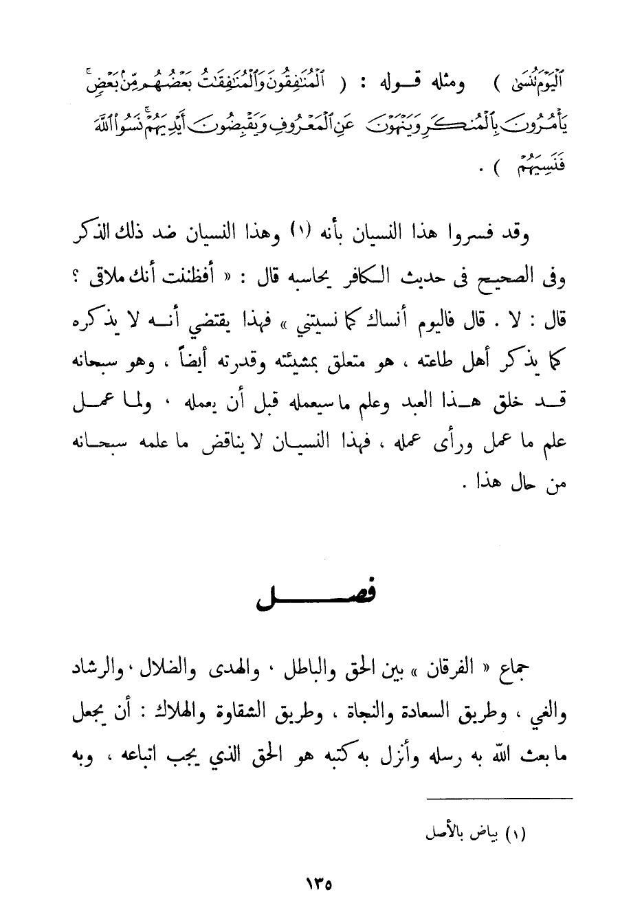 كَذَلِكَ أَتَتْكَ آيَاتُنَا فَنَسِيتَهَا وَكَذَلِكَ الْيَوْمَ تُنْسَى} وَمِثْلُهُ قَوْلُهُ: {الْمُنَافِقُونَ وَالْمُنَافِقَاتُ بَعْضُهُمْ مِنْ بَعْضٍ يَأْمُرُونَ بِالْمُنْكَرِ وَيَنْهَوْنَ عَنِ الْمَعْرُوفِ وَيَقْبِضُونَ أَيْدِيَهُمْ نَسُوا اللَّهَ فَنَسِيَهُمْ} . وَقَدْ فَسَّرُوا هَذَا النِّسْيَانَ بِأَنَّهُ. . . (1) وَهَذَا النِّسْيَانُ ضِدُّ ذَلِكَ الذِّكْرِ وَفِي الصَّحِيحِ فِي حَدِيثِ الْكَافِرِ يُحَاسِبُهُ قَالَ: {أَفَظَنَنْت أَنَّك مُلَاقِيَّ؟ قَالَ: لَا. قَالَ فَالْيَوْمَ أَنْسَاك كَمَا نَسِيتنِي} فَهَذَا يَقْتَضِي أَنَّهُ لَا يَذْكُرُهُ كَمَا يَذْكُرُ أَهْلَ طَاعَتِهِ هُوَ مُتَعَلِّقٌ بِمَشِيئَتِهِ وَقُدْرَتِهِ أَيْضًا وَهُوَ سُبْحَانَهُ قَدْ خَلَقَ هَذَا الْعَبْدَ وَعَلِمَ مَا سَيَعْمَلُهُ قَبْلَ أَنْ يَعْمَلَهُ وَلَمَّا عَمِلَ عَلِمَ مَا عَمِلَ وَرَأَى عَمَلَهُ فَهَذَا النِّسْيَانُ لَا يُنَاقِضُ مَا عَلِمَهُ سُبْحَانَهُ مِنْ حَالِ هَذَا.