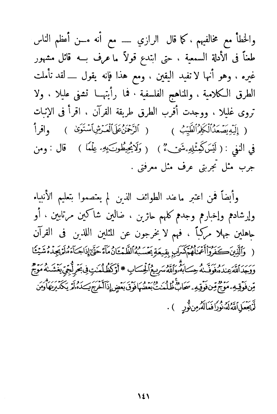 وَالْخَطَأَ مَعَ مُخَالِفِيهِمْ كَمَا قَالَ الرَّازِي - مَعَ أَنَّهُ مِنْ أَعْظَمِ النَّاسِ طَعْنًا فِي الْأَدِلَّةِ السَّمْعِيَّةِ حَتَّى ابْتَدَعَ قَوْلًا مَا عُرِفَ بِهِ قَائِلٌ مَشْهُور غَيْرَهُ وَهُوَ أَنَّهَا لَا تُفِيدُ الْيَقِينَ وَمَعَ هَذَا فَإِنَّهُ يَقُولُ - لَقَدْ تَأَمَّلْت الطُّرُقَ الْكَلَامِيَّةَ وَالْمَنَاهِجَ الْفَلْسَفِيَّةَ فَمَا رَأَيْتهَا تَشْفِي عَلِيلًا وَلَا تَرْوِي غَلِيلًا وَوَجَدْت أَقْرَبَ الطُّرُقِ طَرِيقَةَ الْقُرْآنِ أَقْرَأُ فِي الْإِثْبَاتِ {إلَيْهِ يَصْعَدُ الْكَلِمُ الطَّيِّبُ} {الرَّحْمَنُ عَلَى الْعَرْشِ اسْتَوَى} وَأَقْرَأُ فِي النَّفْيِ: {لَيْسَ كَمِثْلِهِ شَيْءٌ} {وَلَا يُحِيطُونَ بِهِ عِلْمًا} قَالَ: وَمَنْ جَرَّبَ مِثْلَ تَجْرِبَتِي عَرَفَ مِثْلَ مَعْرِفَتِي. وَأَيْضًا فَمَنْ اعْتَبَرَ مَا عِنْدَ الطَّوَائِفِ الَّذِينَ لَمْ يَعْتَصِمُوا بِتَعْلِيمِ الْأَنْبِيَاءِ وَإِرْشَادِهِمْ وَإِخْبَارِهِمْ وَجَدَهُمْ كُلَّهُمْ حَائِرِينَ ضَالِّينَ شَاكِّينَ مُرْتَابِينَ أَوْ جَاهِلِينَ جَهْلًا مُرَكَّبًا فَهُمْ لَا يَخْرُجُونَ عَنْ الْمَثَلَيْنِ اللَّذَيْنِ فِي الْقُرْآنِ {وَالَّذِينَ كَفَرُوا أَعْمَالُهُمْ كَسَرَابٍ بِقِيعَةٍ يَحْسَبُهُ الظَّمْآنُ مَاءً حَتَّى إذَا جَاءَهُ لَمْ يَجِدْهُ شَيْئًا وَوَجَدَ اللَّهَ عِنْدَهُ فَوَفَّاهُ حِسَابَهُ وَاللَّهُ سَرِيعُ الْحِسَابِ} {أَوْ كَظُلُمَاتٍ فِي بَحْرٍ لُجِّيٍّ يَغْشَاهُ مَوْجٌ مِنْ فَوْقِهِ مَوْجٌ مِنْ فَوْقِهِ سَحَابٌ ظُلُمَاتٌ بَعْضُهَا فَوْقَ بَعْضٍ إذَا أَخْرَجَ يَدَهُ لَمْ يَكَدْ يَرَاهَا وَمَنْ لَمْ يَجْعَلِ اللَّهُ لَهُ نُورًا فَمَا لَهُ مِنْ نُورٍ} .
