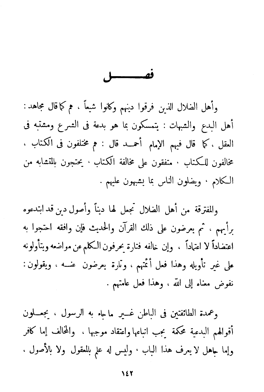 وَأَهْلُ الضَّلَالِ الَّذِينَ فَرَّقُوا دِينَهُمْ وَكَانُوا شِيَعًا هُمْ كَمَا قَالَ مُجَاهِدٌ: أَهْلُ الْبِدَعِ وَالشُّبُهَاتِ: يَتَمَسَّكُونَ بِمَا هُوَ بِدْعَةٌ فِي الشَّرْعِ وَمُشْتَبِهٌ فِي الْعَقْلِ كَمَا قَالَ فِيهِمْ الْإِمَامُ أَحْمَد قَالَ: هُمْ مُخْتَلِفُونَ فِي الْكِتَابِ مُخَالِفُونَ لِلْكِتَابِ مُتَّفِقُونَ عَلَى مُخَالَفَةِ الْكِتَابِ يَحْتَجُّونَ بِالْمُتَشَابِهِ مِنْ الْكَلَامِ وَيُضِلُّونَ النَّاسَ بِمَا يُشَبِّهُونَ عَلَيْهِمْ. وَالْمُفْتَرِقَةُ مِنْ أَهْلِ الضَّلَالِ تَجْعَلُ لَهَا دِينًا وَأُصُولَ دِينٍ قَدْ ابْتَدَعُوهُ بِرَأْيِهِمْ ثُمَّ يَعْرِضُونَ عَلَى ذَلِكَ الْقُرْآنَ وَالْحَدِيثَ فَإِنْ وَافَقَهُ احْتَجُّوا بِهِ اعْتِضَادًا لَا اعْتِمَادًا وَإِنْ خَالَفَهُ فَتَارَةً يُحَرِّفُونَ الْكَلِمَ عَنْ مَوَاضِعِهِ وَيَتَأَوَّلُونَهُ عَلَى غَيْرِ تَأْوِيلِهِ وَهَذَا فِعْلُ أَئِمَّتِهِمْ وَتَارَةً يُعْرِضُونَ عَنْهُ وَيَقُولُونَ: نُفَوِّضُ مَعْنَاهُ إلَى اللَّهِ وَهَذَا فِعْلُ عَامَّتِهِمْ. وَعُمْدَةُ الطَّائِفَتَيْنِ فِي الْبَاطِنِ غَيْرُ مَا جَاءَ بِهِ الرَّسُولُ يَجْعَلُونَ أَقْوَالَهُمْ الْبِدْعِيَّةَ مُحْكَمَةً يَجِبُ اتِّبَاعُهَا وَاعْتِقَادُ مُوجَبِهَا وَالْمُخَالِفُ إمَّا كَافِرٌ وَإِمَّا جَاهِلٌ لَا يَعْرِفُ هَذَا الْبَابَ وَلَيْسَ لَهُ عِلْمٌ بِالْمَعْقُولِ وَلَا بِالْأُصُولِ