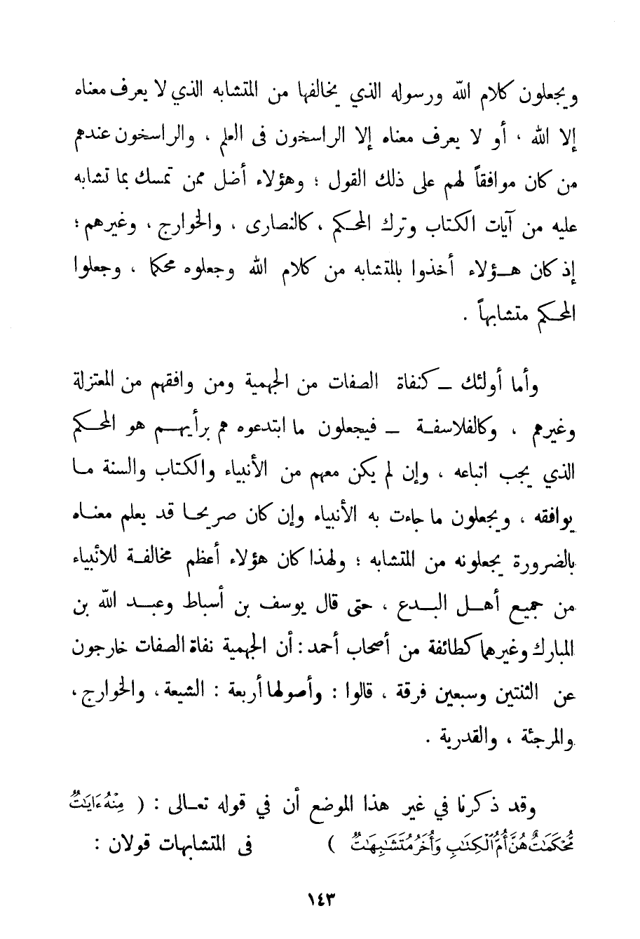 وَيَجْعَلُونَ كَلَامَ اللَّهِ وَرَسُولِهِ الَّذِي يُخَالِفُهَا مِنْ الْمُتَشَابِهِ الَّذِي لَا يَعْرِفُ مَعْنَاهُ إلَّا اللَّهُ أَوْ لَا يَعْرِفُ مَعْنَاهُ إلَّا الرَّاسِخُونَ فِي الْعِلْمِ وَالرَّاسِخُونَ عِنْدَهُمْ مَنْ كَانَ مُوَافِقًا لَهُمْ عَلَى ذَلِكَ الْقَوْلِ؛ وَهَؤُلَاءِ أَضَلُّ مِمَّنْ تَمَسَّكَ بِمَا تَشَابَهَ عَلَيْهِ مِنْ آيَاتِ الْكِتَابِ وَتَرْكِ الْمُحْكَمِ كَالنَّصَارَى وَالْخَوَارِجِ وَغَيْرِهِمْ؛ إذْ كَانَ هَؤُلَاءِ أَخَذُوا بِالْمُتَشَابِهِ مِنْ كَلَامِ اللَّهِ وَجَعَلُوهُ مُحْكَمًا وَجَعَلُوا الْمُحْكَمَ مُتَشَابِهًا. وَأَمَّا أُولَئِكَ - كنفاة الصِّفَاتِ مِنْ الْجَهْمِيَّة وَمَنْ وَافَقَهُمْ مِنْ الْمُعْتَزِلَةِ وَغَيْرِهِمْ وَكَالْفَلَاسِفَةِ - فَيَجْعَلُونَ مَا ابْتَدَعُوهُ هُمْ بِرَأْيِهِمْ هُوَ الْمُحْكَمَ الَّذِي يَجِبُ اتِّبَاعُهُ وَإِنْ لَمْ يَكُنْ مَعَهُمْ مِنْ الْأَنْبِيَاءِ وَالْكِتَابِ وَالسُّنَّةِ مَا يُوَافِقُهُ وَيَجْعَلُونَ مَا جَاءَتْ بِهِ الْأَنْبِيَاءُ وَإِنْ كَانَ صَرِيحًا قَدْ يُعْلَمُ مَعْنَاهُ بِالضَّرُورَةِ يَجْعَلُونَهُ مِنْ الْمُتَشَابِهِ؛ وَلِهَذَا كَانَ هَؤُلَاءِ أَعْظَمَ مُخَالَفَةً لِلْأَنْبِيَاءِ مِنْ جَمِيعِ أَهْلِ الْبِدَعِ حَتَّى قَالَ يُوسُفُ بْنُ أَسْبَاطٍ وَعَبْدُ اللَّهِ بْنُ الْمُبَارَكِ وَغَيْرُهُمَا كَطَائِفَةٍ مِنْ أَصْحَابِ أَحْمَد: أَنَّ الْجَهْمِيَّة نفاة الصِّفَاتِ خَارِجُونَ عَنْ الثِّنْتَيْنِ وَسَبْعِينَ فِرْقَةً قَالُوا: وَأُصُولُهَا أَرْبَعَةٌ: الشِّيعَةُ وَالْخَوَارِجُ وَالْمُرْجِئَةُ وَالْقَدَرِيَّةُ. وَقَدْ ذَكَرْنَا فِي غَيْرِ هَذَا الْمَوْضِعِ أَنَّ فِي قَوْله تَعَالَى {مِنْهُ آيَاتٌ مُحْكَمَاتٌ هُنَّ أُمُّ الْكِتَابِ وَأُخَرُ مُتَشَابِهَاتٌ} فِي الْمُتَشَابِهَاتِ قَوْلَانِ: