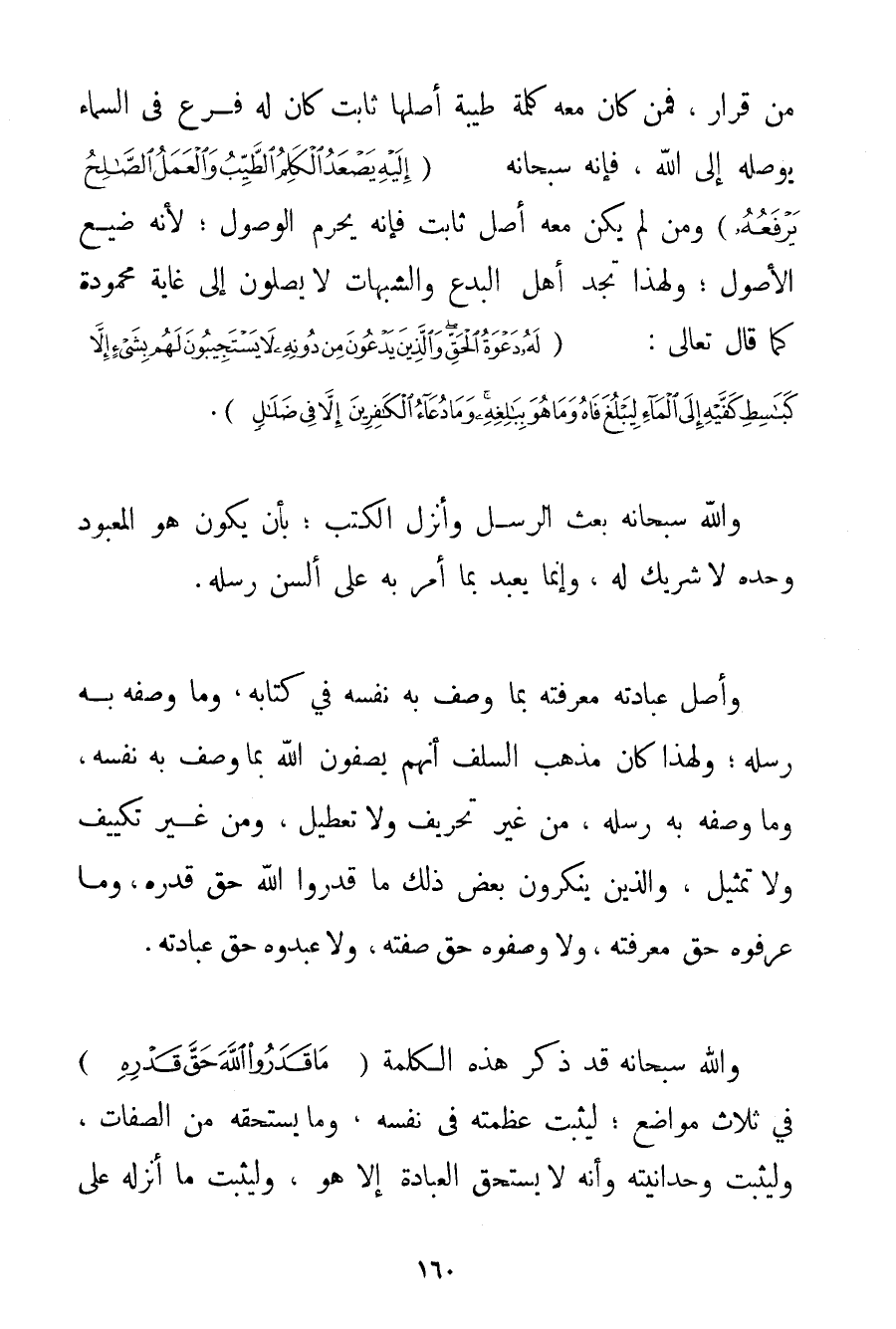وَاَللَّهُ سُبْحَانَهُ بَعَثَ الرُّسُلَ وَأَنْزَلَ الْكُتُبَ؛ بِأَنْ يَكُونَ هُوَ الْمَعْبُودَ وَحْدَهُ لَا شَرِيكَ لَهُ وَإِنَّمَا يُعْبَدُ بِمَا أَمَرَ بِهِ عَلَى أَلْسُنِ رُسُلِهِ. وَأَصْلُ عِبَادَتِهِ مَعْرِفَتُهُ بِمَا وَصَفَ بِهِ نَفْسَهُ فِي كِتَابِهِ وَمَا وَصَفَهُ بِهِ رُسُلُهُ؛ وَلِهَذَا كَانَ مَذْهَبُ السَّلَفِ أَنَّهُمْ يَصِفُونَ اللَّهَ بِمَا وَصَفَ بِهِ نَفْسَهُ وَمَا وَصَفَهُ بِهِ رُسُلُهُ مِنْ غَيْرِ تَحْرِيفٍ وَلَا تَعْطِيلٍ وَمِنْ غَيْرِ تَكْيِيفٍ وَلَا تَمْثِيلٍ وَاَلَّذِينَ يُنْكِرُونَ بَعْضَ ذَلِكَ مَا قَدَرُوا اللَّهَ حَقَّ قَدْرِهِ وَمَا عَرَفُوهُ حَقَّ مَعْرِفَتِهِ وَلَا وَصَفُوهُ حَقَّ صِفَتِهِ وَلَا عَبَدُوهُ حَقَّ عِبَادَتِهِ. وَاَللَّهُ سُبْحَانَهُ قَدْ ذَكَرَ هَذِهِ الْكَلِمَةَ {مَا قَدَرُوا اللَّهَ حَقَّ قَدْرِهِ} فِي ثَلَاثِ مَوَاضِعَ؛ لِيُثْبِتَ عَظَمَتَهُ فِي نَفْسِهِ وَمَا يَسْتَحِقُّهُ مِنْ الصِّفَاتِ وَلِيُثْبِتَ وَحْدَانِيَّتَهُ وَأَنَّهُ لَا يَسْتَحِقُّ الْعِبَادَةَ إلَّا هُوَ وَلِيُثْبِتَ مَا أَنْزَلَهُ عَلَى