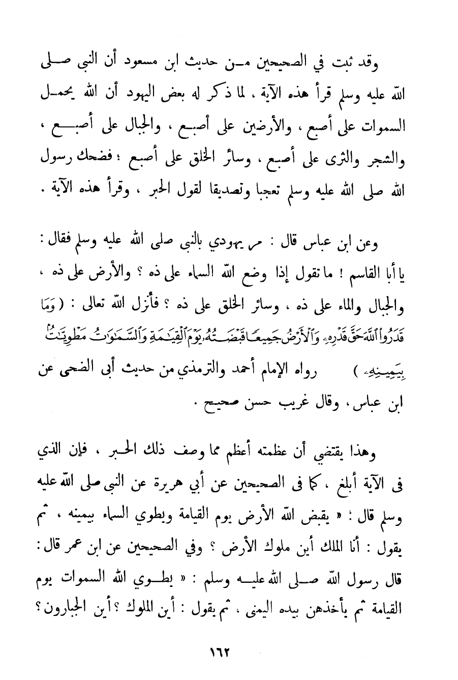 وَقَدْ ثَبَتَ فِي الصَّحِيحَيْنِ مِنْ حَدِيثِ ابْنِ مَسْعُودٍ أَنَّ النَّبِيَّ صَلَّى اللَّهُ عَلَيْهِ وَسَلَّمَ قَرَأَ هَذِهِ الْآيَةَ لَمَّا ذَكَرَ لَهُ بَعْضُ الْيَهُودِ أَنَّ اللَّهَ يَحْمِلُ السَّمَوَاتِ عَلَى أُصْبُعٍ وَالْأَرْضِينَ عَلَى أُصْبُعٍ وَالْجِبَالَ عَلَى أُصْبُعٍ وَالشَّجَرَ وَالثَّرَى عَلَى أُصْبُعٍ وَسَائِرَ الْخَلْقِ عَلَى أُصْبُعٍ؛ فَضَحِكَ رَسُولُ اللَّهِ صَلَّى اللَّهُ عَلَيْهِ وَسَلَّمَ تَعَجُّبًا وَتَصْدِيقًا لِقَوْلِ الْحَبْرِ وَقَرَأَ هَذِهِ الْآيَةَ. وَعَنْ ابْنِ عَبَّاسٍ {قَالَ: مَرَّ يَهُودِيٌّ بِالنَّبِيِّ صَلَّى اللَّهُ عَلَيْهِ وَسَلَّمَ فَقَالَ: يَا أَبَا الْقَاسِمِ مَا تَقُولُ إذَا وَضَعَ اللَّهُ السَّمَاءَ عَلَى ذِهِ؟ وَالْأَرْضَ عَلَى ذِهِ وَالْجِبَالَ وَالْمَاءَ عَلَى ذِهِ وَسَائِرَ الْخَلْقِ عَلَى ذِهِ؟ فَأَنْزَلَ اللَّهُ تَعَالَى: {وَمَا قَدَرُوا اللَّهَ حَقَّ قَدْرِهِ وَالْأَرْضُ جَمِيعًا قَبْضَتُهُ يَوْمَ الْقِيَامَةِ وَالسَّماوَاتُ مَطْوِيَّاتٌ بِيَمِينِهِ} } رَوَاهُ الْإِمَامُ أَحْمَد بْنُ حَنْبَلٍ وَالتِّرْمِذِي مِنْ حَدِيثِ أَبِي الضُّحَى عَنْ ابْنِ عَبَّاسٍ وَقَالَ غَرِيبٌ حَسَنٌ صَحِيحٌ. وَهَذَا يَقْتَضِي أَنَّ عَظَمَتَهُ أَعْظَمُ مِمَّا وَصَفَ ذَلِكَ الْحَبْرُ فَإِنَّ الَّذِي فِي الْآيَةِ أَبْلَغُ كَمَا فِي الصَّحِيحَيْنِ عَنْ أَبِي هُرَيْرَةَ عَنْ النَّبِيِّ صَلَّى اللَّهُ عَلَيْهِ وَسَلَّمَ قَالَ: " {يَقْبِضُ اللَّهُ الْأَرْضَ يَوْمَ الْقِيَامَةِ وَيَطْوِي السَّمَاءَ بِيَمِينِهِ ثُمَّ يَقُولُ: أَنَا الْمَلِكُ أَيْنَ مُلُوكُ الْأَرْضِ} ؟ وَفِي الصَّحِيحَيْنِ عَنْ ابْنِ عُمَرَ قَالَ: قَالَ رَسُولُ اللَّهِ صَلَّى اللَّهُ عَلَيْهِ وَسَلَّمَ " {يَطْوِي اللَّهُ السَّمَوَاتِ يَوْمَ الْقِيَامَةِ ثُمَّ يَأْخُذُهُنَّ بِيَدِهِ الْيُمْنَى. ثُمَّ يَقُولُ: أَيْنَ الْمُلُوكُ؟ أَيْنَ الْجَبَّارُونَ؟
