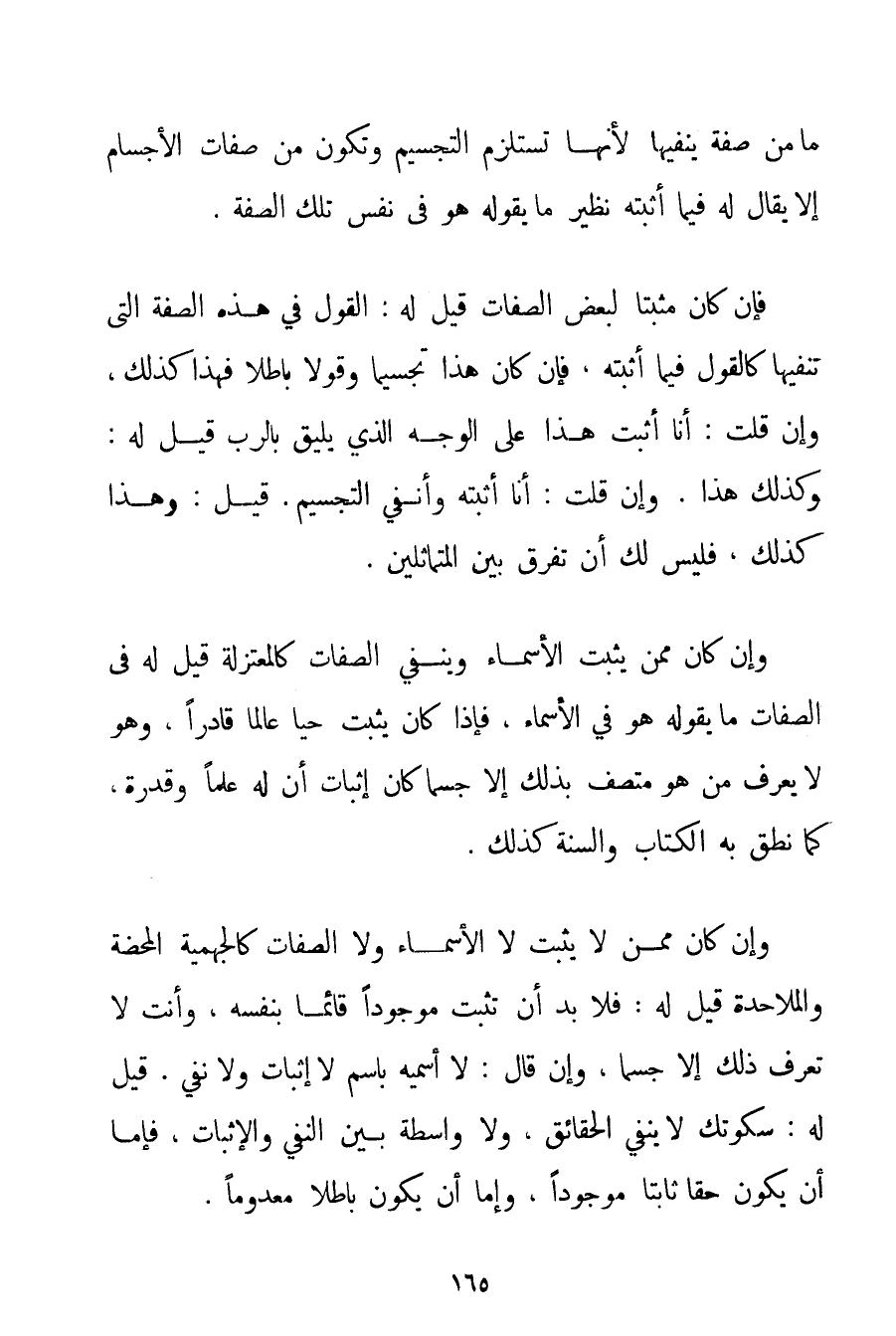 مَا مِنْ صِفَةٍ يَنْفِيهَا لِأَنَّهَا تَسْتَلْزِمُ التَّجْسِيمَ وَتَكُونُ مِنْ صِفَاتِ الْأَجْسَامِ إلَّا يُقَالُ لَهُ فِيمَا أَثْبَتَهُ نَظِيرُ مَا يَقُولُهُ هُوَ فِي نَفْسِ تِلْكَ الصِّفَةِ. فَإِنْ كَانَ مُثْبِتًا لِبَعْضِ الصِّفَاتِ قِيلَ لَهُ: الْقَوْلُ فِي هَذِهِ الصِّفَةِ الَّتِي تَنْفِيهَا كَالْقَوْلِ فِيمَا أَثْبَتّه فَإِنْ كَانَ هَذَا تَجْسِيمًا وَقَوْلًا بَاطِلًا فَهَذَا كَذَلِكَ وَإِنْ قُلْت: أَنَا أُثْبِتُ هَذَا عَلَى الْوَجْهِ الَّذِي يَلِيقُ بِالرَّبِّ قِيلَ لَهُ: وَكَذَلِكَ هَذَا. وَإِنْ قُلْت: أَنَا أُثْبِتُهُ وَأَنْفِي التَّجْسِيمَ. قِيلَ: وَهَذَا كَذَلِكَ فَلَيْسَ لَك أَنْ تُفَرِّقَ بِهِ بَيْنَ الْمُتَمَاثِلَيْنِ. وَإِنْ كَانَ مِمَّنْ يُثْبِتُ الْأَسْمَاءَ وَيَنْفِي الصِّفَاتِ كَالْمُعْتَزِلَةِ قِيلَ لَهُ فِي الصِّفَاتِ مَا يَقُولُهُ هُوَ فِي الْأَسْمَاءِ فَإِذَا كَانَ يُثْبِتُ حَيًّا عَالِمًا قَادِرًا وَهُوَ لَا يَعْرِفُ مَنْ هُوَ مُتَّصِفٌ بِذَلِكَ إلَّا جِسْمًا كَانَ إثْبَاتُ أَنَّ لَهُ عِلْمًا وَقُدْرَةً كَمَا نَطَقَ بِهِ الْكِتَابُ وَالسُّنَّةُ كَذَلِكَ. وَإِنْ كَانَ مِمَّنْ لَا يُثْبِتُ لَا الْأَسْمَاءَ وَلَا الصِّفَاتِ كالْجَهْمِيَّة الْمَحْضَةِ وَالْمَلَاحِدَةِ قِيلَ لَهُ: فَلَا بُدَّ أَنْ تُثْبِتَ مَوْجُودًا قَائِمًا بِنَفْسِهِ وَأَنْتَ لَا تَعْرِفُ ذَلِكَ إلَّا جِسْمًا وَإِنْ قَالَ: لَا أُسَمِّيهِ بِاسْمِ لَا إثْبَاتَ وَلَا نَفْيَ. قِيلَ لَهُ: سُكُوتُك لَا يَنْفِي الْحَقَائِقَ وَلَا وَاسِطَةَ بَيْنَ النَّفْيِ وَالْإِثْبَاتِ فَإِمَّا أَنْ يَكُونَ حَقًّا ثَابِتًا مَوْجُودًا وَإِمَّا أَنْ يَكُونَ بَاطِلًا مَعْدُومًا.