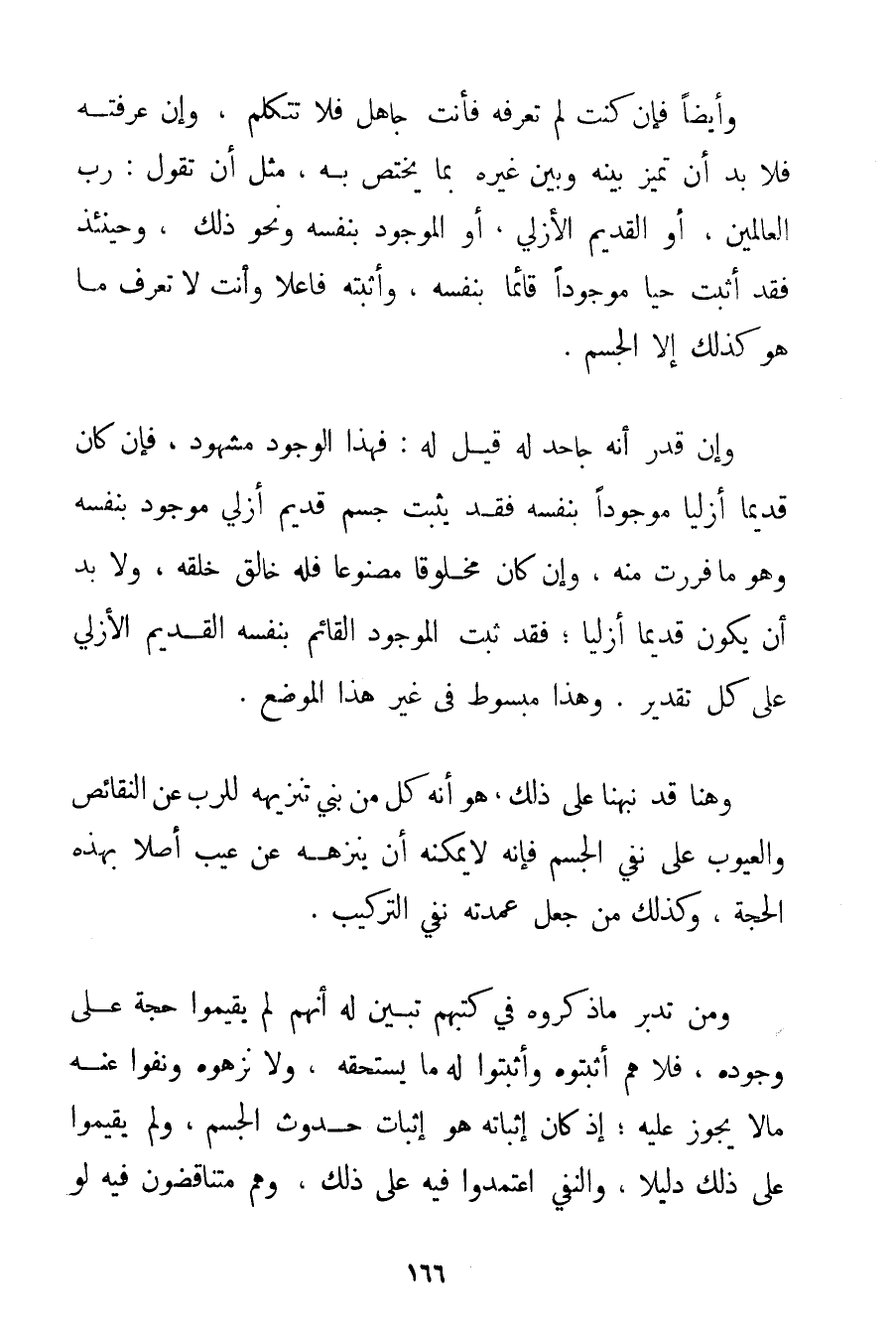 وَأَيْضًا فَإِنْ كُنْت لَمْ تَعْرِفْهُ فَأَنْتَ جَاهِلٌ فَلَا تَتَكَلَّمْ وَإِنْ عَرَفْته فَلَا بُدَّ أَنْ تُمَيِّزَ بَيْنَهُ وَبَيْنَ غَيْرِهِ بِمَا يَخْتَصُّ بِهِ مِثْلَ أَنْ تَقُولَ: رَبُّ الْعَالَمِينَ أَوْ الْقَدِيمُ الْأَزَلِيُّ أَوْ الْمَوْجُودُ بِنَفْسِهِ وَنَحْوُ ذَلِكَ وَحِينَئِذٍ فَقَدْ أَثْبَتّ حَيًّا مَوْجُودًا قَائِمًا بِنَفْسِهِ وَأَثْبَتّه فَاعِلًا وَأَنْتَ لَا تَعْرِفُ مَا هُوَ كَذَلِكَ إلَّا الْجِسْمَ. وَإِنْ قُدِّرَ أَنَّهُ جَاحِدٌ لَهُ قِيلَ لَهُ: فَهَذَا الْوُجُودُ مَشْهُودٌ فَإِنْ كَانَ قَدِيمًا أَزَلِيًّا مَوْجُودًا بِنَفْسِهِ فَقَدْ يُثْبِتُ جِسْمَ قَدِيمٍ أَزَلِيٍّ مَوْجُودٍ بِنَفْسِهِ وَهُوَ مَا فَرَرْت مِنْهُ وَإِنْ كَانَ مَخْلُوقًا مَصْنُوعًا فَلَهُ خَالِقٌ خَلَقَهُ وَلَا بُدَّ أَنْ يَكُونَ قَدِيمًا أَزَلِيًّا؛ فَقَدْ ثَبَتَ الْمَوْجُودُ الْقَائِمُ بِنَفْسِهِ الْقَدِيمُ الْأَزَلِيُّ عَلَى كُلِّ تَقْدِيرٍ. وَهَذَا مَبْسُوطٌ فِي غَيْرِ هَذَا الْمَوْضِعِ. وَهُنَا قَدْ نَبَّهْنَا عَلَى ذَلِكَ هُوَ أَنَّهُ كُلُّ مَنْ بَنَى تَنْزِيهَهُ لِلرَّبِّ عَنْ النَّقَائِصِ وَالْعُيُوبِ عَلَى نَفْيِ الْجِسْمِ فَإِنَّهُ لَا يُمْكِنُهُ أَنْ يُنَزِّهَهُ عَنْ عَيْبٍ أَصْلًا بِهَذِهِ الْحُجَّةِ وَكَذَلِكَ مَنْ جَعَلَ عُمْدَتَهُ نَفْيَ التَّرْكِيبِ. وَمَنْ تَدَبَّرَ مَا ذَكَرُوهُ فِي كُتُبِهِمْ تَبَيَّنَ لَهُ أَنَّهُمْ لَمْ يُقِيمُوا حُجَّةً عَلَى وُجُودِهِ فَلَا هُمْ أَثْبَتُوهُ وَأَثْبَتُوا لَهُ مَا يَسْتَحِقُّهُ وَلَا نَزَّهُوهُ وَنَفَوْا عَنْهُ مَا لَا يَجُوزُ عَلَيْهِ؛ إذْ كَانَ إثْبَاتُهُ هُوَ إثْبَاتَ حُدُوثِ الْجِسْمِ وَلَمْ يُقِيمُوا عَلَى ذَلِكَ دَلِيلًا وَالنَّفْيُ اعْتَمَدُوا فِيهِ عَلَى ذَلِكَ وَهُمْ مُتَنَاقِضُونَ فِيهِ لَوْ