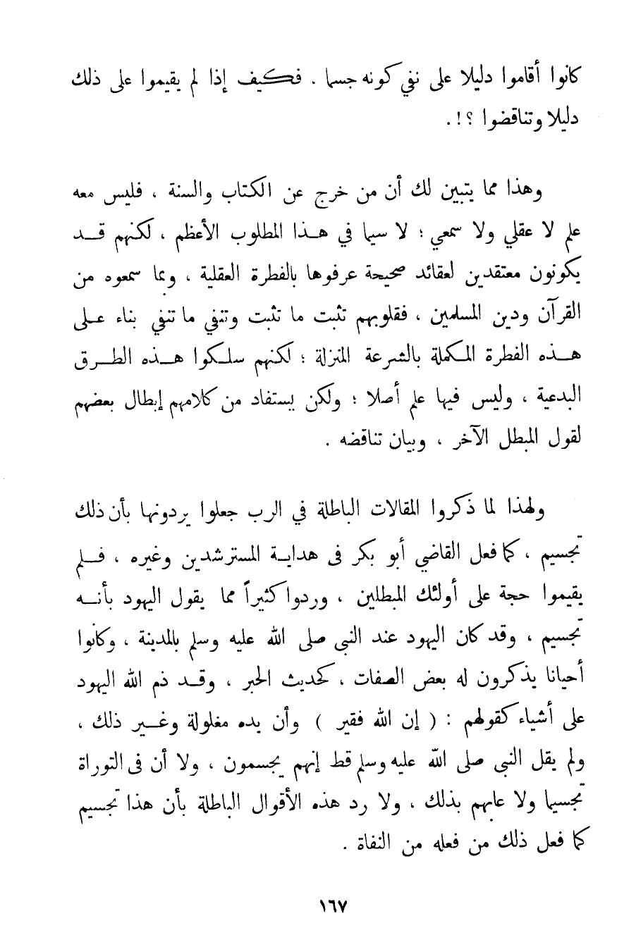 كَانُوا أَقَامُوا دَلِيلًا عَلَى نَفْيِ كَوْنِهِ جِسْمًا فَكَيْفَ إذَا لَمْ يُقِيمُوا عَلَى ذَلِكَ دَلِيلًا وَتَنَاقَضُوا. وَهَذَا مِمَّا يَتَبَيَّنُ لَك أَنَّ مَنْ خَرَجَ عَنْ الْكِتَابِ وَالسُّنَّةِ فَلَيْسَ مَعَهُ عِلْمٌ لَا عَقْلِيٌّ وَلَا سَمْعِيٌّ؛ لَا سِيَّمَا فِي هَذَا الْمَطْلُوبِ الْأَعْظَمِ لَكِنَّهُمْ قَدْ يَكُونُونَ مُعْتَقِدِينَ لِعَقَائِدَ صَحِيحَةٍ عَرَفُوهَا بِالْفِطْرَةِ الْعَقْلِيَّةِ وَبِمَا سَمِعُوهُ مِنْ الْقُرْآنِ وَدِينِ الْمُسْلِمِينَ فَقُلُوبُهُمْ تُثْبِتُ مَا تُثْبِتُ وَتَنْفِي مَا تَنْفِي بِنَاءً عَلَى هَذِهِ الْفِطْرَةِ الْمُكَمَّلَةِ بِالشِّرْعَةِ الْمُنَزَّلَةِ؛ لَكِنَّهُمْ سَلَكُوا هَذِهِ الطُّرُقَ الْبِدْعِيَّةَ وَلَيْسَ فِيهَا عِلْمٌ أَصْلًا؛ وَلَكِنْ يُسْتَفَادُ مِنْ كَلَامِهِمْ إبْطَالُ بَعْضِهِمْ لِقَوْلِ الْمُبْطِلِ الْآخَرِ وَبَيَانُ تَنَاقُضِهِ. وَلِهَذَا لَمَّا ذَكَرُوا الْمَقَالَاتِ الْبَاطِلَةَ فِي الرَّبِّ جَعَلُوا يَرُدُّونَهَا بِأَنَّ ذَلِكَ تَجْسِيمٌ كَمَا فَعَلَ الْقَاضِي أَبُو بَكْرٍ فِي هِدَايَةِ الْمُسْتَرْشِدِينَ وَغَيْرُهُ فَلَمْ يُقِيمُوا حُجَّةً عَلَى أُولَئِكَ الْمُبْطِلِينَ وَرَدُّوا كَثِيرًا مِمَّا يَقُولُ الْيَهُودُ بِأَنَّهُ تَجْسِيمٌ وَقَدْ كَانَ الْيَهُودُ عِنْدَ النَّبِيِّ صَلَّى اللَّهُ عَلَيْهِ وَسَلَّمَ بِالْمَدِينَةِ وَكَانُوا أَحْيَانًا يَذْكُرُونَ لَهُ بَعْضَ الصِّفَاتِ كَحَدِيثِ الْحَبْرِ وَقَدْ ذَمَّ اللَّهُ الْيَهُودَ عَلَى أَشْيَاءَ كَقَوْلِهِمْ: (إنَّ اللَّهَ فَقِيرٌ وَإِنَّ يَدَهُ مَغْلُولَةٌ وَغَيْرِ ذَلِكَ وَلَمْ يَقُلْ النَّبِيُّ صَلَّى اللَّهُ عَلَيْهِ وَسَلَّمَ قَطُّ إنَّهُمْ يُجَسِّمُونَ وَلَا أَنَّ فِي التَّوْرَاةِ تَجْسِيمًا وَلَا عَابَهُمْ بِذَلِكَ وَلَا رَدَّ هَذِهِ الْأَقْوَالَ الْبَاطِلَةَ بِأَنَّ هَذَا تَجْسِيمٌ كَمَا فَعَلَ ذَلِكَ مَنْ فَعَلَهُ مِنْ الْنُّفَاةِ.
