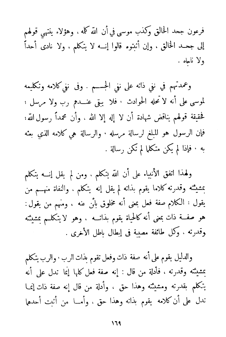 فِرْعَوْنَ جَحَدَ الْخَالِقَ وَكَذَّبَ مُوسَى فِي أَنَّ اللَّهَ كَلَّمَهُ وَهَؤُلَاءِ يَنْتَهِي قَوْلُهُمْ إلَى جَحْدِ الْخَالِقِ وَإِنْ أَثْبَتُوهُ قَالُوا إنَّهُ لَا يَتَكَلَّمُ وَلَا نَادَى أَحَدًا وَلَا نَاجَاهُ. وَعُمْدَتُهُمْ فِي نَفْيِ ذَاتِهِ عَلَى نَفْيِ الْجِسْمِ. وَفِي نَفْيِ كَلَامِهِ وَتَكْلِيمِهِ لِمُوسَى عَلَى أَنَّهُ لَا تَحُلُّهُ الْحَوَادِثُ فَلَا يَبْقَى عِنْدَهُمْ رَبٌّ وَلَا مُرْسَلٌ؛ فَحَقِيقَةُ قَوْلِهِمْ يُنَاقِضُ شَهَادَةَ أَنْ لَا إلَهَ إلَّا اللَّهُ وَأَنَّ مُحَمَّدًا رَسُولُ اللَّهِ؛ فَإِنَّ الرَّسُولَ هُوَ الْمُبَلِّغُ لِرِسَالَةِ مُرْسِلِهِ وَالرِّسَالَةُ هِيَ كَلَامُهُ الَّذِي بَعَثَهُ بِهِ فَإِذَا لَمْ يَكُنْ مُتَكَلِّمًا لَمْ تَكُنْ رِسَالَةٌ. وَلِهَذَا اتَّفَقَ الْأَنْبِيَاءُ عَلَى أَنَّ اللَّهَ يَتَكَلَّمُ وَمَنْ لَمْ يَقُلْ إنَّهُ يَتَكَلَّمُ بِمَشِيئَتِهِ وَقُدْرَتِهِ كَلَامًا يَقُومُ بِذَاتِهِ لَمْ يَقُلْ إنَّهُ يَتَكَلَّمُ والْنُّفَاةِ مِنْهُمْ مَنْ يَقُولُ: الْكَلَامُ صِفَةُ فِعْلٍ بِمَعْنَى أَنَّهُ مَخْلُوقٌ بَائِنٌ عَنْهُ وَمِنْهُمْ مَنْ يَقُولُ: هُوَ صِفَةُ ذَاتٍ بِمَعْنَى أَنَّهُ كَالْحَيَاةِ يَقُومُ بِذَاتِهِ وَهُوَ لَا يَتَكَلَّمُ بِمَشِيئَتِهِ وَقُدْرَتِهِ وَكُلُّ طَائِفَةٍ مُصِيبَةٌ فِي إبْطَالِ بَاطِلِ الْأُخْرَى. وَالدَّلِيلُ يَقُومُ عَلَى أَنَّهُ صِفَةُ ذَاتٍ وَفِعْلٍ تَقُومُ بِذَاتِ الرَّبِّ وَالرَّبُّ يَتَكَلَّمُ بِمَشِيئَتِهِ وَقُدْرَتِهِ فَأَدِلَّةُ مَنْ قَالَ: إنَّهُ صِفَةُ فِعْلٍ كُلُّهَا إنَّمَا تَدُلُّ عَلَى أَنَّهُ يَتَكَلَّمُ بِقُدْرَتِهِ وَمَشِيئَتِهِ وَهَذَا حَقٌّ وَأَدِلَّةُ مَنْ قَالَ إنَّهُ صِفَةُ ذَاتٍ إنَّمَا تَدُلُّ عَلَى أَنَّ كَلَامَهُ يَقُومُ بِذَاتِهِ وَهَذَا حَقٌّ وَأَمَّا مَنْ أَثْبَتَ أَحَدَهُمَا
