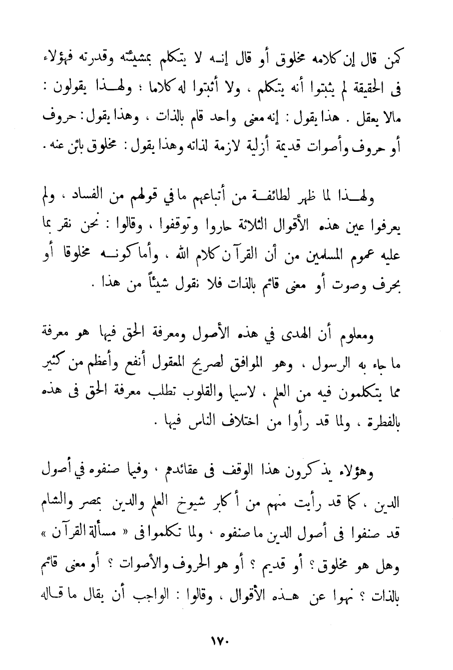 كَمَنْ قَالَ إنَّ كَلَامَهُ مَخْلُوقٌ أَوْ قَالَ إنَّهُ لَا يَتَكَلَّمُ بِمَشِيئَتِهِ وَقُدْرَتِهِ فَهَؤُلَاءِ فِي الْحَقِيقَةِ لَمْ يُثْبِتُوا أَنَّهُ يَتَكَلَّمُ وَلَا أَثْبَتُوا لَهُ كَلَامًا؛ وَلِهَذَا يَقُولُونَ: مَا لَا يَعْقِلُ. هَذَا يَقُولُ: إنَّهُ مَعْنًى وَاحِدٌ قَامَ بِالذَّاتِ وَهَذَا يَقُولُ: حُرُوفٌ أَوْ حُرُوفٌ وَأَصْوَاتٌ قَدِيمَةٌ أَزَلِيَّةٌ لَازِمَةٌ لِذَاتِهِ وَهَذَا يَقُولُ: مَخْلُوقٌ بَائِنٌ عَنْهُ. وَلِهَذَا لَمَّا ظَهَرَ لِطَائِفَةٍ مِنْ أَتْبَاعِهِمْ مَا فِي قَوْلِهِمْ مِنْ الْفَسَادِ وَلَمْ يَعْرِفُوا عَيْنَ هَذِهِ الْأَقْوَالِ الثَّلَاثَةِ حَارُوا وَتَوَقَّفُوا وَقَالُوا: نَحْنُ نُقِرُّ بِمَا عَلَيْهِ عُمُومُ الْمُسْلِمِينَ مِنْ أَنَّ الْقُرْآنَ كَلَامُ اللَّهِ وَأَمَّا كَوْنُهُ مَخْلُوقًا أَوْ بِحَرْفِ وَصَوْتٍ أَوْ مَعْنًى قَائِمٍ بِالذَّاتِ فَلَا نَقُولُ شَيْئًا مِنْ هَذَا. وَمَعْلُومٌ أَنَّ الْهُدَى فِي هَذِهِ الْأُصُولِ وَمَعْرِفَةُ الْحَقِّ فِيهَا هُوَ مَعْرِفَةُ مَا جَاءَ بِهِ الرَّسُولُ وَهُوَ الْمُوَافِقُ لِصَرِيحِ الْمَعْقُولِ أَنْفَعُ وَأَعْظَمُ مِنْ كَثِيرٍ مِمَّا يَتَكَلَّمُونَ فِيهِ مِنْ الْعِلْمِ لَا سِيَّمَا وَالْقُلُوبُ تَطْلُبُ مَعْرِفَةَ الْحَقِّ فِي هَذِهِ بِالْفِطْرَةِ وَلِمَا قَدْ رَأَوْا مِنْ اخْتِلَافِ النَّاسِ فِيهَا. وَهَؤُلَاءِ يَذْكُرُونَ هَذَا الْوَقْفَ فِي عَقَائِدِهِمْ وَفِيمَا صَنَّفُوهُ فِي أُصُولِ الدِّينِ كَمَا قَدْ رَأَيْت مِنْهُمْ مِنْ أَكَابِرِ شُيُوخِ الْعِلْمِ وَالدِّينِ بِمِصْرِ وَالشَّامِ قَدْ صَنَّفُوا فِي أُصُولِ الدِّينِ مَا صَنَّفُوهُ وَلَمَّا تَكَلَّمُوا فِي " مَسْأَلَةِ الْقُرْآنِ " وَهَلْ هُوَ مَخْلُوقٌ؟ أَوْ قَدِيمٌ؟ أَوْ هُوَ الْحُرُوفُ وَالْأَصْوَاتُ؟ أَوْ مَعْنًى قَائِمٌ بِالذَّاتِ؟ نَهَوْا عَنْ هَذِهِ الْأَقْوَالِ وَقَالُوا: الْوَاجِبُ أَنْ يُقَالَ مَا قَالَهُ