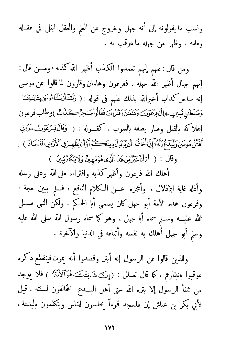 وَنَسَبَ مَا يَقُولُونَهُ إلَى أَنَّهُ جَهْلٌ وَخُرُوجٌ عَنْ الْعِلْمِ وَالْعَقْلِ اُبْتُلِيَ فِي عَقْلِهِ وَعِلْمِهِ وَظَهَرَ مِنْ جَهْلِهِ مَا عُوقِبَ بِهِ. وَمَنْ قَالَ عَنْهُمْ إنَّهُمْ تَعَمَّدُوا الْكَذِبَ أَظْهَرَ اللَّهُ كَذِبَهُ وَمَنْ قَالَ: إنَّهُمْ جُهَّالٌ أَظْهَرَ اللَّهُ جَهْلَهُ فَفِرْعَوْنُ وَهَامَانُ وَقَارُونُ لَمَّا قَالُوا عَنْ مُوسَى إنَّهُ سَاحِرٌ كَذَّابٌ أَخْبَرَ اللَّهُ بِذَلِكَ عَنْهُمْ فِي قَوْلِهِ: {وَلَقَدْ أَرْسَلْنَا مُوسَى بِآيَاتِنَا وَسُلْطَانٍ مُبِينٍ} {إلَى فِرْعَوْنَ وَهَامَانَ وَقَارُونَ فَقَالُوا سَاحِرٌ كَذَّابٌ} وَطَلَبَ فِرْعَوْنُ إهْلَاكَهُ بِالْقَتْلِ وَصَارَ يَصِفُهُ بِالْعُيُوبِ كَقَوْلِهِ: {وَقَالَ فِرْعَوْنُ ذَرُونِي أَقْتُلْ مُوسَى وَلْيَدْعُ رَبَّهُ إنِّي أَخَافُ أَنْ يُبَدِّلَ دِينَكُمْ أَوْ أَنْ يُظْهِرَ فِي الْأَرْضِ الْفَسَادَ} . وَقَالَ: {أَمْ أَنَا خَيْرٌ مِنْ هَذَا الَّذِي هُوَ مَهِينٌ وَلَا يَكَادُ يُبِينُ} أَهْلَكَ اللَّهُ فِرْعَوْنَ وَأَظْهَرَ كَذِبَهُ وَافْتِرَاءَهُ عَلَى اللَّهِ وَعَلَى رُسُلِهِ وَأَذَلَّهُ غَايَةَ الْإِذْلَالِ وَأَعْجَزَهُ عَنْ الْكَلَامِ النَّافِعِ؛ فَلَمْ يُبَيِّنْ حُجَّةً وَفِرْعَوْنُ هَذِهِ الْأُمَّةِ أَبُو جَهْلٍ كَانَ يُسَمَّى أَبَا الْحَكَمِ وَلَكِنَّ النَّبِيَّ صَلَّى اللَّهُ عَلَيْهِ وَسَلَّمَ سَمَّاهُ أَبَا جَهْلٍ وَهُوَ كَمَا سَمَّاهُ رَسُولُ اللَّهِ صَلَّى اللَّهُ عَلَيْهِ وَسَلَّمَ أَبُو جَهْلٍ أَهْلَكَ بِهِ نَفْسَهُ وَأَتْبَاعَهُ فِي الدُّنْيَا وَالْآخِرَةِ. وَاَلَّذِينَ قَالُوا عَنْ الرَّسُولِ إنَّهُ أَبْتَرُ وَقَصَدُوا أَنَّهُ يَمُوتُ فَيَنْقَطِعُ ذِكْرُهُ عُوقِبُوا بِانْبِتَارِهِمْ كَمَا قَالَ تَعَالَى: {إنَّ شَانِئَكَ هُوَ الْأَبْتَرُ} فَلَا يُوجَدُ مَنْ شَنَأَ الرَّسُولَ إلَّا بَتَرَهُ اللَّهُ حَتَّى أَهْلُ الْبِدَعِ الْمُخَالِفُونَ لِسُنَّتِهِ. قِيلَ لِأَبِي بَكْرِ بْنِ عَيَّاشٍ إنَّ بِالْمَسْجِدِ قَوْمًا يَجْلِسُونَ لِلنَّاسِ وَيَتَكَلَّمُونَ بِالْبِدْعَةِ