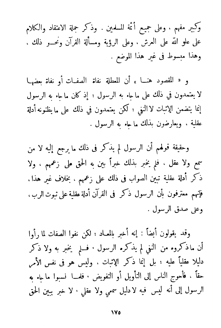 وَكَبِيرٍ مُفَهِّمٍ وَعَلَى جَمِيعِ أَئِمَّةِ الْمُسْلِمِينَ. وَذَكَرَ جُمْلَةَ الِاعْتِقَادِ وَالْكَلَامَ عَلَى عُلُوِّ اللَّهِ عَلَى الْعَرْشِ وَعَلَى الرُّؤْيَةِ وَمَسْأَلَةَ الْقُرْآنِ وَنَحْوَ ذَلِكَ وَهَذَا مَبْسُوطٌ فِي غَيْرِ هَذَا الْمَوْضِعِ. و " الْمَقْصُودُ هُنَا " أَنَّ الْمُعَطِّلَةَ نفاة الصِّفَاتِ أَوْ نفاة بَعْضِهَا لَا يَعْتَمِدُونَ فِي ذَلِكَ عَلَى مَا جَاءَ بِهِ الرَّسُولُ؛ إذْ كَانَ مَا جَاءَ بِهِ الرَّسُولُ إنَّمَا يَتَضَمَّنُ الْإِثْبَاتَ لَا النَّفْيَ؛ لَكِنْ يَعْتَمِدُونَ فِي ذَلِكَ عَلَى مَا يَظُنُّونَهُ أَدِلَّةً عَقْلِيَّةً وَيُعَارِضُونَ بِذَلِكَ مَا جَاءَ بِهِ الرَّسُولُ. وَحَقِيقَةُ قَوْلِهِمْ أَنَّ الرَّسُولَ لَمْ يَذْكُرْ فِي ذَلِكَ مَا يُرْجَعُ إلَيْهِ لَا مِنْ سَمْعٍ وَلَا عَقْلٍ فَلَمْ يُخْبِرْ بِذَلِكَ خَبَرًا بَيَّنَ بِهِ الْحَقَّ عَلَى زَعْمِهِمْ وَلَا ذَكَرَ أَدِلَّةً عَقْلِيَّةً تُبَيِّنُ الصَّوَابَ فِي ذَلِكَ عَلَى زَعْمِهِمْ بِخِلَافِ غَيْرِ هَذَا فَإِنَّهُمْ مُعْتَرِفُونَ بِأَنَّ الرَّسُولَ ذَكَرَ فِي الْقُرْآنِ أَدِلَّةً عَقْلِيَّةً عَلَى ثُبُوتِ الرَّبِّ وَعَلَى صِدْقِ الرَّسُولِ. وَقَدْ يَقُولُونَ أَيْضًا: إنَّهُ أَخْبَرَ بِالْمَعَادِ؛ لَكِنْ نَفَوْا الصِّفَاتِ لَمَّا رَأَوْا أَنَّ مَا ذَكَرُوهُ مِنْ النَّفْيِ لَمْ يَذْكُرْهُ الرَّسُولُ فَلَمْ يُخْبِرْ بِهِ وَلَا ذَكَرَ دَلِيلًا عَقْلِيًّا عَلَيْهِ؛ بَلْ إنَّمَا ذَكَرَ الْإِثْبَاتَ وَلَيْسَ هُوَ فِي نَفْسِ الْأَمْرِ حَقًّا فَأَحْوَجَ النَّاسَ إلَى التَّأْوِيلِ أَوْ التَّفْوِيضِ فَلَمَّا نَسَبُوا مَا جَاءَ بِهِ الرَّسُولُ إلَى أَنَّهُ لَيْسَ فِيهِ لَا دَلِيلٌ سَمْعِيٌّ وَلَا عَقْلِيٌّ، لَا خَبَرَ يُبَيِّنُ الْحَقَّ وَلَا