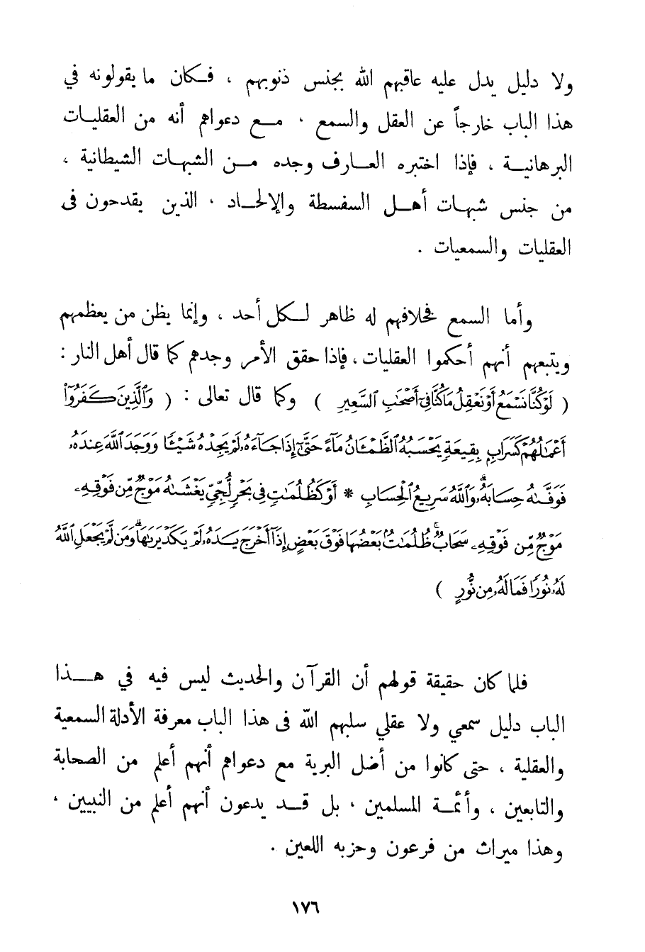 دَلِيلَ يَدُلُّ عَلَيْهِ عَاقَبَهُمْ اللَّهُ بِجِنْسِ ذُنُوبِهِمْ فَكَانَ مَا يَقُولُونَهُ فِي هَذَا الْبَابِ خَارِجًا عَنْ الْعَقْلِ وَالسَّمْعِ مَعَ دَعْوَاهُمْ أَنَّهُ مِنْ الْعَقْلِيَّاتِ الْبُرْهَانِيَّةِ فَإِذَا اخْتَبَرَهُ الْعَارِفُ وَجَدَهُ مِنْ الشُّبُهَاتِ الشَّيْطَانِيَّةِ مِنْ جِنْسِ شُبُهَاتِ أَهْلِ السَّفْسَطَةِ وَالْإِلْحَادِ الَّذِينَ يَقْدَحُونَ فِي الْعَقْلِيَّاتِ وَالسَّمْعِيَّاتِ. وَأَمَّا السَّمْعُ فَخِلَافُهُمْ لَهُ ظَاهِرٌ لِكُلِّ أَحَدٍ وَإِنَّمَا يَظُنُّ مَنْ يُعَظِّمُهُمْ وَيَتْبَعُهُمْ أَنَّهُمْ أَحْكَمُوا الْعَقْلِيَّاتِ فَإِذَا حَقَّقَ الْأَمْرَ وَجَدَهُمْ كَمَا قَالَ أَهْلُ النَّارِ: {لَوْ كُنَّا نَسْمَعُ أَوْ نَعْقِلُ مَا كُنَّا فِي أَصْحَابِ السَّعِيرِ} وَكَمَا قَالَ تَعَالَى: {وَالَّذِينَ كَفَرُوا أَعْمَالُهُمْ كَسَرَابٍ بِقِيعَةٍ يَحْسَبُهُ الظَّمْآنُ مَاءً حَتَّى إذَا جَاءَهُ لَمْ يَجِدْهُ شَيْئًا وَوَجَدَ اللَّهَ عِنْدَهُ فَوَفَّاهُ حِسَابَهُ وَاللَّهُ سَرِيعُ الْحِسَابِ} {أَوْ كَظُلُمَاتٍ فِي بَحْرٍ لُجِّيٍّ يَغْشَاهُ مَوْجٌ مِنْ فَوْقِهِ مَوْجٌ مِنْ فَوْقِهِ سَحَابٌ ظُلُمَاتٌ بَعْضُهَا فَوْقَ بَعْضٍ إذَا أَخْرَجَ يَدَهُ لَمْ يَكَدْ يَرَاهَا وَمَنْ لَمْ يَجْعَلِ اللَّهُ لَهُ نُورًا فَمَا لَهُ مِنْ نُورٍ} فَلَمَّا كَانَ حَقِيقَةُ قَوْلِهِمْ إنَّ الْقُرْآنَ وَالْحَدِيثَ لَيْسَ فِيهِ فِي هَذَا الْبَابِ دَلِيلٌ سَمْعِيٌّ وَلَا عَقْلِيٌّ سَلَبَهُمْ اللَّهُ فِي هَذَا الْبَابِ مَعْرِفَةَ الْأَدِلَّةِ السَّمْعِيَّةِ وَالْعَقْلِيَّةِ حَتَّى كَانُوا مِنْ أَضَلِّ الْبَرِيَّةِ مَعَ دَعْوَاهُمْ أَنَّهُمْ أَعْلَمُ مِنْ الصَّحَابَةِ وَالتَّابِعِينَ وَأَئِمَّةِ الْمُسْلِمِينَ بَلْ قَدْ يَدَّعُونَ أَنَّهُمْ أَعْلَمُ مِنْ النَّبِيِّينَ وَهَذَا مِيرَاثٌ مِنْ فِرْعَوْنَ وَحِزْبِهِ اللَّعِينِ.