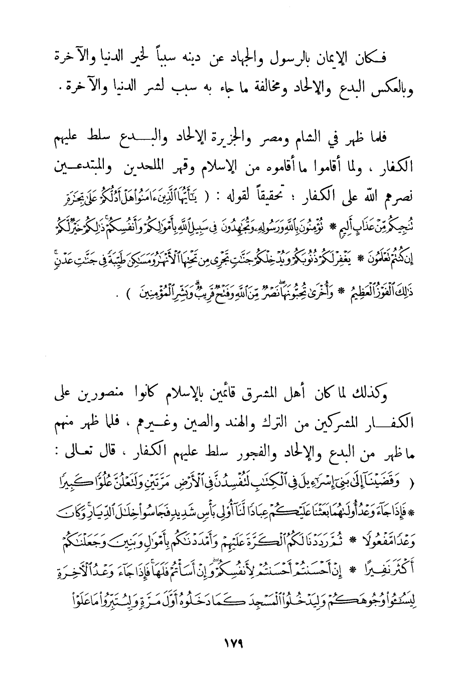 فَكَانَ الْإِيمَانُ بِالرَّسُولِ وَالْجِهَادُ عَنْ دِينِهِ سَبَبًا لِخَيْرِ الدُّنْيَا وَالْآخِرَةِ وَبِالْعَكْسِ الْبِدَعُ وَالْإِلْحَادُ وَمُخَالَفَةُ مَا جَاءَ بِهِ سَبَبٌ لِشَرِّ الدُّنْيَا وَالْآخِرَةِ. فَلَمَّا ظَهَرَ فِي الشَّامِ وَمِصْرَ وَالْجَزِيرَةِ الْإِلْحَادُ وَالْبِدَعُ سُلِّطَ عَلَيْهِمْ الْكُفَّارُ وَلَمَّا أَقَامُوا مَا أَقَامُوهُ مِنْ الْإِسْلَامِ وَقَهْرِ الْمُلْحِدِينَ وَالْمُبْتَدِعِينَ نَصَرَهُمْ اللَّهُ عَلَى الْكُفَّارِ؛ تَحْقِيقًا لِقَوْلِهِ: {يَا أَيُّهَا الَّذِينَ آمَنُوا هَلْ أَدُلُّكُمْ عَلَى تِجَارَةٍ تُنْجِيكُمْ مِنْ عَذَابٍ أَلِيمٍ} {تُؤْمِنُونَ بِاللَّهِ وَرَسُولِهِ وَتُجَاهِدُونَ فِي سَبِيلِ اللَّهِ بِأَمْوَالِكُمْ وَأَنْفُسِكُمْ ذَلِكُمْ خَيْرٌ لَكُمْ إنْ كُنْتُمْ تَعْلَمُونَ} {يَغْفِرْ لَكُمْ ذُنُوبَكُمْ وَيُدْخِلْكُمْ جَنَّاتٍ تَجْرِي مِنْ تَحْتِهَا الْأَنْهَارُ وَمَسَاكِنَ طَيِّبَةً فِي جَنَّاتِ عَدْنٍ ذَلِكَ الْفَوْزُ الْعَظِيمُ} {وَأُخْرَى تُحِبُّونَهَا نَصْرٌ مِنَ اللَّهِ وَفَتْحٌ قَرِيبٌ وَبَشِّرِ الْمُؤْمِنِينَ} . وَكَذَلِكَ لَمَّا كَانَ أَهْلُ الْمَشْرِقِ قَائِمِينَ بِالْإِسْلَامِ كَانُوا مَنْصُورِينَ عَلَى الْكُفَّارِ الْمُشْرِكِينَ مِنْ التُّرْكِ وَالْهِنْدِ وَالصِّينِ وَغَيْرِهِمْ فَلَمَّا ظَهَرَ مِنْهُمْ مَا ظَهَرَ مِنْ الْبِدَعِ وَالْإِلْحَادِ وَالْفُجُورِ سُلِّطَ عَلَيْهِمْ الْكُفَّارُ قَالَ تَعَالَى: {وَقَضَيْنَا إلَى بَنِي إسْرائِيلَ فِي الْكِتَابِ لَتُفْسِدُنَّ فِي الْأَرْضِ مَرَّتَيْنِ وَلَتَعْلُنَّ عُلُوًّا كَبِيرًا} {فَإِذَا جَاءَ وَعْدُ أُولَاهُمَا بَعَثْنَا عَلَيْكُمْ عِبَادًا لَنَا أُولِي بَأْسٍ شَدِيدٍ فَجَاسُوا خِلَالَ الدِّيَارِ وَكَانَ وَعْدًا مَفْعُولًا} {ثُمَّ رَدَدْنَا لَكُمُ الْكَرَّةَ عَلَيْهِمْ وَأَمْدَدْنَاكُمْ بِأَمْوَالٍ وَبَنِينَ وَجَعَلْنَاكُمْ أَكْثَرَ نَفِيرًا} {إنْ أَحْسَنْتُمْ أَحْسَنْتُمْ لِأَنْفُسِكُمْ وَإِنْ أَسَأْتُمْ فَلَهَا فَإِذَا جَاءَ وَعْدُ الْآخِرَةِ