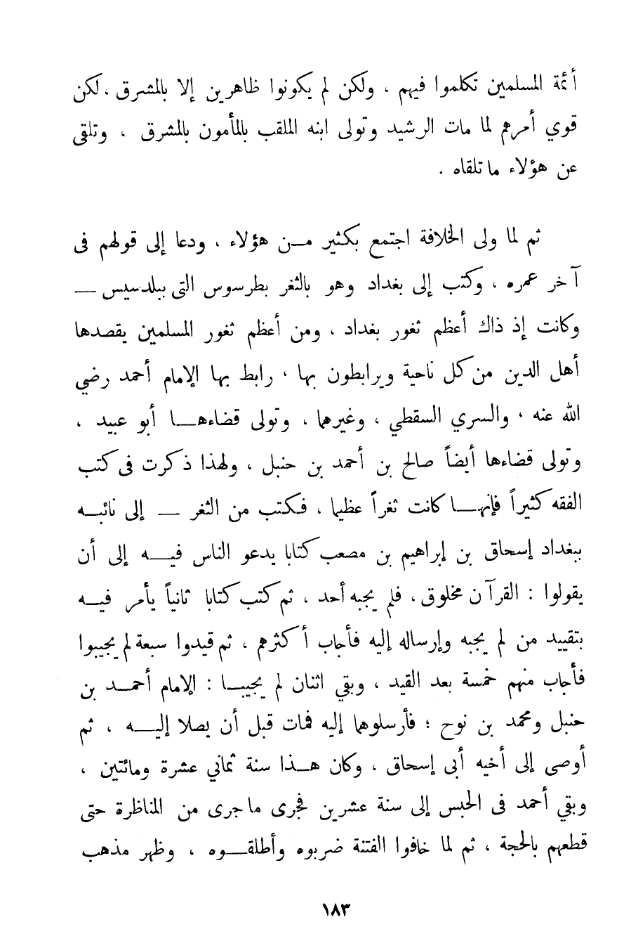 أَئِمَّةِ الْمُسْلِمِينَ تَكَلَّمُوا فِيهِمْ وَلَكِنْ لَمْ يَكُونُوا ظَاهِرِينَ إلَّا بِالْمَشْرِقِ لَكِنْ قَوِيَ أَمْرُهُمْ لَمَّا مَاتَ الرَّشِيدُ وَتَوَلَّى ابْنُهُ الْمُلَقَّبُ بِالْمَأْمُونِ بِالْمَشْرِقِ وَتَلَقَّى عَنْ هَؤُلَاءِ مَا تَلَقَّاهُ. ثُمَّ لَمَّا وَلِيَ الْخِلَافَةَ اجْتَمَعَ بِكَثِيرِ مِنْ هَؤُلَاءِ وَدَعَا إلَى قَوْلِهِمْ فِي آخِرِ عُمْرِهِ وَكَتَبَ إلَى بَغْدَادَ وَهُوَ بِالثَّغْرِ بطرسوس الَّتِي بِبَلَدِ سِيسَ - وَكَانَتْ إذْ ذَاكَ أَعْظَمَ ثُغُورِ بَغْدَادَ وَمِنْ أَعْظَمِ ثُغُورِ الْمُسْلِمِينَ يَقْصِدُهَا أَهْلُ الدِّينِ مِنْ كُلِّ نَاحِيَةٍ وَيُرَابِطُونَ بِهَا رَابَطَ بِهَا الْإِمَامُ أَحْمَد بْنُ حَنْبَلٍ رَضِيَ اللَّهُ عَنْهُ وَالسَّرِيُّ السقطي وَغَيْرُهُمَا وَتَوَلَّى قَضَاءَهَا أَبُو عُبَيْدٍ وَتَوَلَّى قَضَاءَهَا أَيْضًا صَالِحُ بْنُ أَحْمَد بْنِ حَنْبَلٍ وَلِهَذَا ذُكِرَتْ فِي كُتُبِ الْفِقْهِ كَثِيرًا فَإِنَّهَا كَانَتْ ثَغْرًا عَظِيمًا فَكَتَبَ مِنْ الثَّغْرِ - إلَى نَائِبِهِ بِبَغْدَادَ إسْحَاقَ بْنِ إبْرَاهِيمَ بْنِ مُصْعَبٍ كِتَابًا يَدْعُو النَّاسَ فِيهِ إلَى أَنْ يَقُولُوا: الْقُرْآنُ مَخْلُوقٌ فَلَمْ يُجِبْهُ أَحَدٌ ثُمَّ كَتَبَ كِتَابًا ثَانِيًا يَأْمُرُ فِيهِ بِتَقْيِيدِ مَنْ لَمْ يُجِبْهُ وَإِرْسَالِهِ إلَيْهِ فَأَجَابَ أَكْثَرُهُمْ ثُمَّ قَيَّدُوا سَبْعَةً لَمْ يُجِيبُوا فَأَجَابَ مِنْهُمْ خَمْسَةٌ بَعْدَ الْقَيْدِ وَبَقِيَ اثْنَانِ لَمْ يُجِيبَا: الْإِمَامُ أَحْمَد بْنُ حَنْبَلٍ وَمُحَمَّدُ بْنُ نُوحٍ؛ فَأَرْسَلُوهُمَا إلَيْهِ فَمَاتَ قَبْلَ أَنْ يَصِلَا إلَيْهِ ثُمَّ أَوْصَى إلَى أَخِيهِ أَبِي إسْحَاقَ وَكَانَ هَذَا سَنَةَ ثَمَانِي عَشْرَةَ وَمِائَتَيْنِ وَبَقِيَ أَحْمَد بْنُ حَنْبَلٍ فِي الْحَبْسِ إلَى سَنَةِ عِشْرِينَ فَجَرَى مَا جَرَى مِنْ الْمُنَاظَرَةِ حَتَّى قَطَعَهُمْ بِالْحُجَّةِ ثُمَّ لَمَّا خَافُوا الْفِتْنَةَ ضَرَبُوهُ وَأَطْلَقُوهُ وَظَهَرَ مَذْهَبُ