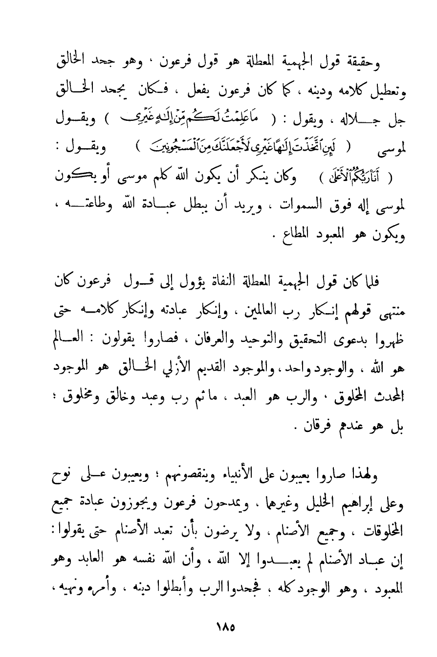 وَحَقِيقَةُ قَوْلِ الْجَهْمِيَّة الْمُعَطِّلَةِ هُوَ قَوْلُ فِرْعَوْنَ وَهُوَ جَحْدُ الْخَالِقِ وَتَعْطِيلُ كَلَامِهِ وَدِينِهِ كَمَا كَانَ فِرْعَوْنُ يَفْعَلُ فَكَانَ يَجْحَدُ الْخَالِقَ جَلَّ جَلَالُهُ وَيَقُولُ: {مَا عَلِمْتُ لَكُمْ مِنْ إلَهٍ غَيْرِي} وَيَقُولُ لِمُوسَى {لَئِنِ اتَّخَذْتَ إلَهًا غَيْرِي لَأَجْعَلَنَّكَ مِنَ الْمَسْجُونِينَ} وَيَقُولُ: {أَنَا رَبُّكُمُ الْأَعْلَى} وَكَانَ يُنْكِرُ أَنْ يَكُونَ اللَّهُ كَلَّمَ مُوسَى أَوْ يَكُونَ لِمُوسَى إلَهٌ فَوْقَ السَّمَوَاتِ وَيُرِيدُ أَنْ يُبْطِلَ عِبَادَةَ اللَّهِ وَطَاعَتَهُ وَيَكُونَ هُوَ الْمَعْبُودَ الْمُطَاعَ. فَلَمَّا كَانَ قَوْلُ الْجَهْمِيَّة الْمُعَطِّلَةِ الْنُّفَاةِ يَئُولُ إلَى قَوْلِ فِرْعَوْنَ كَانَ مُنْتَهَى قَوْلِهِمْ إنْكَارَ رَبِّ الْعَالَمِينَ وَإِنْكَارَ عِبَادَتِهِ وَإِنْكَارَ كَلَامِهِ حَتَّى ظَهَرُوا بِدَعْوَى التَّحْقِيقِ وَالتَّوْحِيدِ وَالْعِرْفَانِ فَصَارُوا يَقُولُونَ: الْعَالَمُ هُوَ اللَّهُ وَالْوُجُودُ وَاحِدٌ وَالْمَوْجُودُ الْقَدِيمُ الْأَزَلِيُّ الْخَالِقُ هُوَ الْمَوْجُودُ الْمُحْدَثُ الْمَخْلُوقُ وَالرَّبُّ هُوَ الْعَبْدُ مَا ثَمَّ رَبٌّ وَعَبْدٌ وَخَالِقٌ وَمَخْلُوقٌ؛ بَلْ هُوَ عِنْدَهُمْ فُرْقَانٌ. وَلِهَذَا صَارُوا يَعِيبُونَ عَلَى الْأَنْبِيَاءِ وَيُنْقِصُونَهُمْ؛ وَيَعِيبُونَ عَلَى نُوحٍ وَعَلَى إبْرَاهِيمَ الْخَلِيلِ وَغَيْرِهِمَا وَيَمْدَحُونَ فِرْعَوْنَ وَيُجَوِّزُونَ عِبَادَةَ جَمِيعِ الْمَخْلُوقَاتِ وَجَمِيعِ الْأَصْنَامِ وَلَا يَرْضَوْنَ بِأَنْ تُعْبَدَ الْأَصْنَامُ حَتَّى يَقُولُوا: إنَّ عُبَّادَ الْأَصْنَامِ لَمْ يَعْبُدُوا إلَّا اللَّهَ وَأَنَّ اللَّهَ نَفْسَهُ هُوَ الْعَابِدُ وَهُوَ الْمَعْبُودُ وَهُوَ الْوُجُودُ كُلُّهُ فَجَحَدُوا الرَّبَّ وَأَبْطَلُوا دِينَهُ وَأَمْرَهُ وَنَهْيَهُ